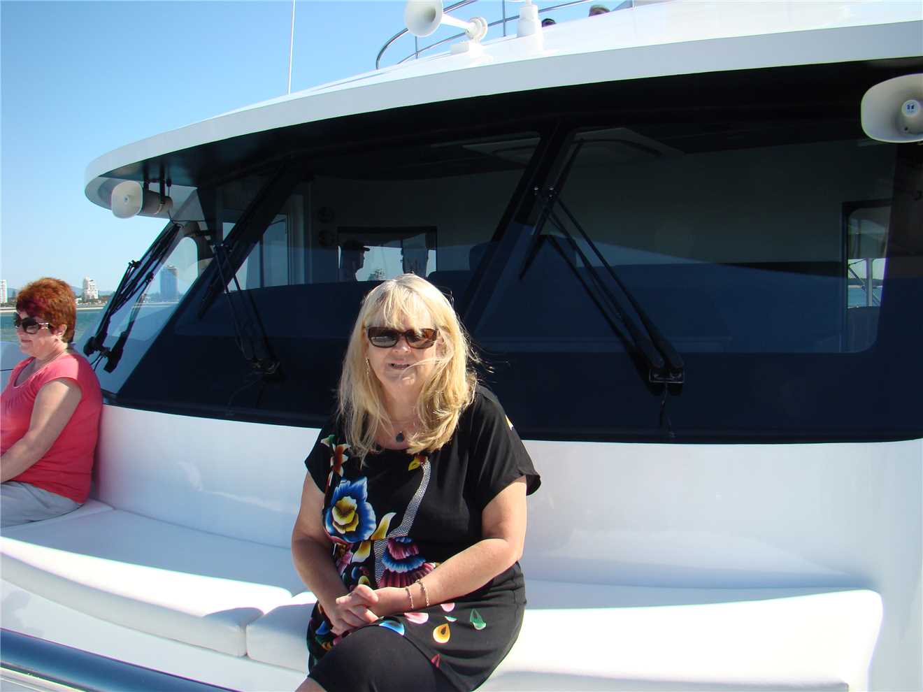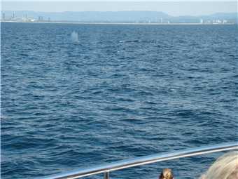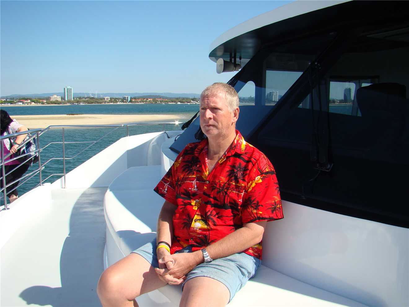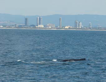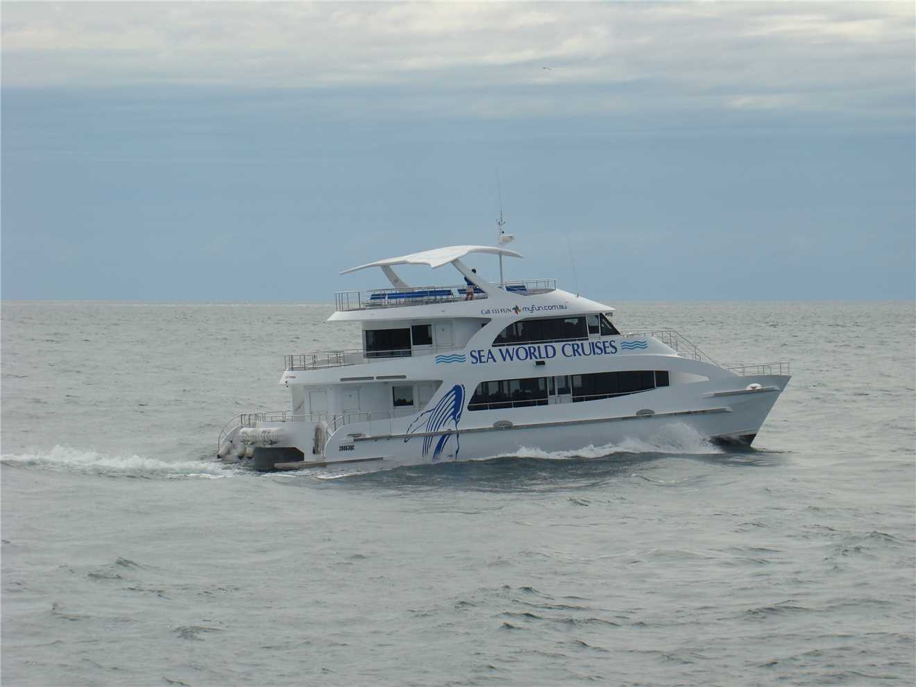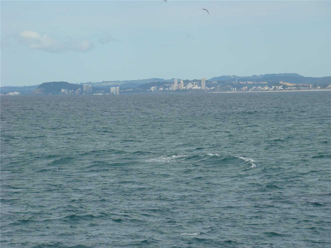 there, boarding was at 9:45am. We were about the 4th couple aboard the SS Minnow aka SS Seaworld, as we were walking up the gangway, we had our photo taken, I can't post it here as I need to scan it. We left at 10am sharp and we could walk around the boat until we were in the Gold Coast Seaway where it is a maritime law that we must stay seated inside, until we have exited the seaway. The boat is a 80ft long by 30ft wide, 3 level Catamaran built in 2008 at a cost $3.5m, it is spotlessly clean, just a fantastic boat and tour, well worth the $99 for 2.5 hours except we paid $77 using our over 50s Senior card. We found 2 large hump back whales and drifted around them for most of our trip. One of them did a magnificent breach (jumped out of the water) with a monstrous splash, but no one caught it on film. Bugger.