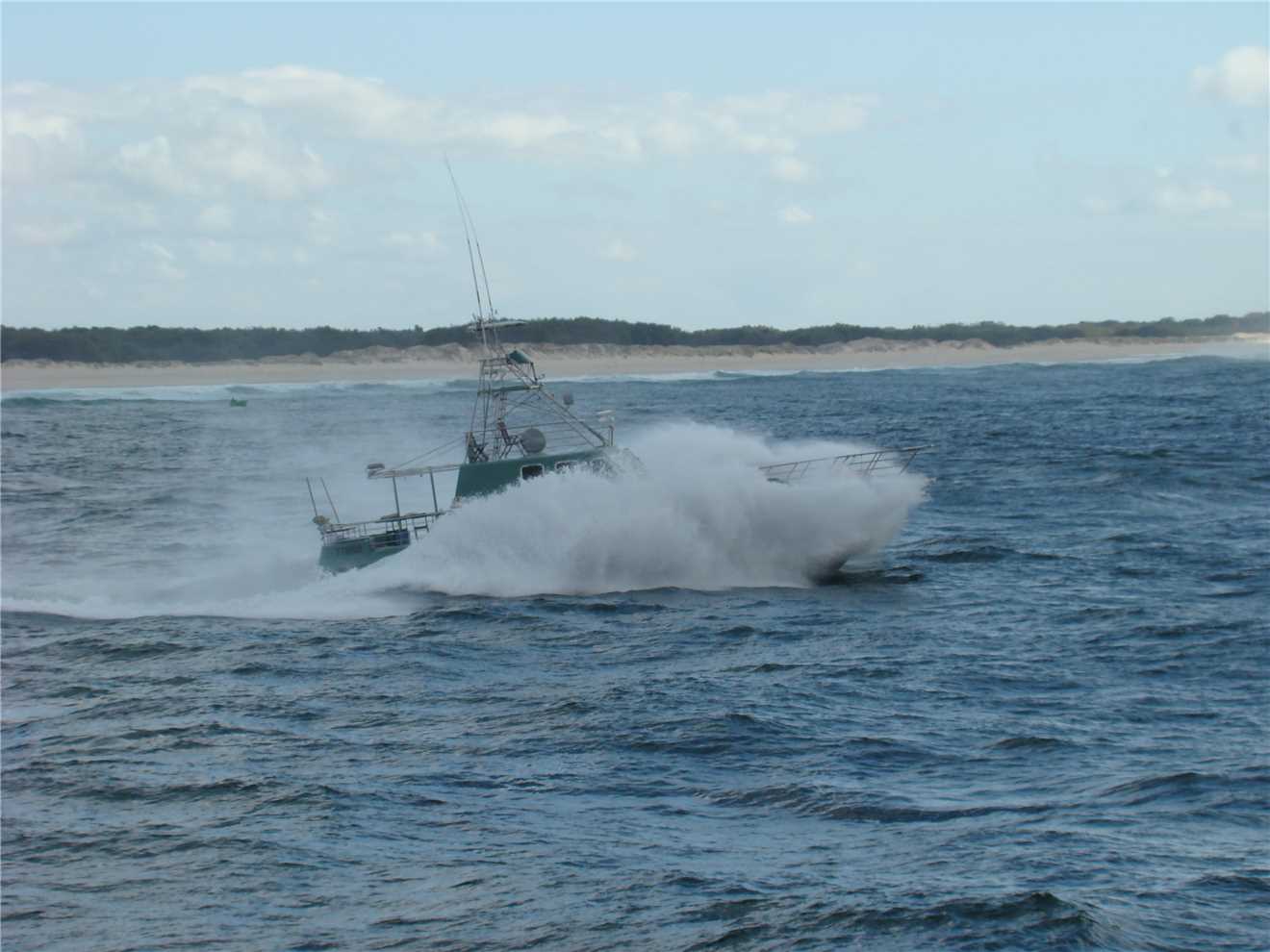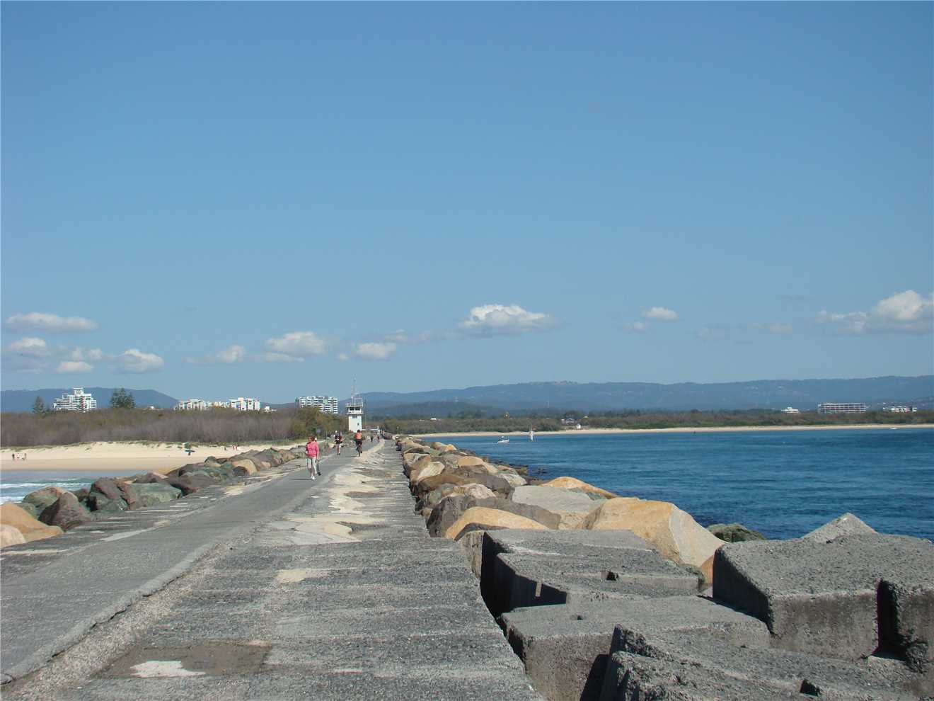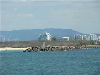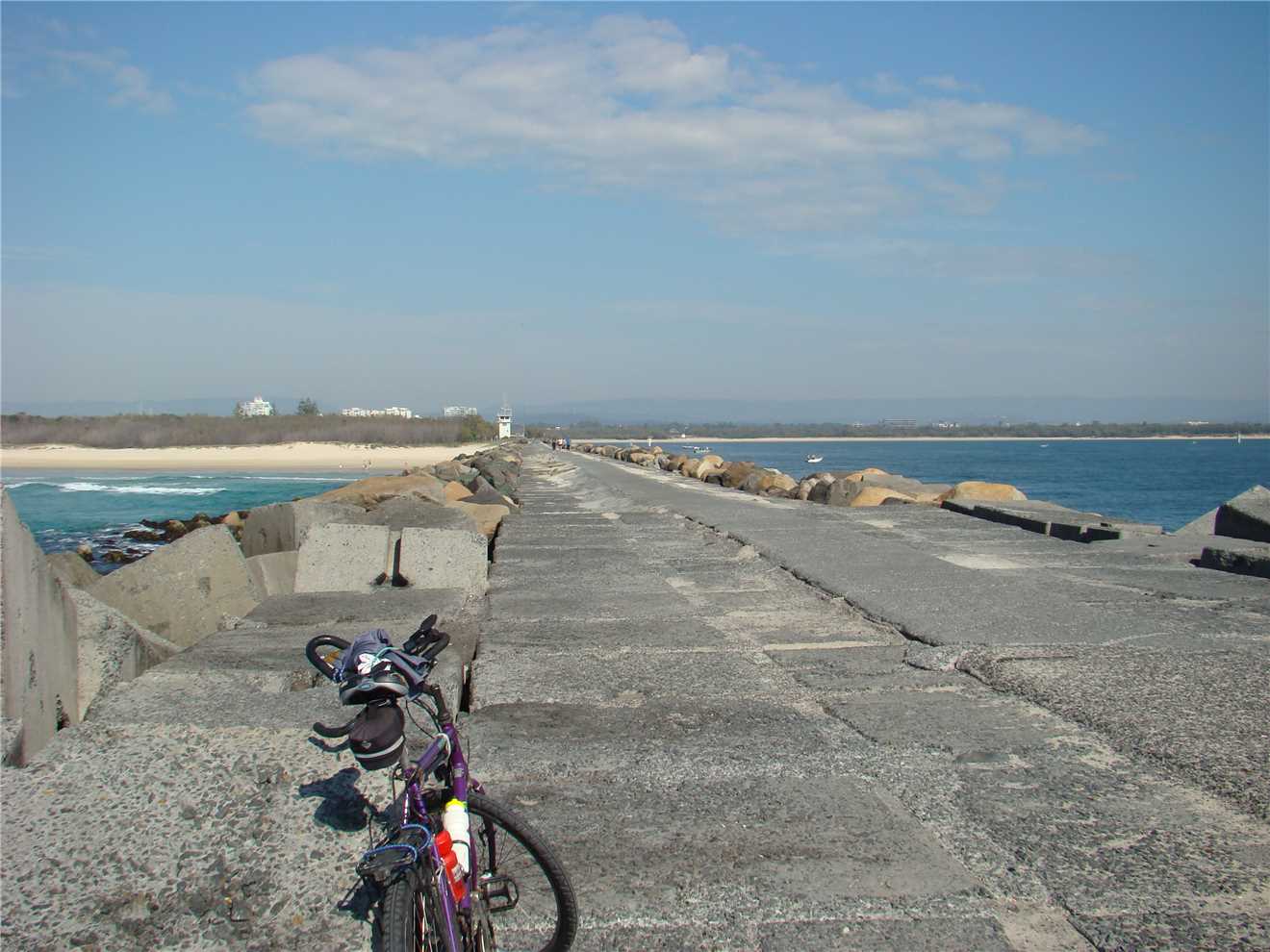 Today, I rode out to the Gold Coast Seaway, as normal, the weather was warm, windy and beautiful. There is a magnificent yacht moored at Southport YC which I am trying to find out about. The strong NW offshore breeze kept the waves low, also while I was out on the seaway, Port Frederick the barge made its way south towards Burleigh Heads. On the way back to camp, I stopped off at Mariner's Cove and checked out the Paradise Jet Boating, this outfit looks pretty good, I think that Marg, Luke and I will probably go jet boating over the next 3 weekends.