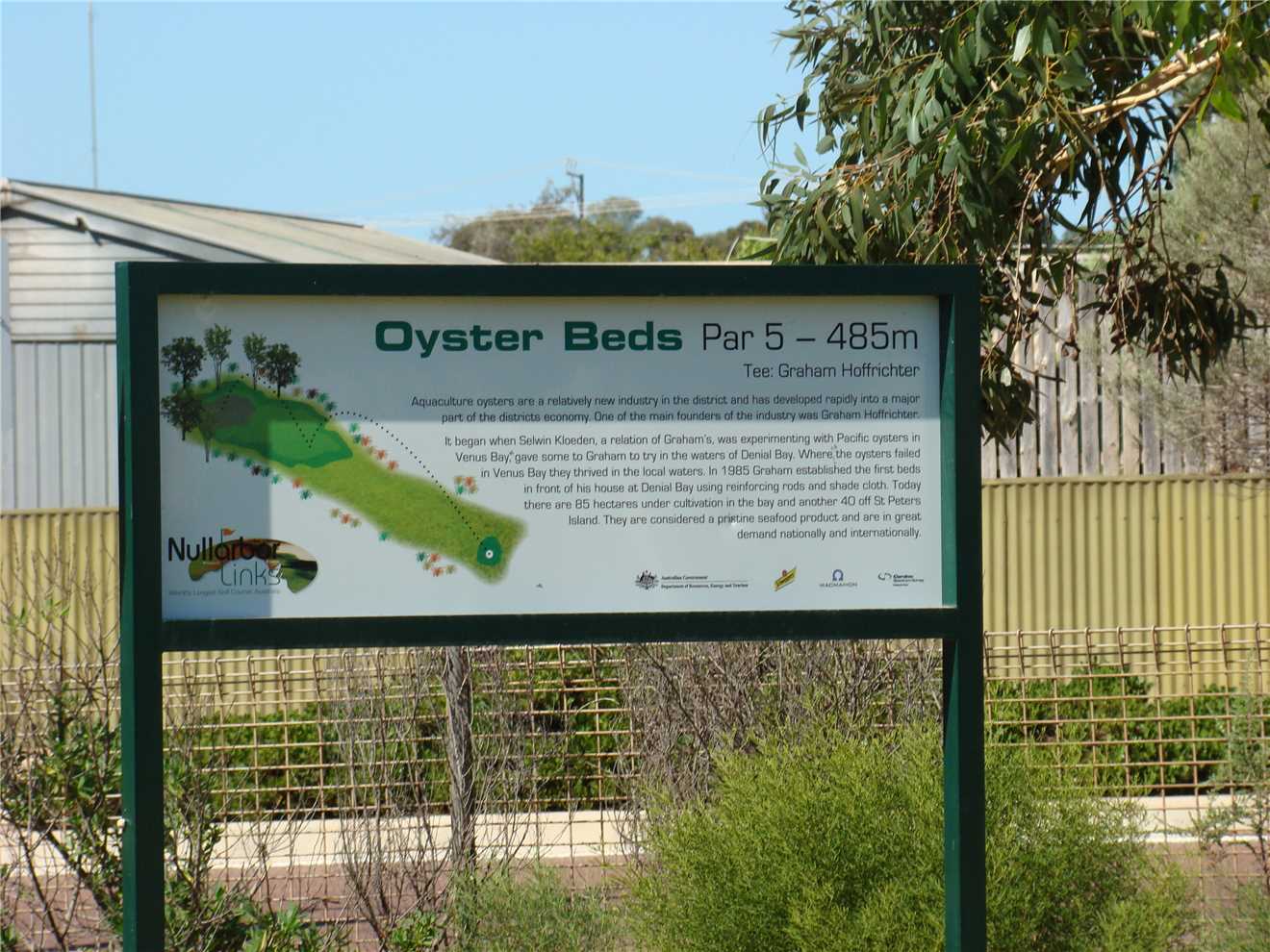 - Hole 1 is called Oyster Beds and it is a monster par 5 485 meters. With my bag of clubs, well actually only 2 clubs, a 3 iron and a putter and