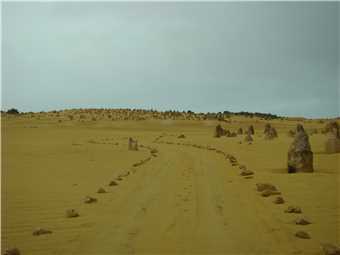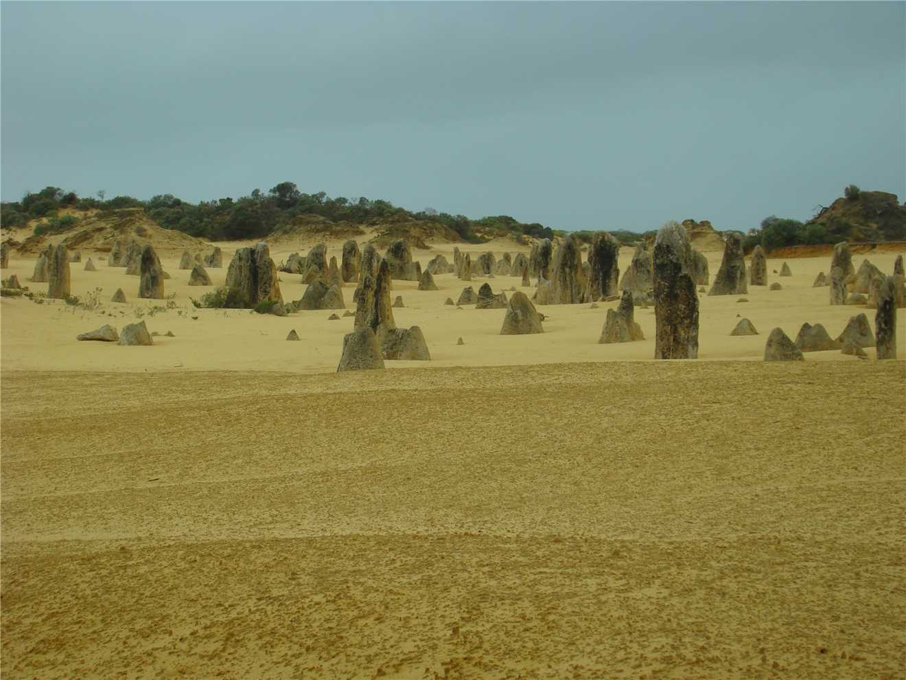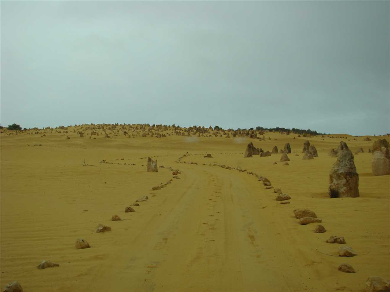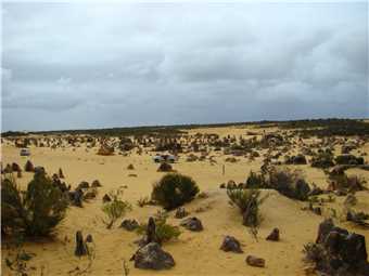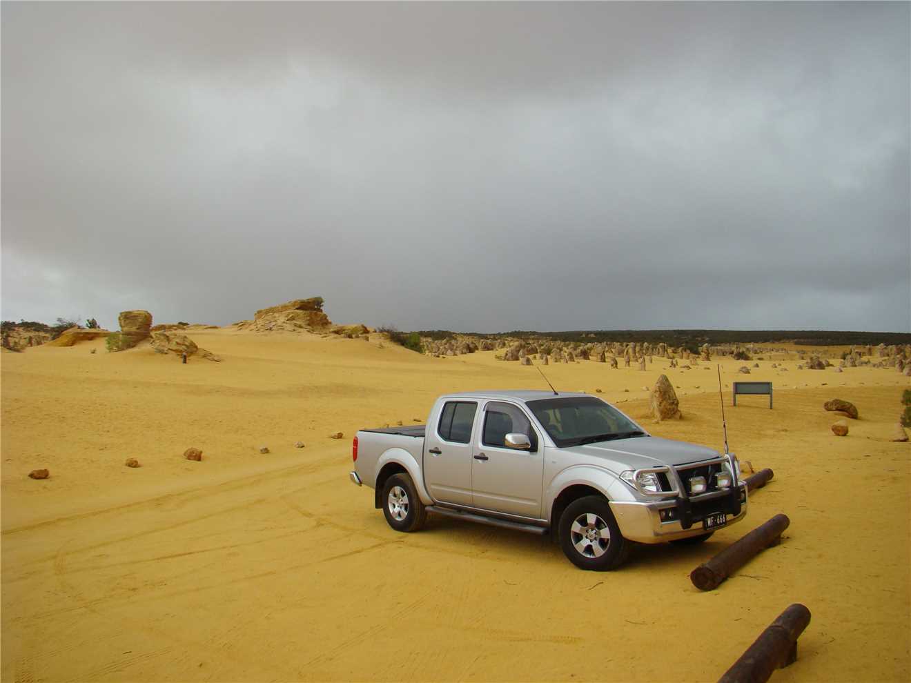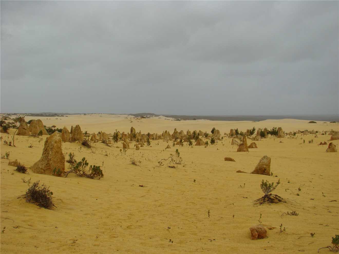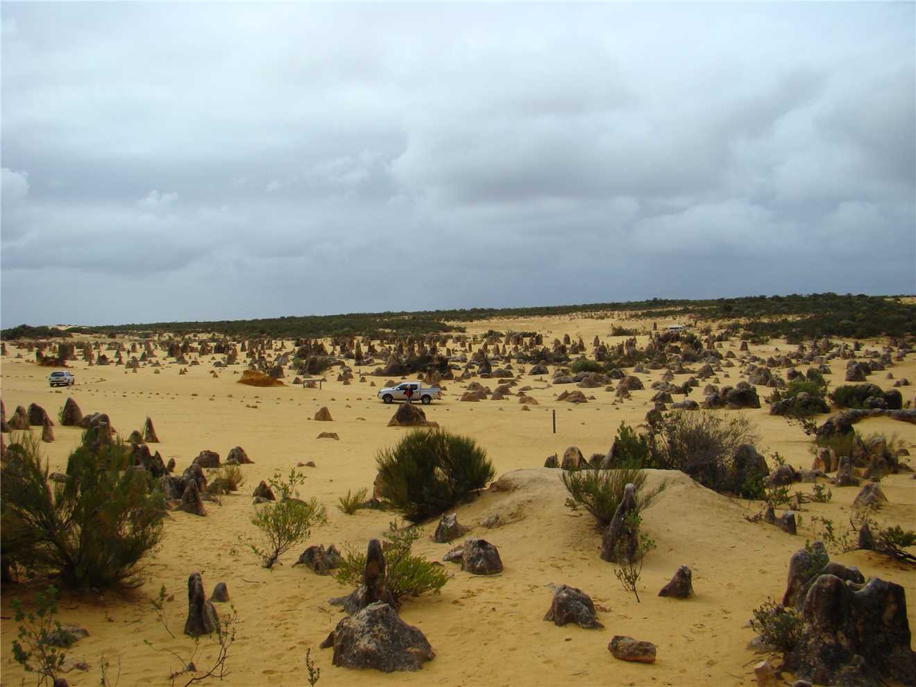 I awoke about 6:30am to wind and rain. We stayed inside until about 11am, then headed the 20kms out to the Pinnacles. We paid the $11 per vehicle for entry into the Nambung NP. There is a discovery centre and you can drive the 3km drive or walk it. As it was a shit day, we drove. The Pinnacles are rock formations, the landscape looks brilliant, we were rapt that we saw them, even though the weather was rough. Between rain squalls, we walked around the shapes. There was also a cache in The Pinnacles, but we couldn't find it.