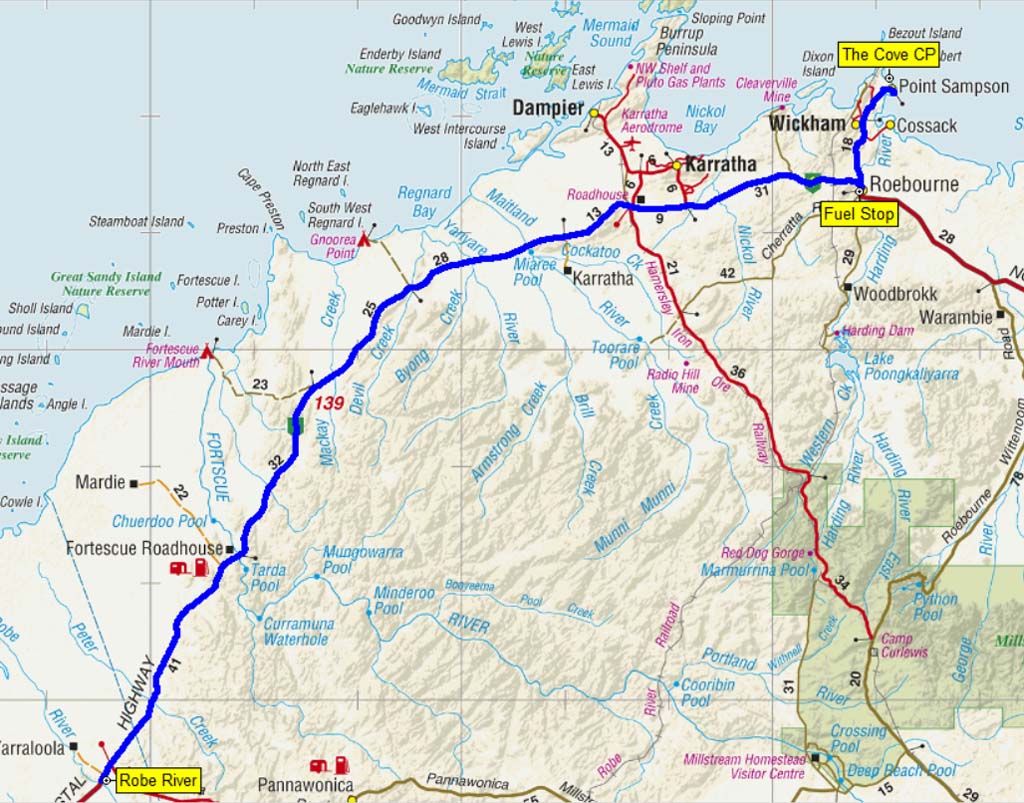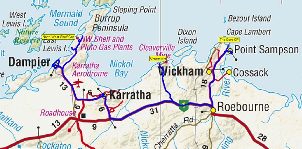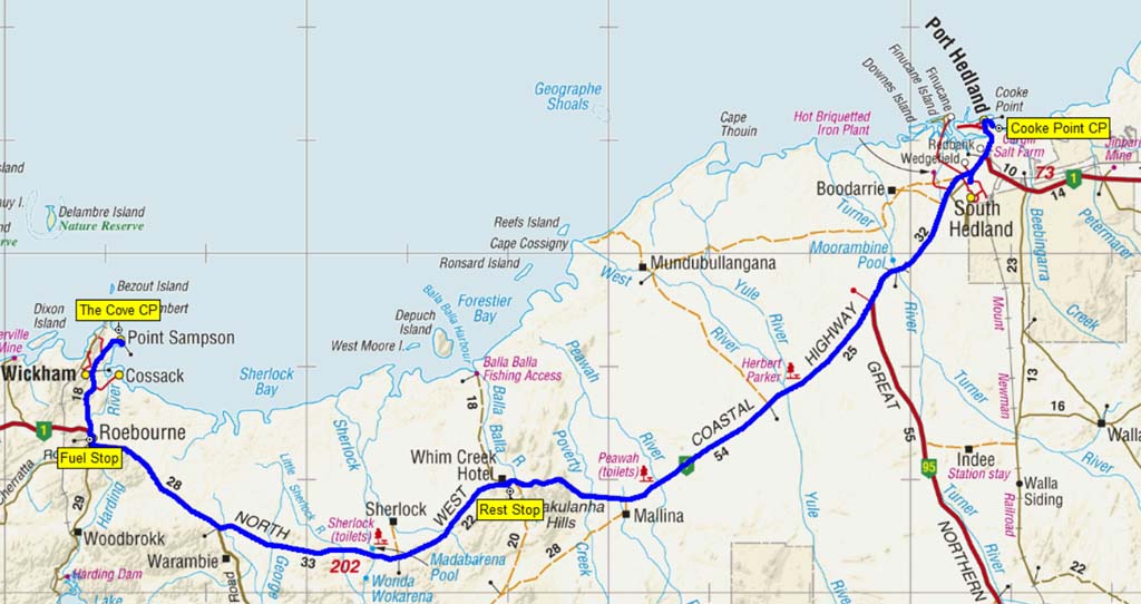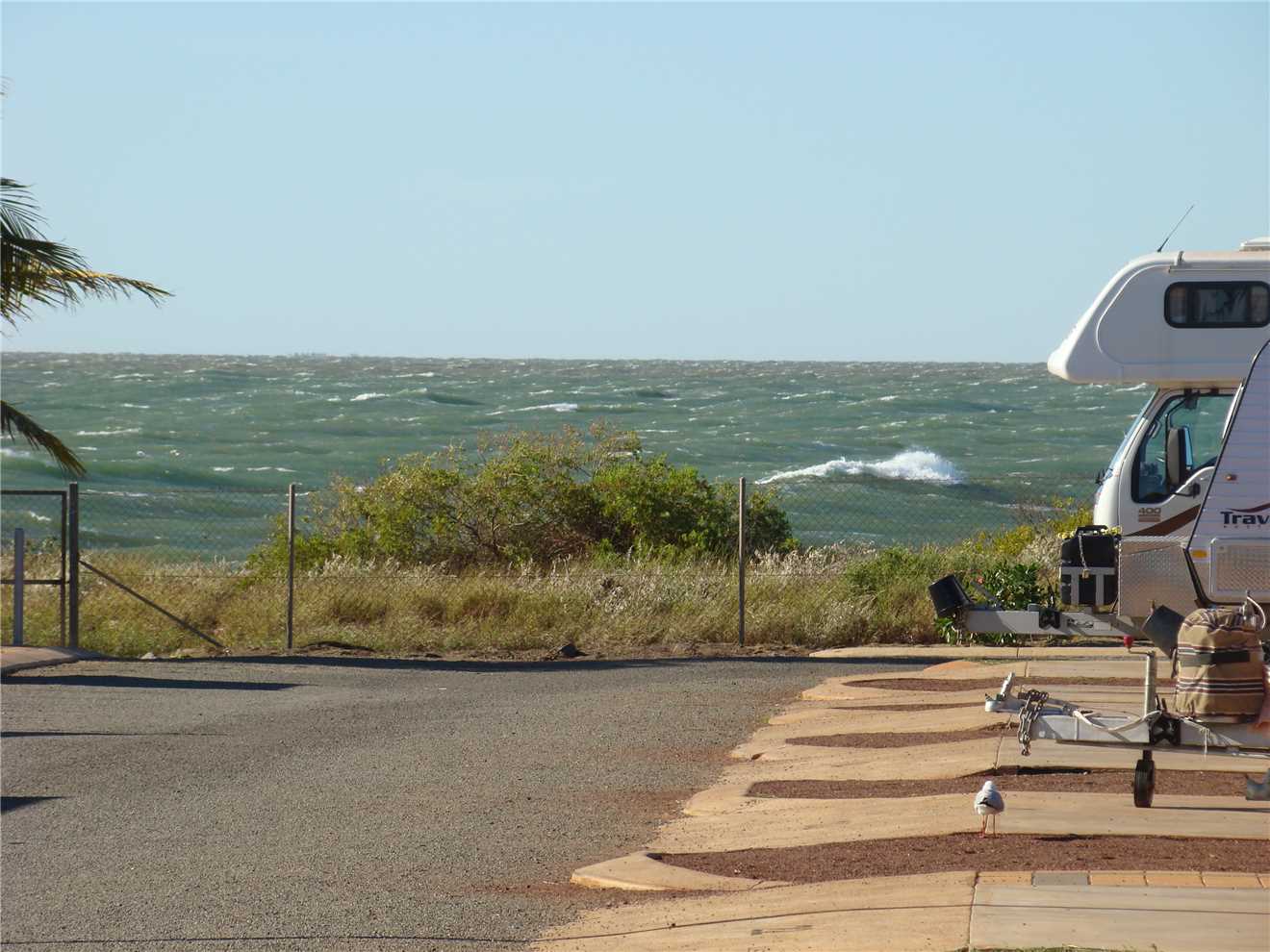 The scenery along the way was beautiful as usual with a few mines dotted here and there, there were 2 gas operations and a couple of quarries. We stopped at Roebourne for fuel and then drove the final 20kms to The Cove CP at Point Samson. This caravan park is one of the better parks that we have stayed at. The park is setup beautifully and each site has a large slab to park your van on and nice dark gravel to park your car and/or awning. I setup the satellite dish on the gravel behind the mighty Navara.