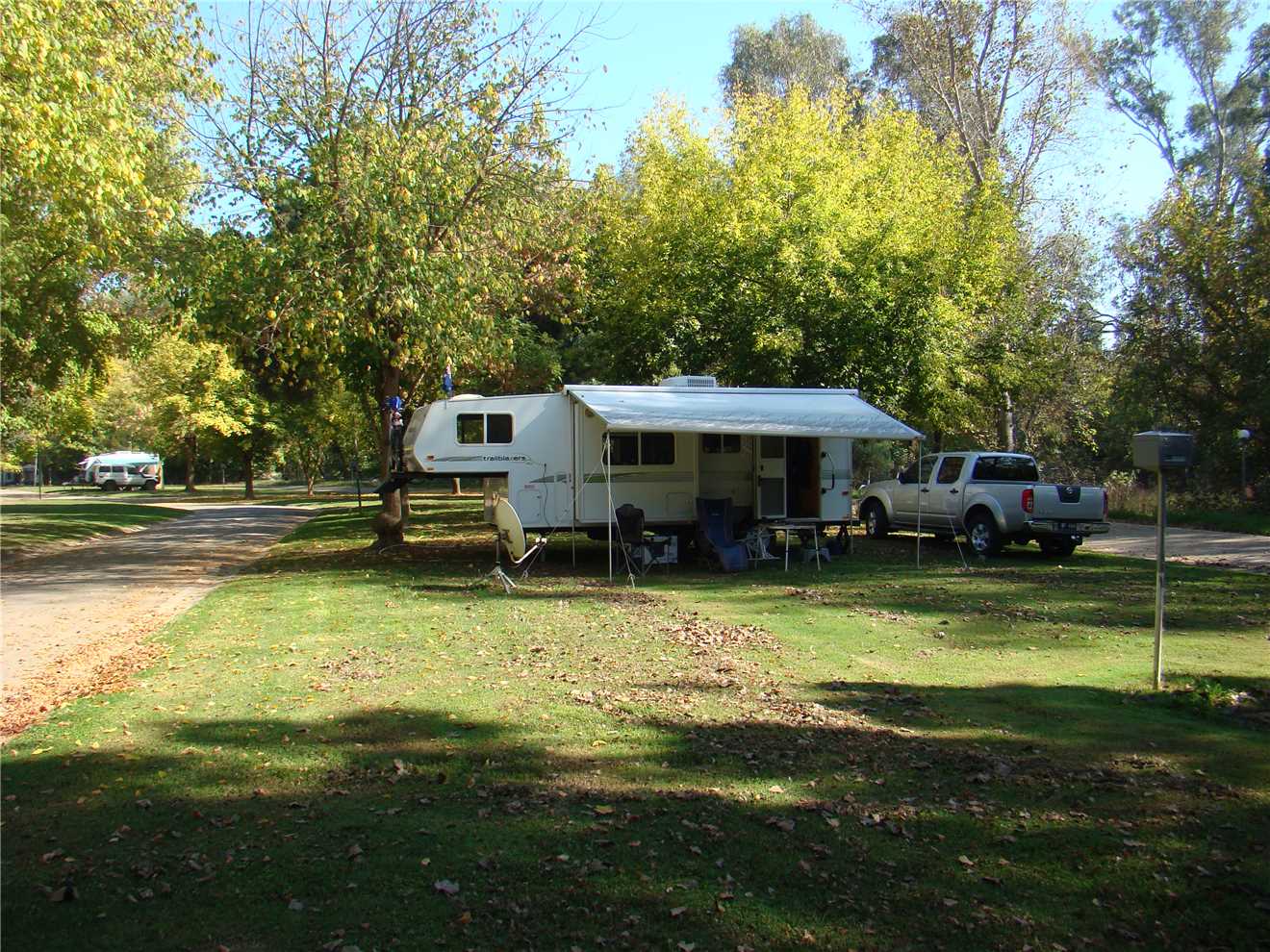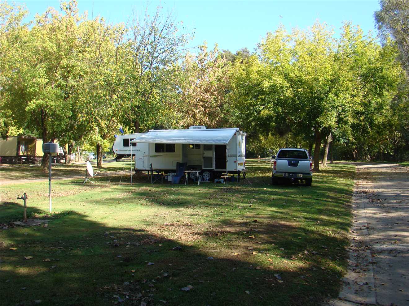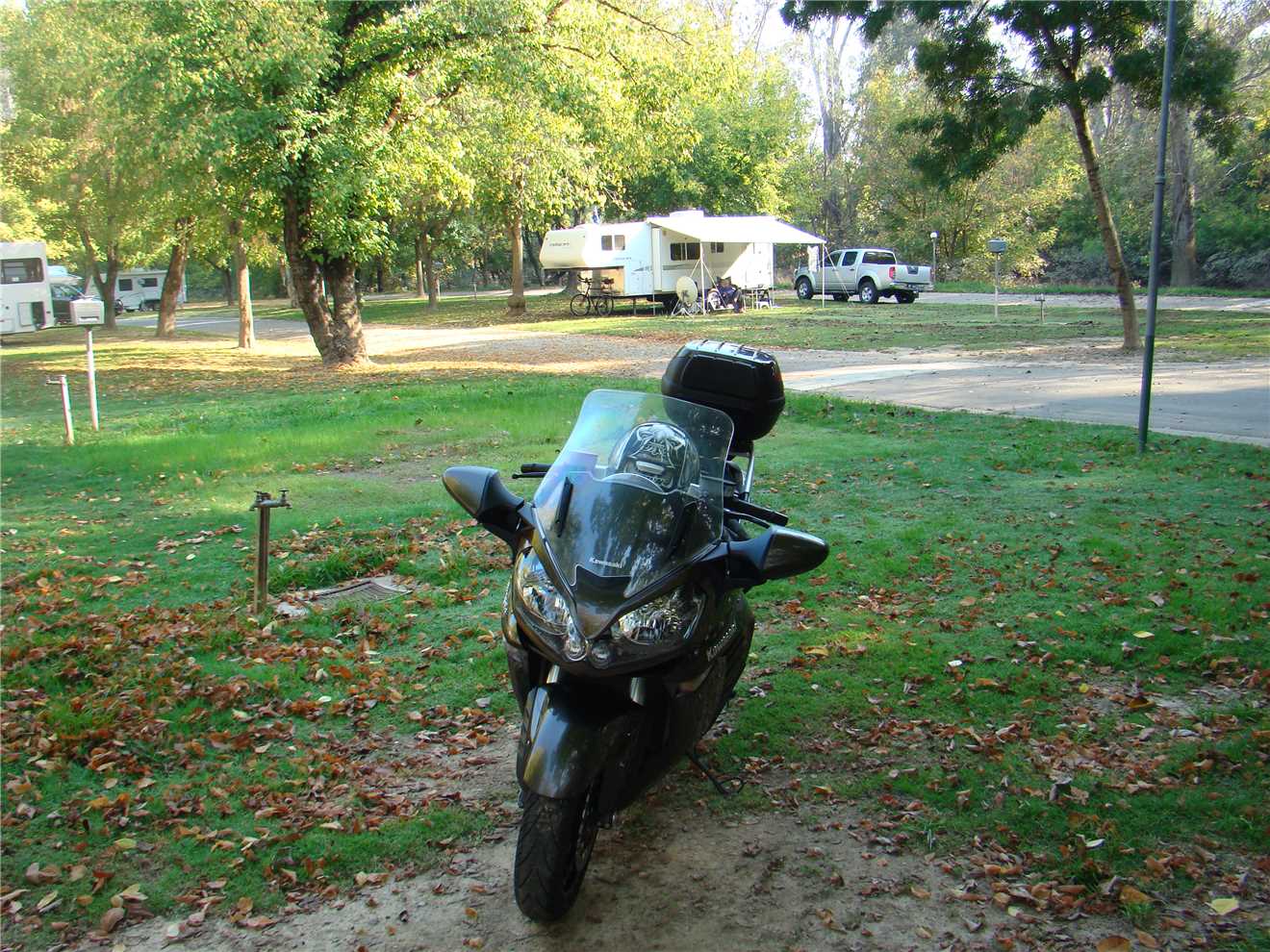 As we were staying for a week, it was a FULL setup (awning, outside fridge/Freezer, Satellite Dish and unpack my bike. It took most of the afternoon to finish setting up. Our nearest neighbour lives in a caravan and also owes a nice motorcycle cruiser, which he and his partner used for a cruise upto Wagga and back for Easter.