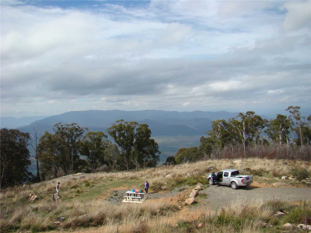 At the summit, there was a picnic table and spaces to park, so we parked and had a picnic and took photos. Just as we were packing up, a 4Wd came past and then did a U turn and parked near us. Within 5 minutes, there were 5 4WDs and a HSV Grange (which I thought was not suitable to drive the gravel road, obviously, the owner has more money than brains). We were very lucky, that we did not encounter any traffic coming towards us. The views from the summit were awesome, but were a bit hazy.