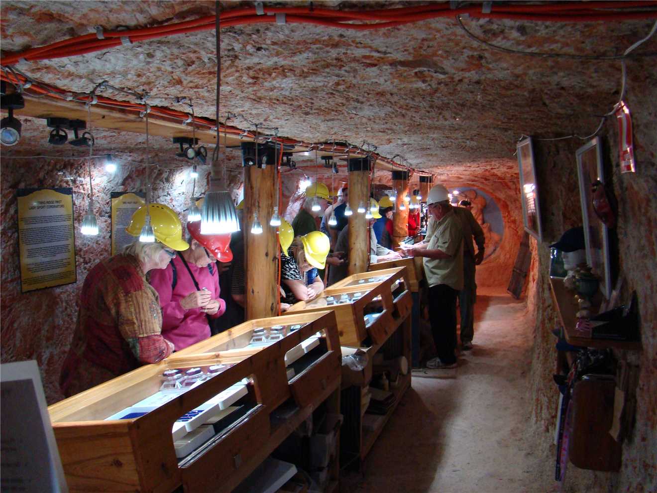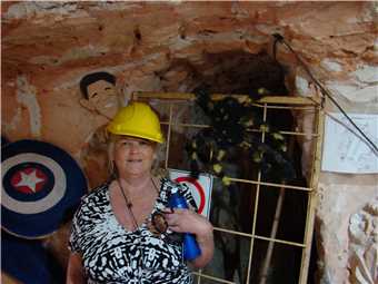 Today, we are booked in for the 10:30am Chamber of the Black Hand tour, we left camp at 10am and drove to the 'Black hand' and met the rest of the people on the tour, there were 12 of us in total. We had to go down 63 steps to the showroom, and then Bob took us for a tour of the mine. You may have noticed on the photos that we were wearing hard hats, thank god. Me, being slightly tall at 6'4", I am not designed to be a miner and I knocked my head numerous times and I couldn't stand upright in much of the mine, Marg, being a short arse, didn't hit her head once, BUT apart from that, the tour was great and what those early miners went through was absolutely hard work. Miners are usually smaller people,