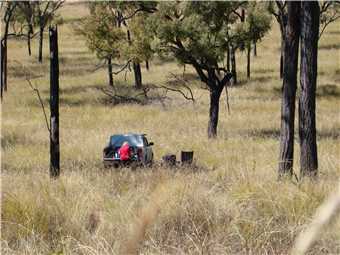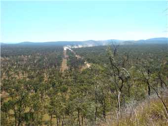 spectacular. There was only a very small ridge, guess what, it was covered in 2 foot long grass. In the distance I noticed dust along the road, so I waited for the 'car' to get to me, well, the 'car' was a B triple cattle truck full of cattle, see photos. We packed up (at 12:12pm) and headed to the Chudleigh Park turnoff about 15kms back towards Hughenden.