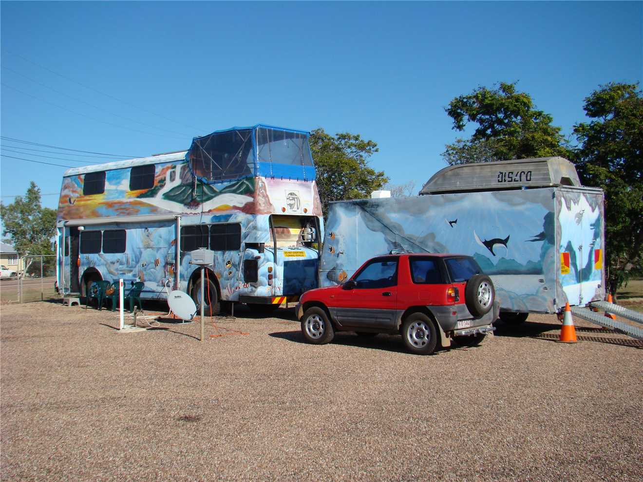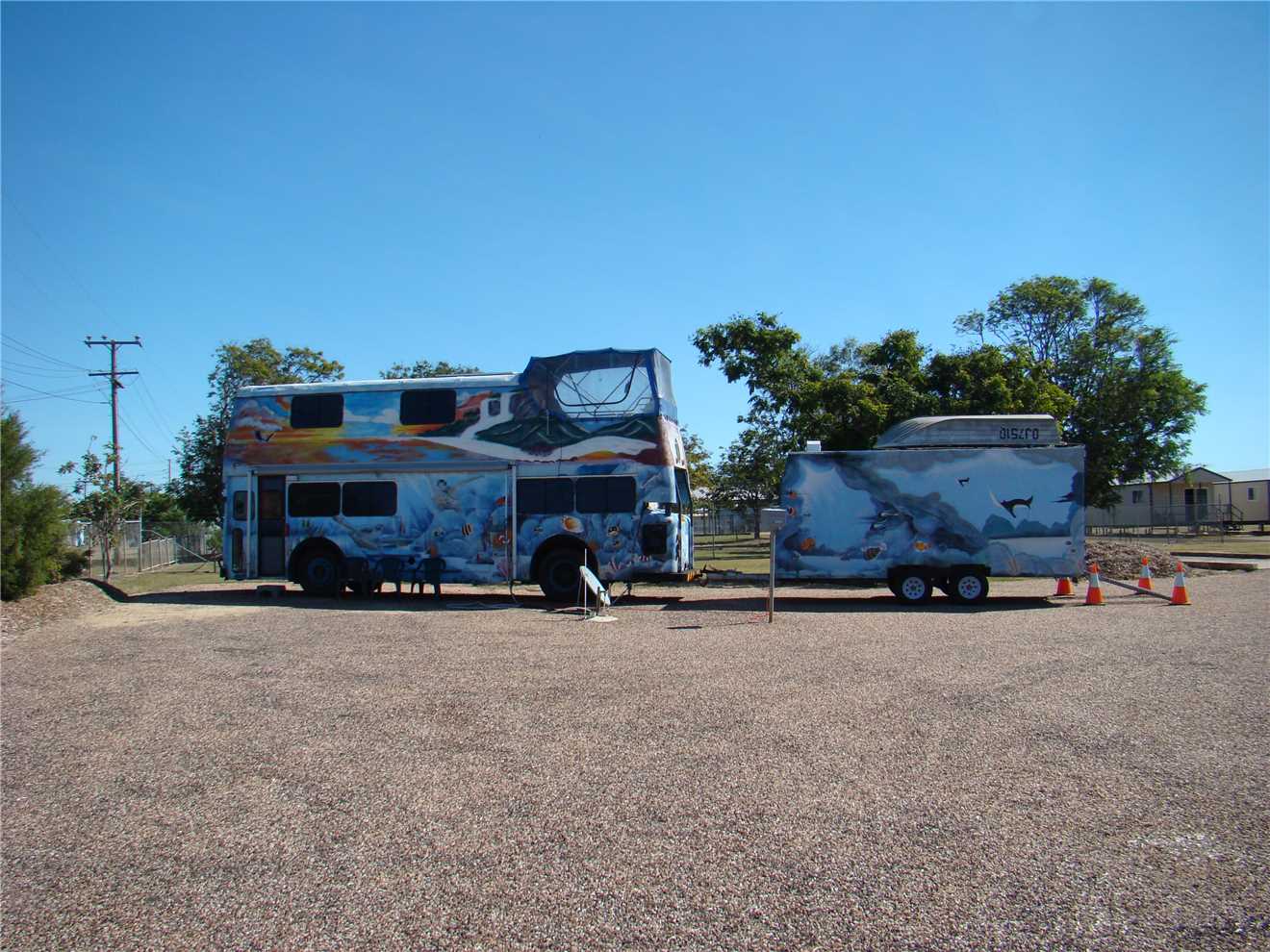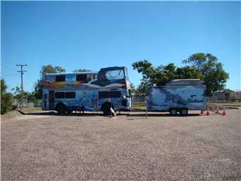 We met Jim and Lesley who own the double decker bus next door. What a great couple. They sold up everything and converted the bus into their home, they left Sydney 2.5 years ago and have only got this far, doing a lap of Oz. They originally planned to be away for 2 years but have revised their plans to 6 - 7 years, as they have only visited NSW and a bit of Qld so far, they have heaps to go. They showed us through their 'home', it is magic, the upstairs beer garden is awesome.