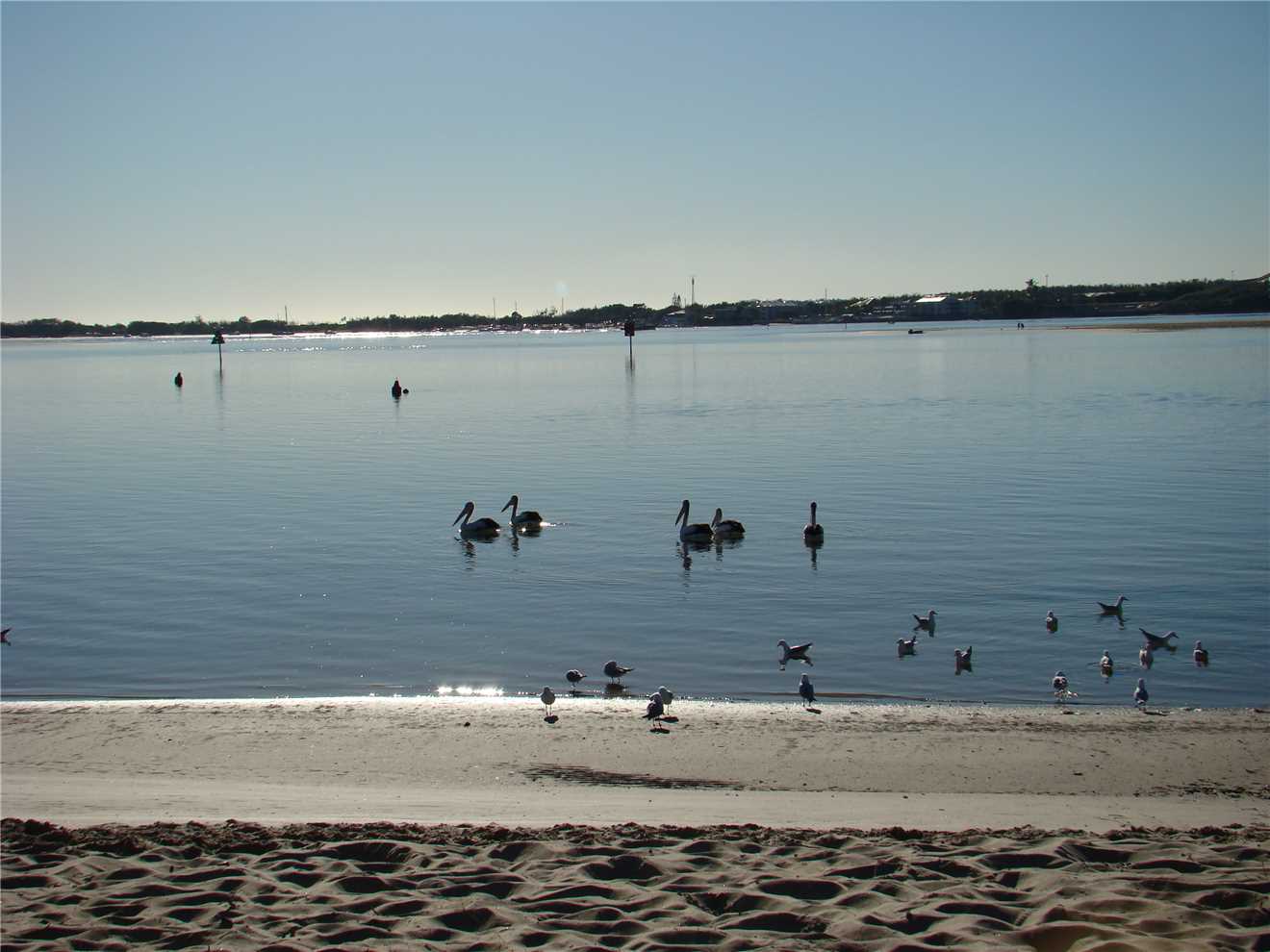 Looking form the spit across the Broadwater to our camp site. Just to the right of the cabins.