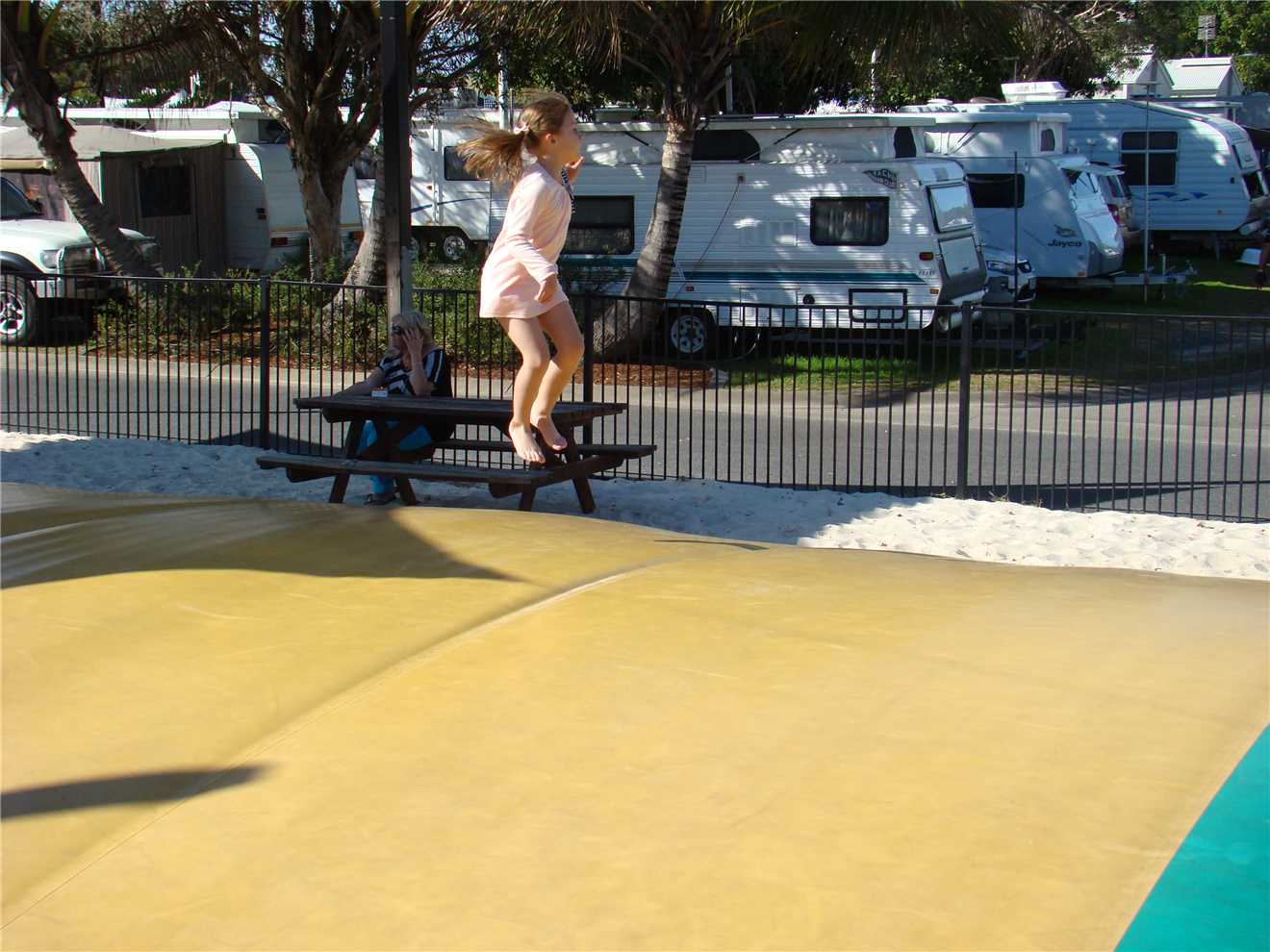 good fun. After the beach, we walked over to the bouncing pillow which is in our park near the Office. About 3pm, Marg and I were buggered and