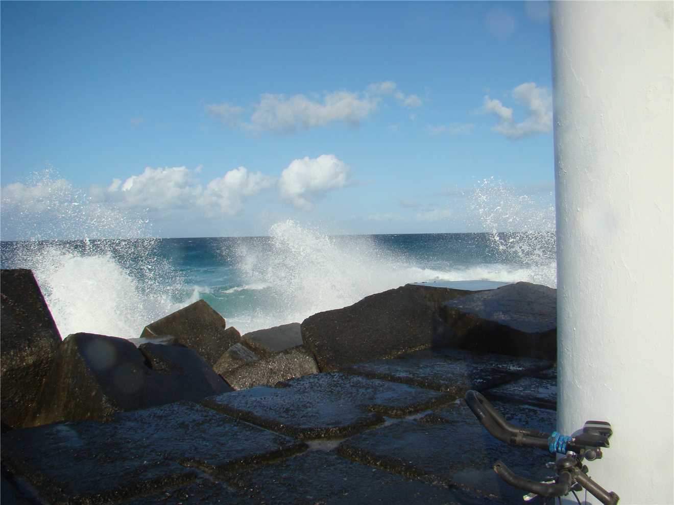 It was a good ride, being Sunday, there were quite a few people around. At the end of the seawall, the Southerly had produced some big waves with spray