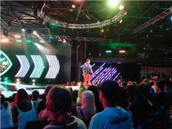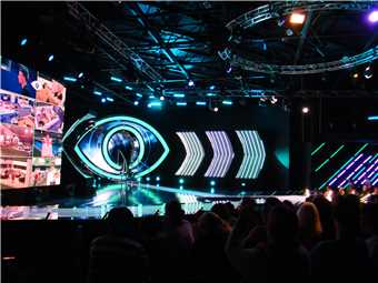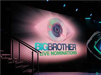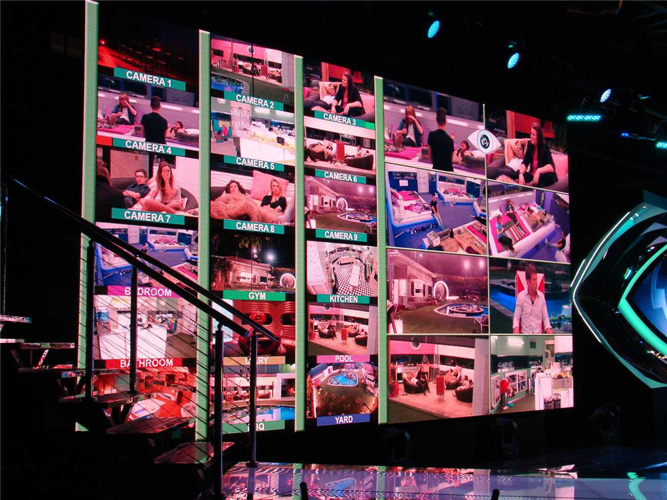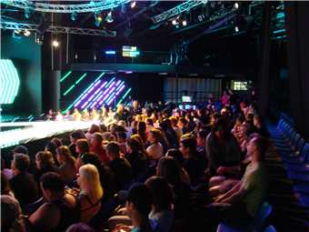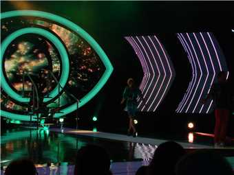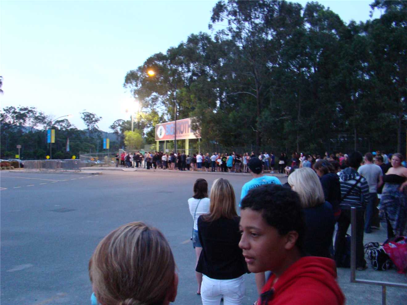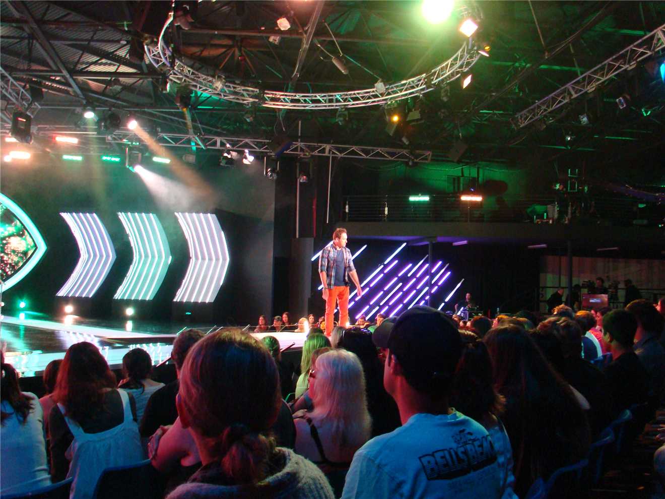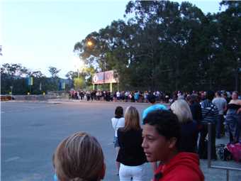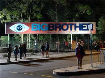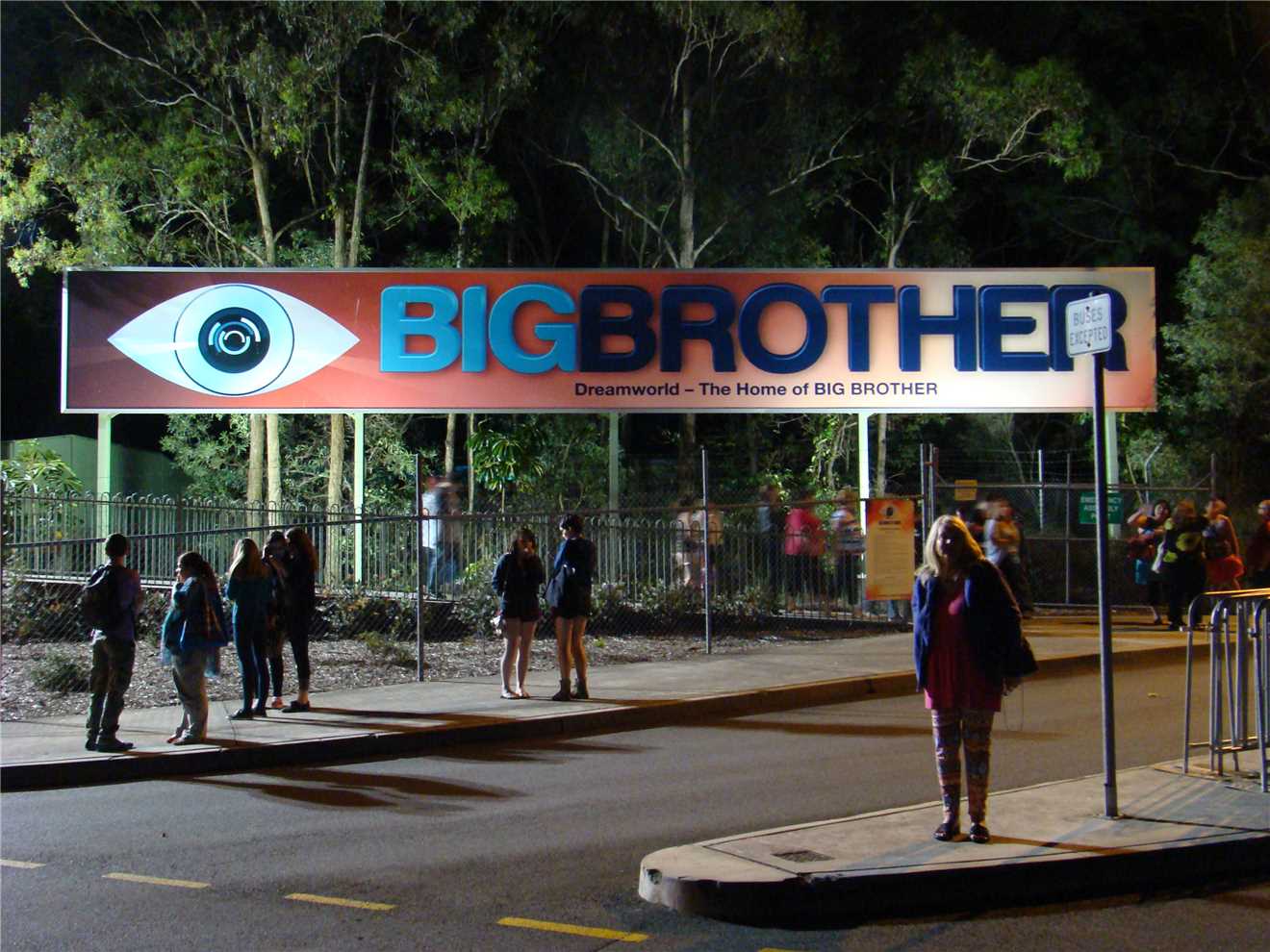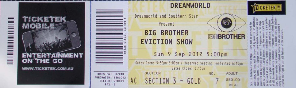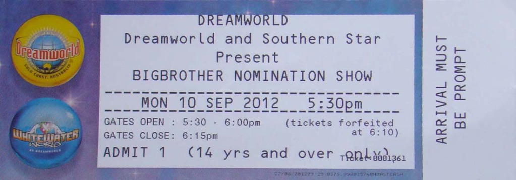 The tickets said gates open 5:30 - 6:00pm and close at 6:10pm. Well we got to Dreamworld about 5:15pm, I don't like being late, and stayed in the mighty Navara until 5:30pm. We stood in the above queue until 6:10pm, I was pissed off. Big Brother (BB) treat the audience like shit. On Sunday's Eviction show, there was probably 1 to 2,000 people, tonight there was about 200 people max. Purely by coincidence, we sat one row behind our Sunday night seats. Middle photo is the stage. Right photo is the big screen which shows all the cameras as above or anything else.