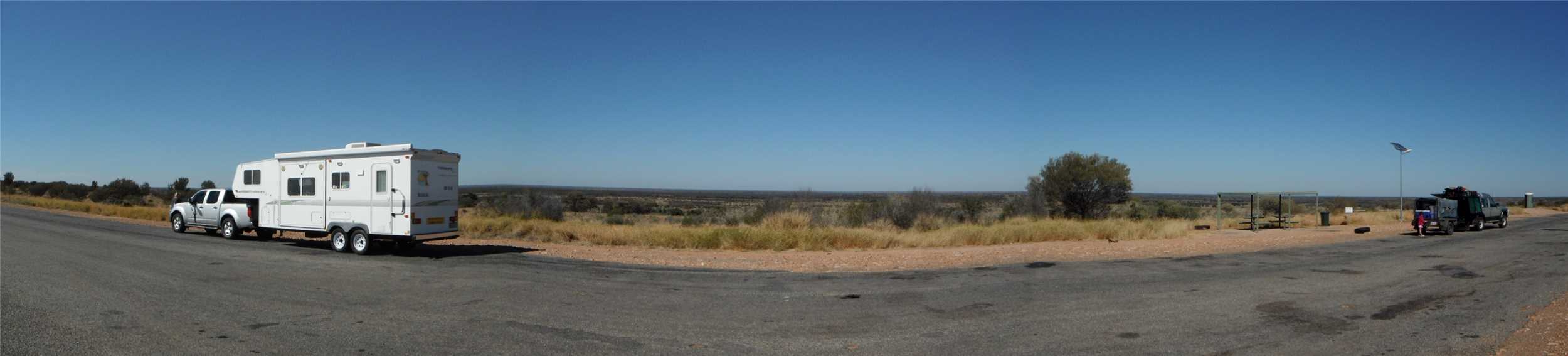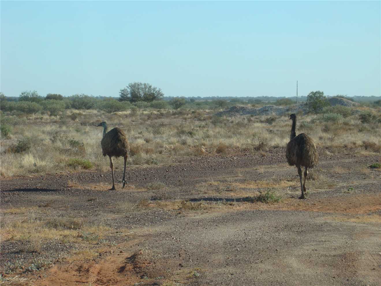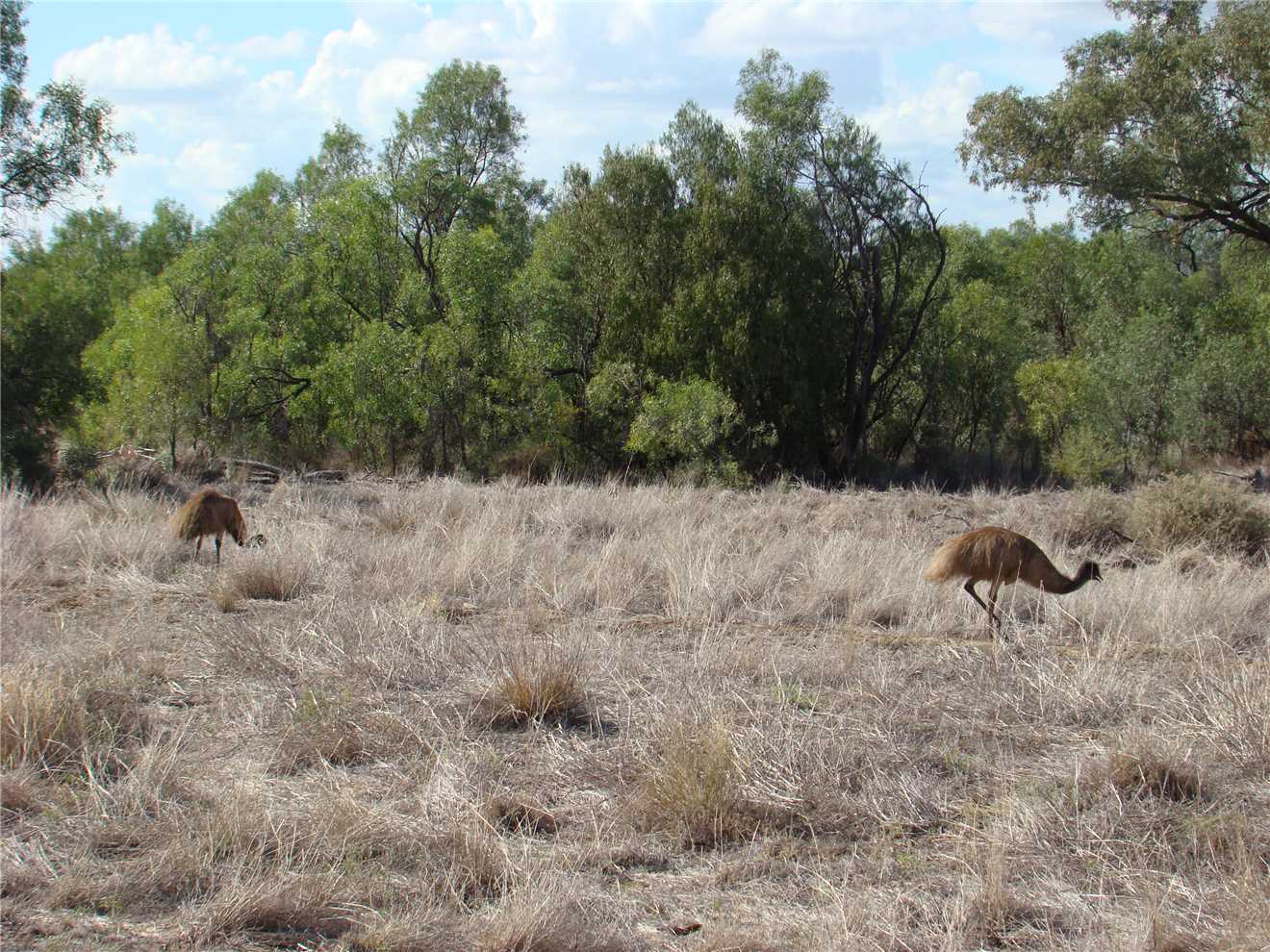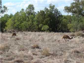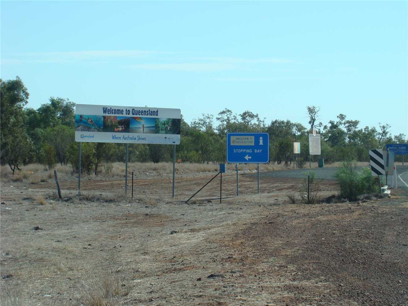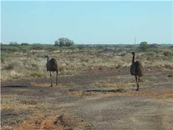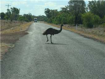She finally woke about 7:00am, we watched Kochies Sunrise and started to pack up about 7:30am. We left at 8:35am and set cruise to 90kph and away we went. The first stop was about 58kms from Bourke, we then drove to Barringum, about 1km from the NSW/Qld border, still next to no traffic. We stopped at the border to take some snaps and continued onto another rest stop about 88kms up the road to a truck stop. Now we are only 38kms from camp. As we approached Cunnamulla, I noticed an emu in the distance, as we approached he approached us, I slowed, he tried to run beside us, then he made his run across the road. See photo, we stopped.