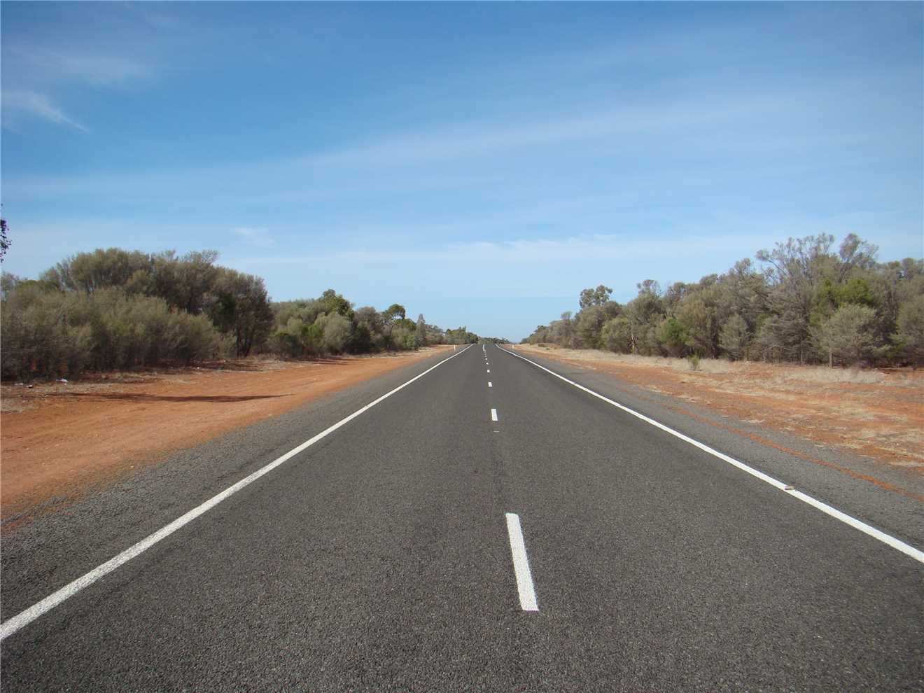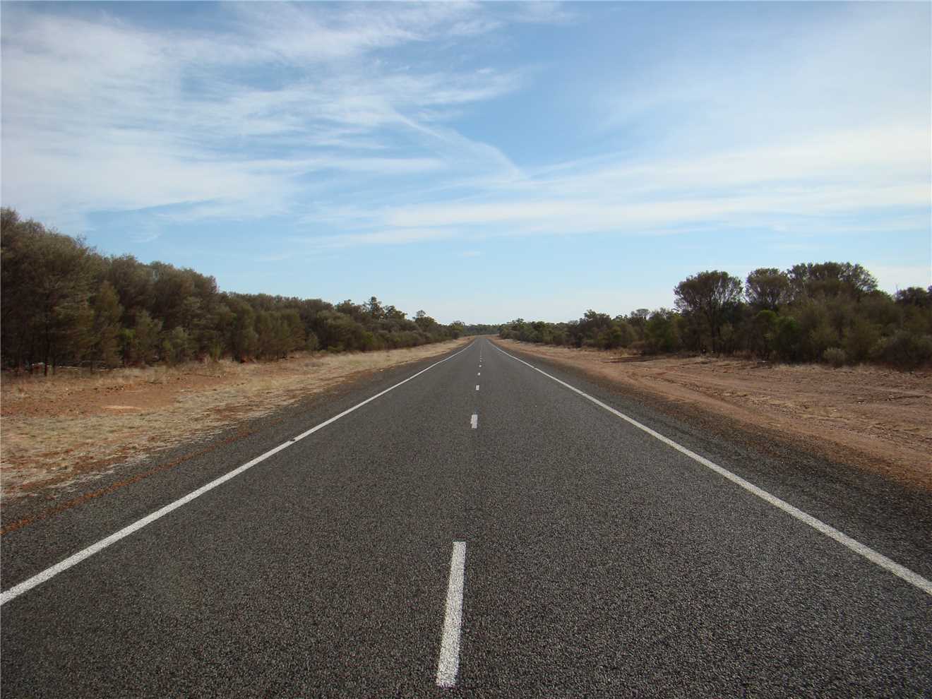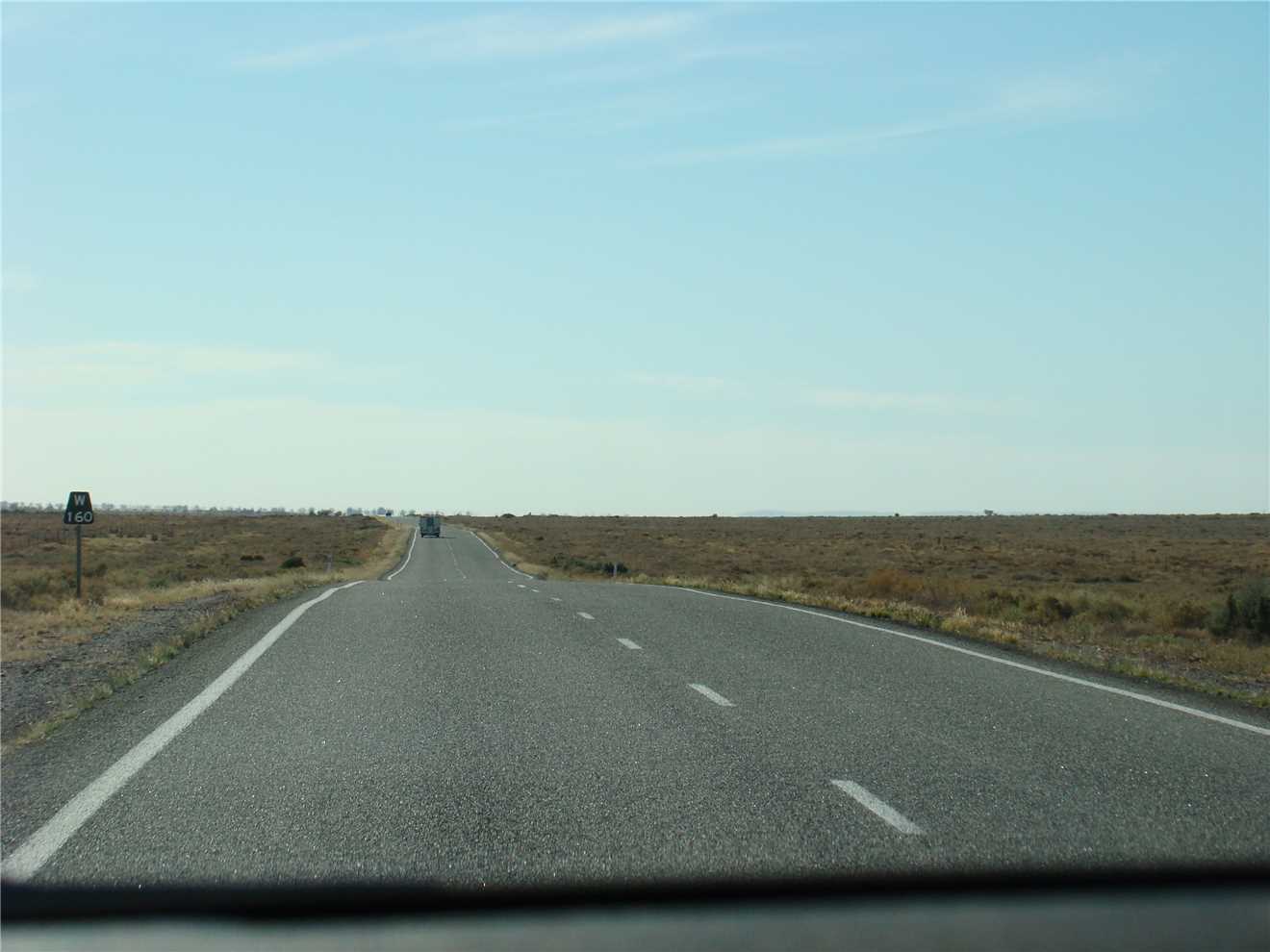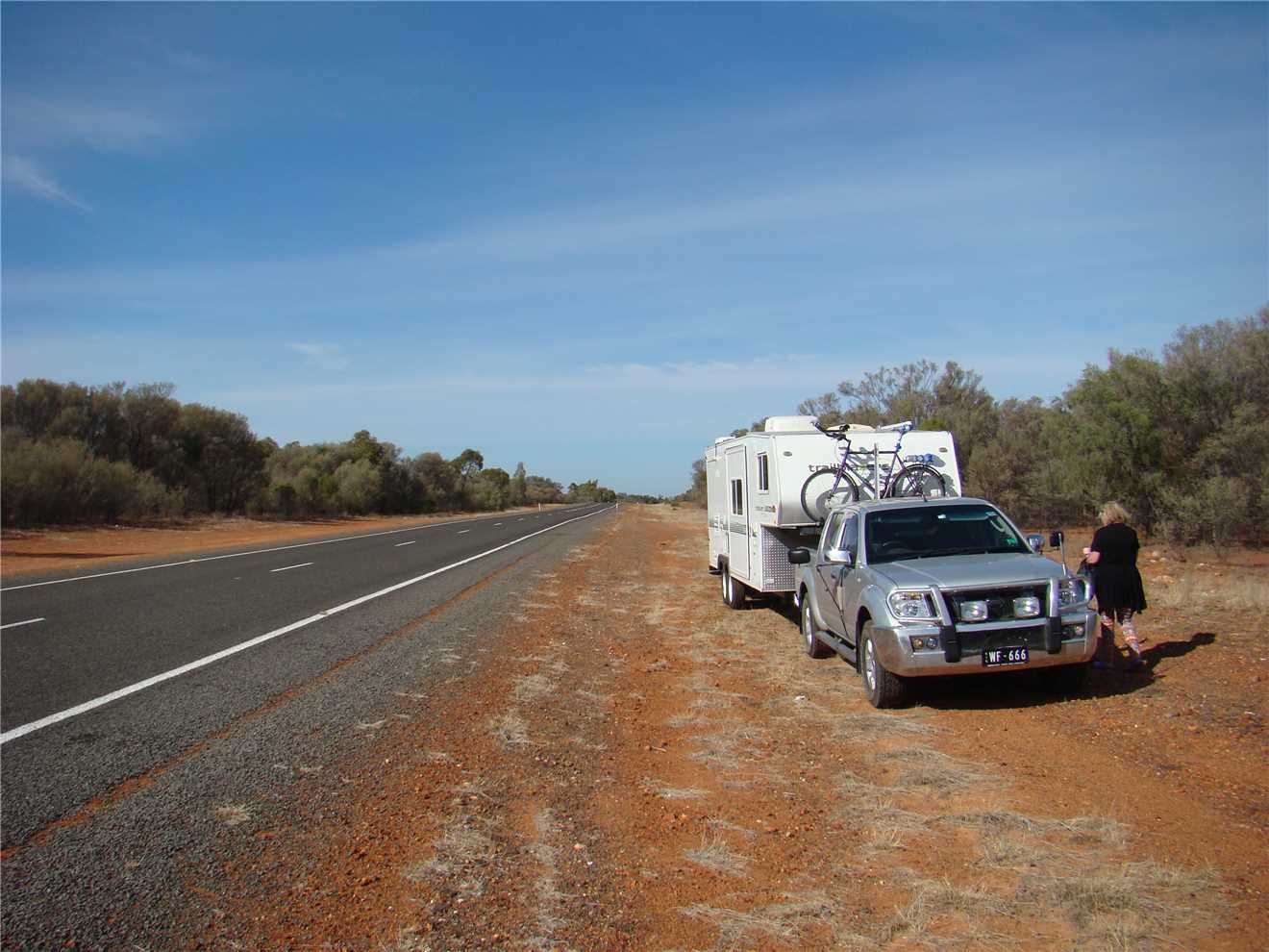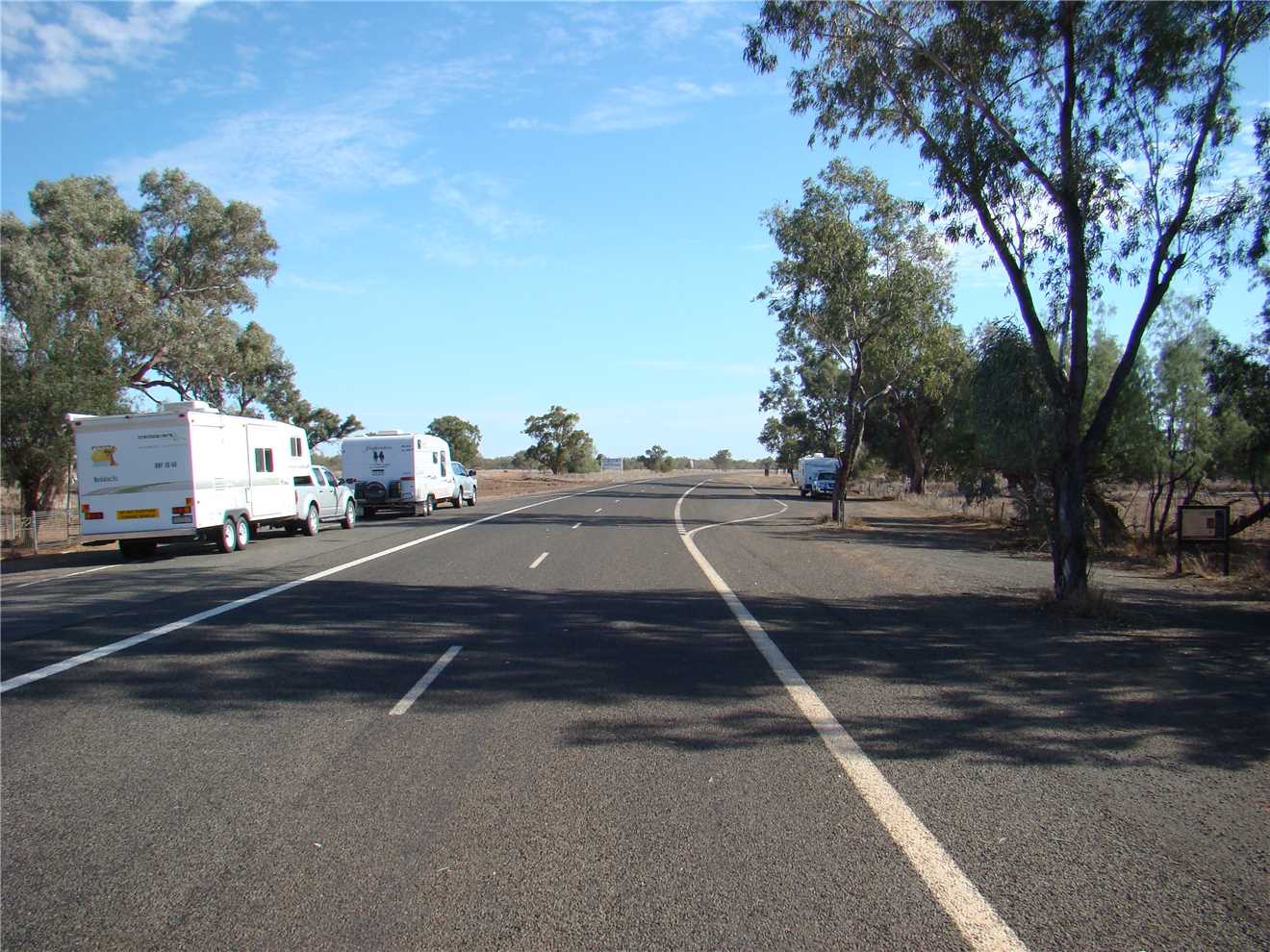 She finally woke about 7:00am, we watched Kochies Sunrise and started to pack up about 7:30am. We left at 8:35am and set cruise to 90kph and away we went. The first stop was about 58kms from Bourke, we then drove to Barringum, about 1km from the NSW/Qld border, still next to no traffic. We stopped at the border to take some snaps and continued onto another rest stop about 88kms up the road to a truck stop. Now we are only 38kms from camp. As we approached Cunnamulla, I noticed an emu in the distance, as we approached he approached us, I slowed, he tried to run beside us, then he made his run across the road. See photo, we stopped.