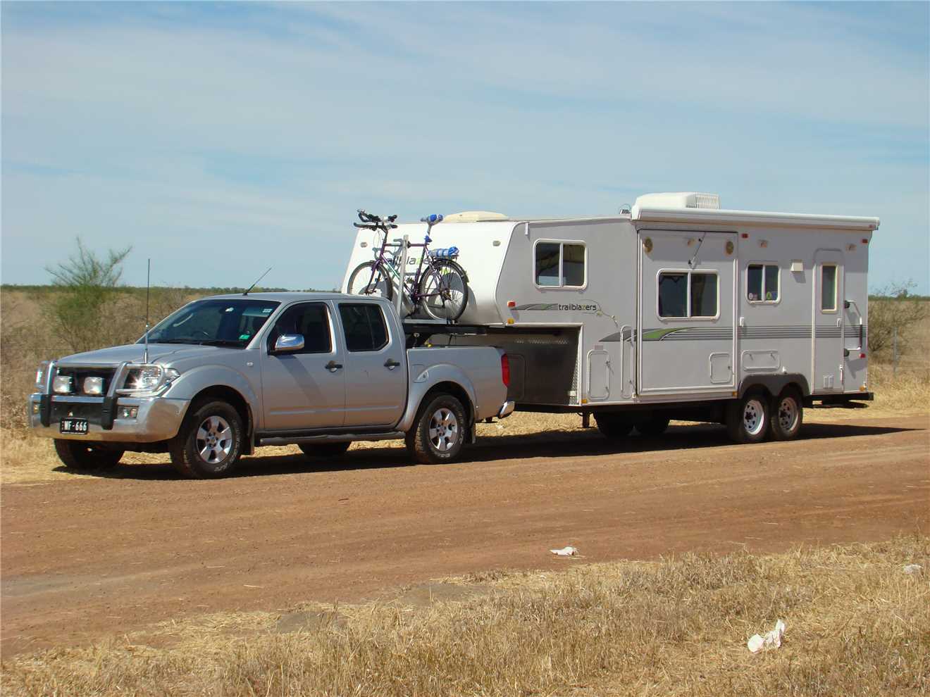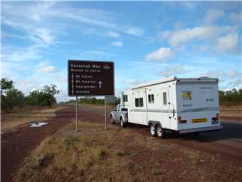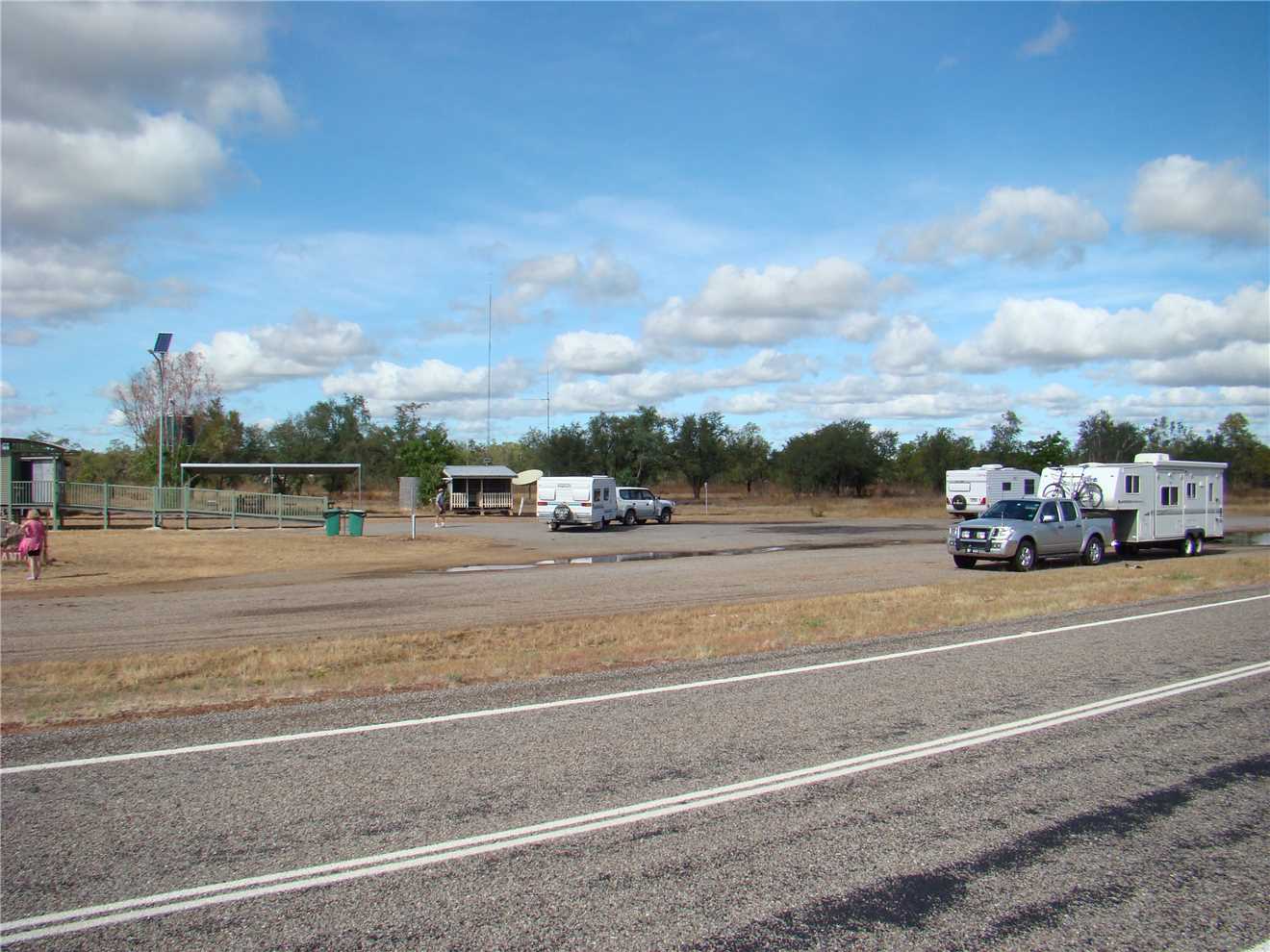 After risking live and limb, I wandered back to Marg and away we went to Georgetown. When we were 55kms from Georgetown, this is when the single lane bitumen started. This lasted the majority of the way to Georgetown, we were lucky that we encountered only one oncoming Road Train, which we pulled off and waited until he passed us plus a few cars. There was one area of road works with traffic lights, but it only lasted a kilometer. We arrived in Georgetown at 11:54am. Still no Billy. We found the Goldfields Caravan Park, but there was no manager there, only a notice saying to check in at the Ampol Roadhouse, so I walked there and back, the young girl said that we are on site 8. Site 8 was the largest site in the park, it is a ripper. We setup camp with power, water, Marg's special room and the Sat Dish.