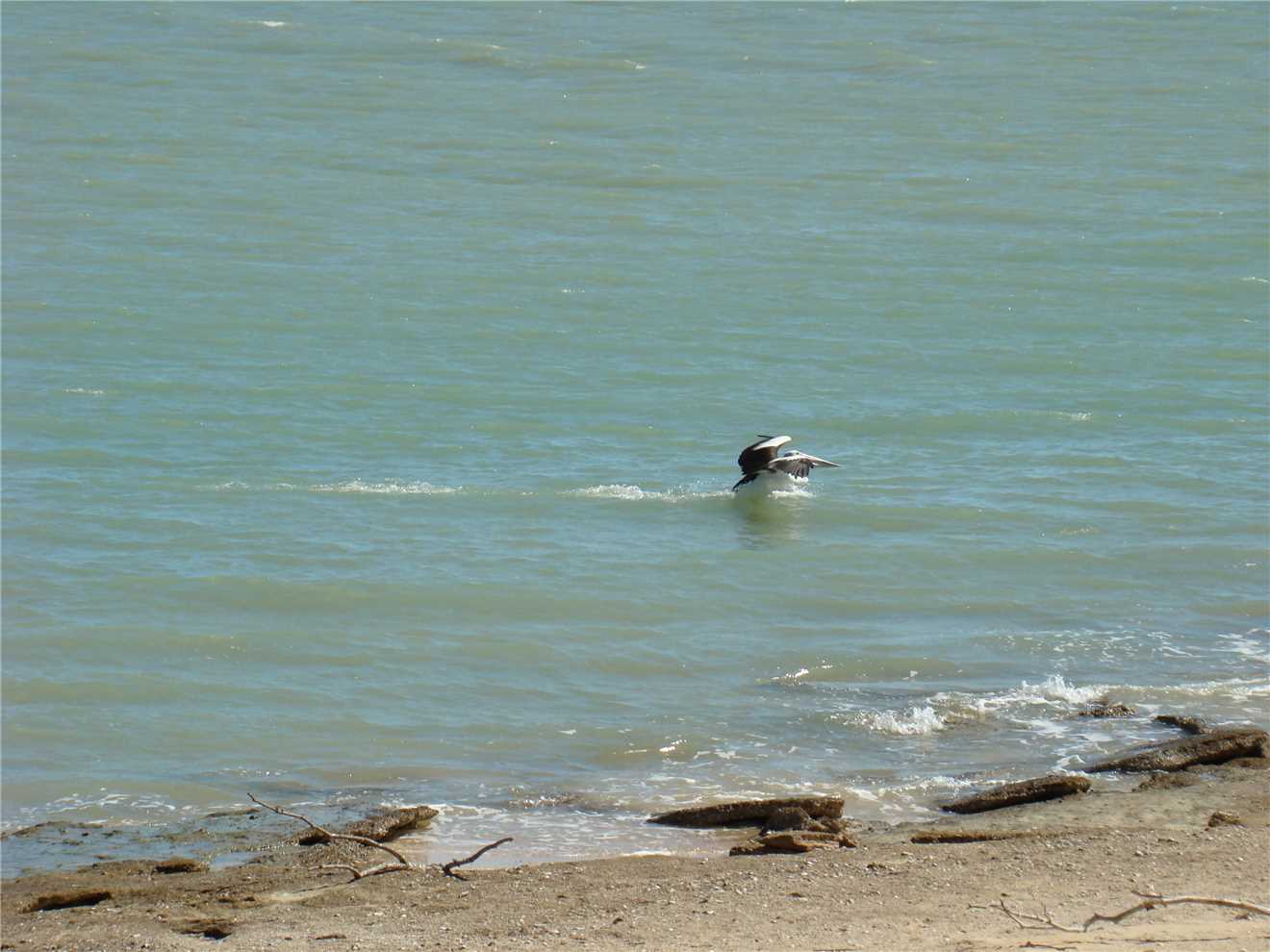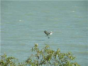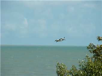 As we planned to visit Karumba (71kms frrom Normanton of the edges of the Gulf of Carpentaria) for lunch, there was no point in leaving early, so we left at 10:50am and arrived out the front of the Sunset Tavern at 11:40am. Lunch was from 12 to 2pm, what will we do for 20 minutes, well hawkeyes aka Marg noticed that there were pokies there, so I lost her for 20 minutes. She put in $5 and won about $15, but I still paid for lunch. Go figure. Lunchtime arrived, I ordered beer battered fish and chips and washed it down with a chilled refresher, only one as I was the designated driver, Marg ordered prawn cutlets and washed it down with a lemon juice. Sorry my photo was blurry, I didn't check it thoroughly. As we were having lunch 2 red tailled black cockatoos landed in the trees near us, I tried to get a photo of their red tail, but the buggers weren't co-operating. Just as we were leaving George and his mates flew past, so I was rapt to get a photo of one of his mates landing on water, I have been trying for 5 years to photograph them landing on water. Now I will try to take a better photo. We left Karumba Point and drove about 6kms over to Karumba to check it out. All the caravan parks at both locations were full with fishos and their tinnies everywhere, with 'no vacancy' signs displayed.