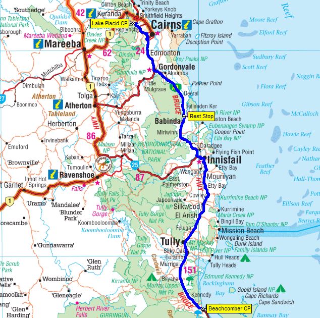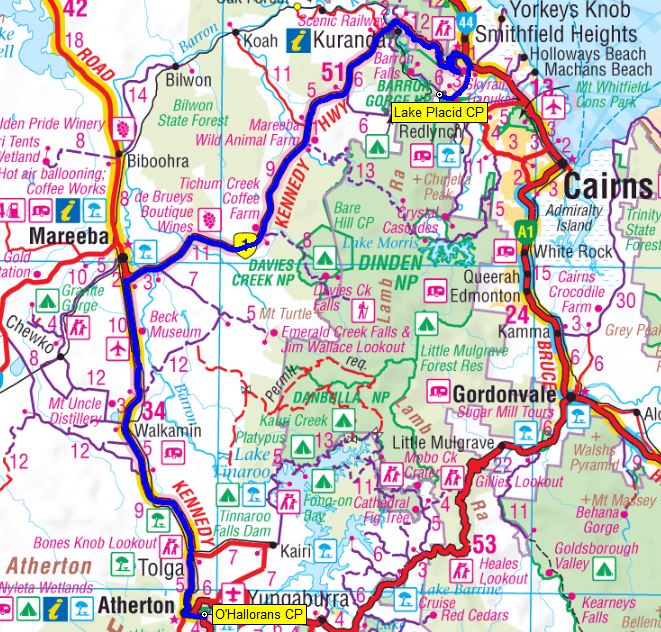 Our route from Atherton to Lake Placid, Cairns, Qld - 88 kms.