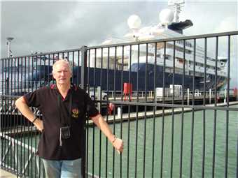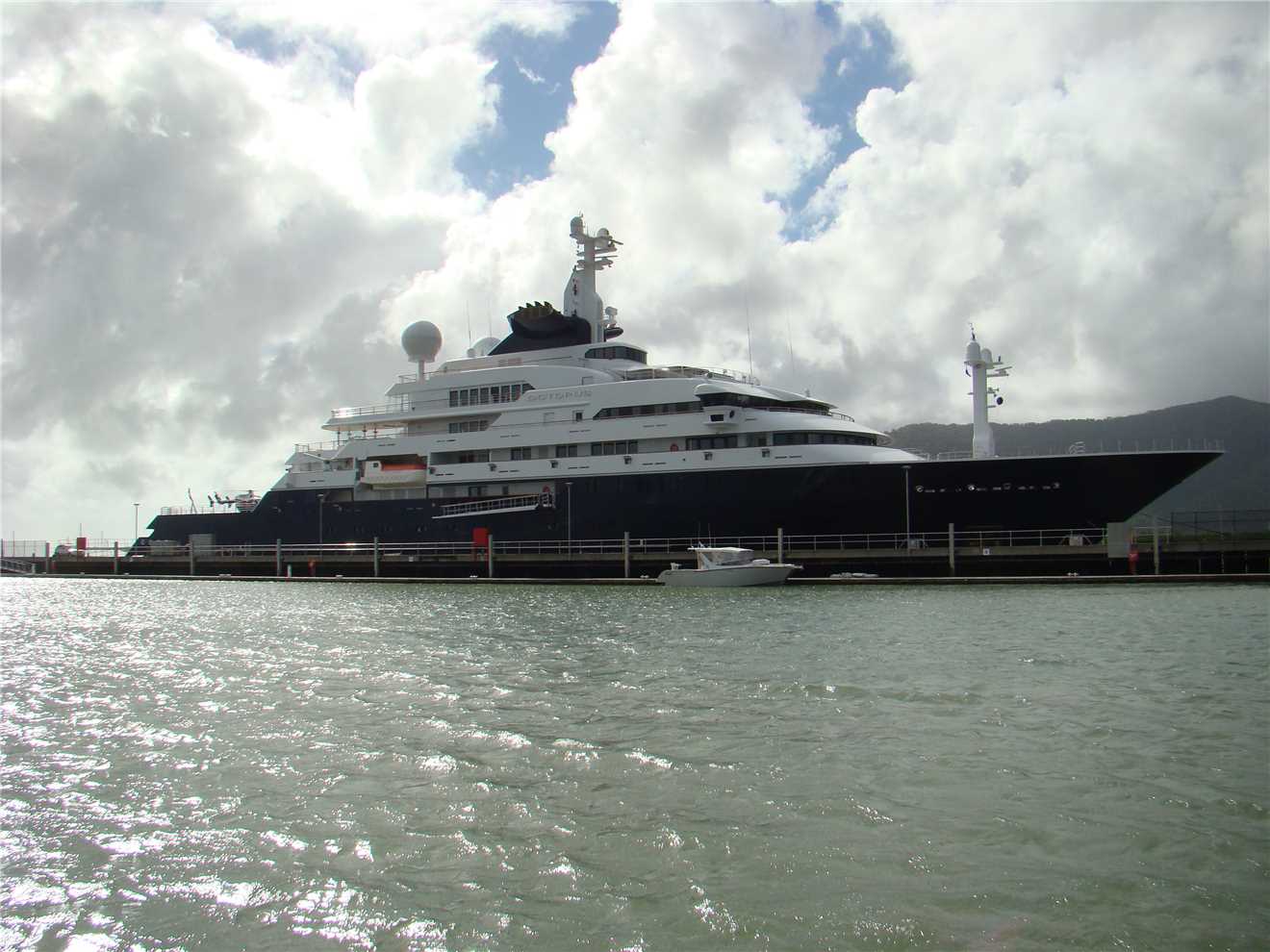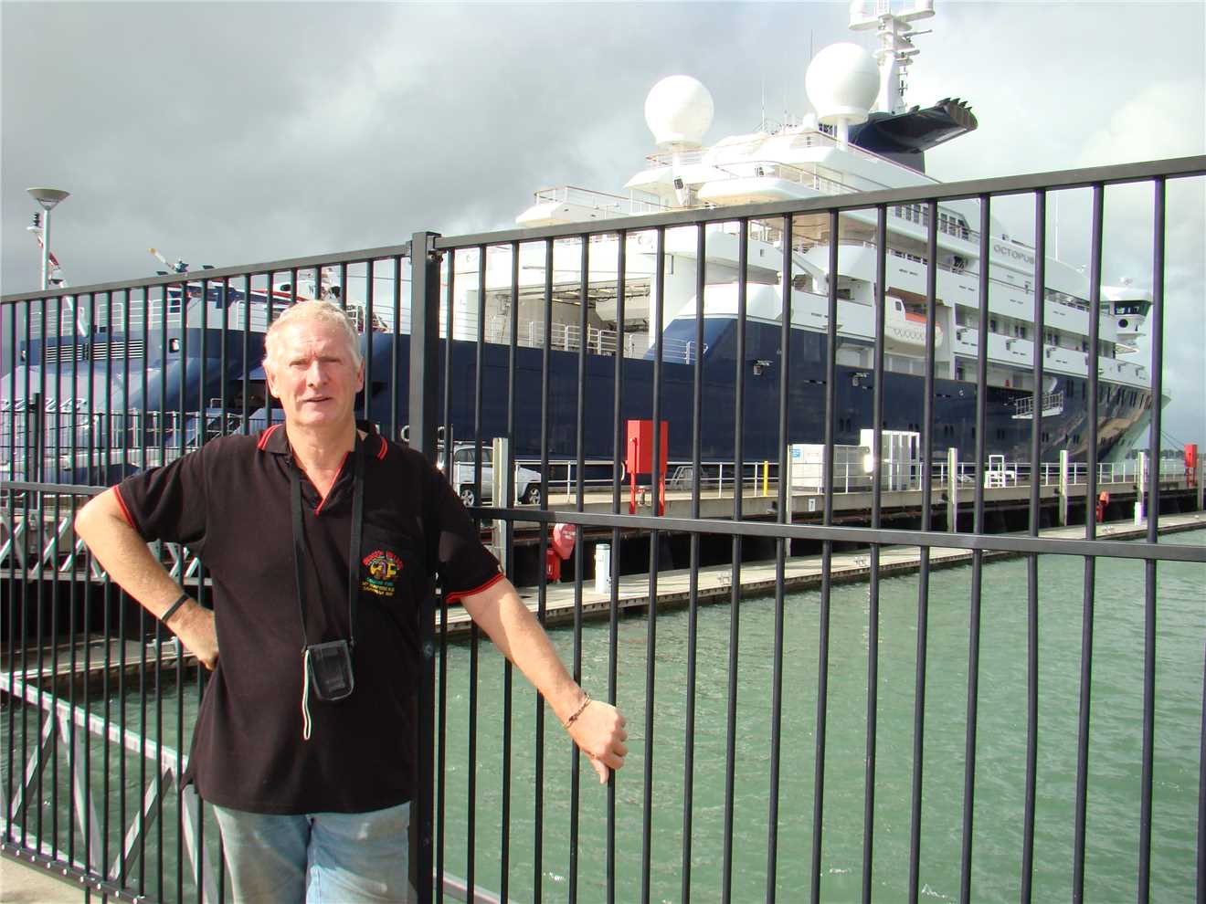 I dreamt about how can I photograph my new best friend's boat (Paul Allen's MY Octopus), so when I got up, I left Marg at camp, she didn't want come with me anyway, and drove to the Cairns marina. Yesterday, the marina was blocked with all the marquees and bike areas etc for Sunday's Ironman competition, so today I had plan B, which was to park at the wharf and walk a kilometer or so to the marina. I thought drive to the marina on the oft chance that I can get through, well the planets were all aligned, when I arrived there, there was no traffic and I also managed a parking spot, 2 spots from the yacht club. I was rapt. I bought my parking ticket and off I walked to the easterly end of the pier, where Paul's boat is moored, strangely, there are high security fences stopping everyone including me. As I walked out along the pier, I spoke to another guy who was walking out there with his camera, it was Shaun who is competing in Sunday's ironman, we chatted for 10 minutes as we admired the boat. He also took my photo with me and the boat.