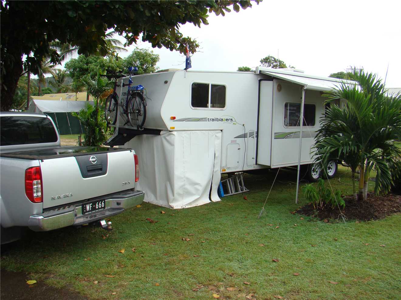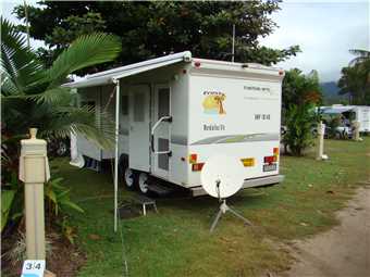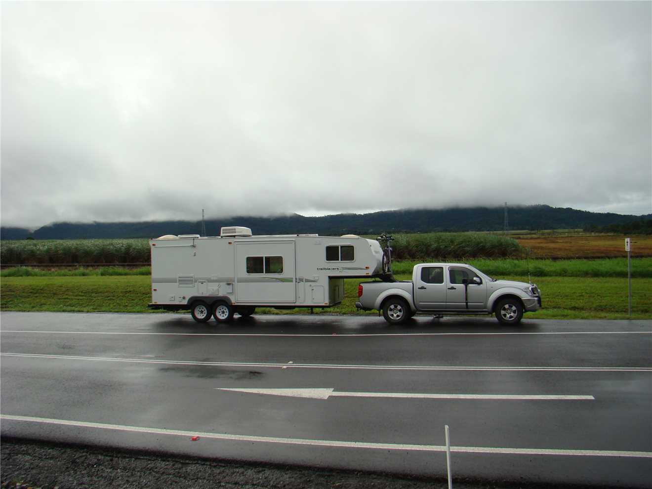 We left at 8:52am and headed into the misty rain squalls, which persisted the whole 191kms to Cardwell. We stopped at a rest area about 65kms from Cairns, the traffic was heavier than we had experienced since leaving Victoria. The Bruce Highway was Ok, with a few sections of roadworks but being Sunday no stop/start zones. We arrived at Cardwell at 11:34am, we check in and were given a drive thru site. It was still drizzly rain while I setup, but I still setup the power, water, Marg's room, and the Dish. It was very humid and after setting up, I had a beautiful shower with heaps of hot water pressure.