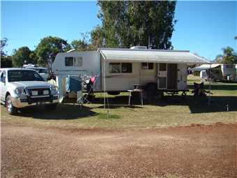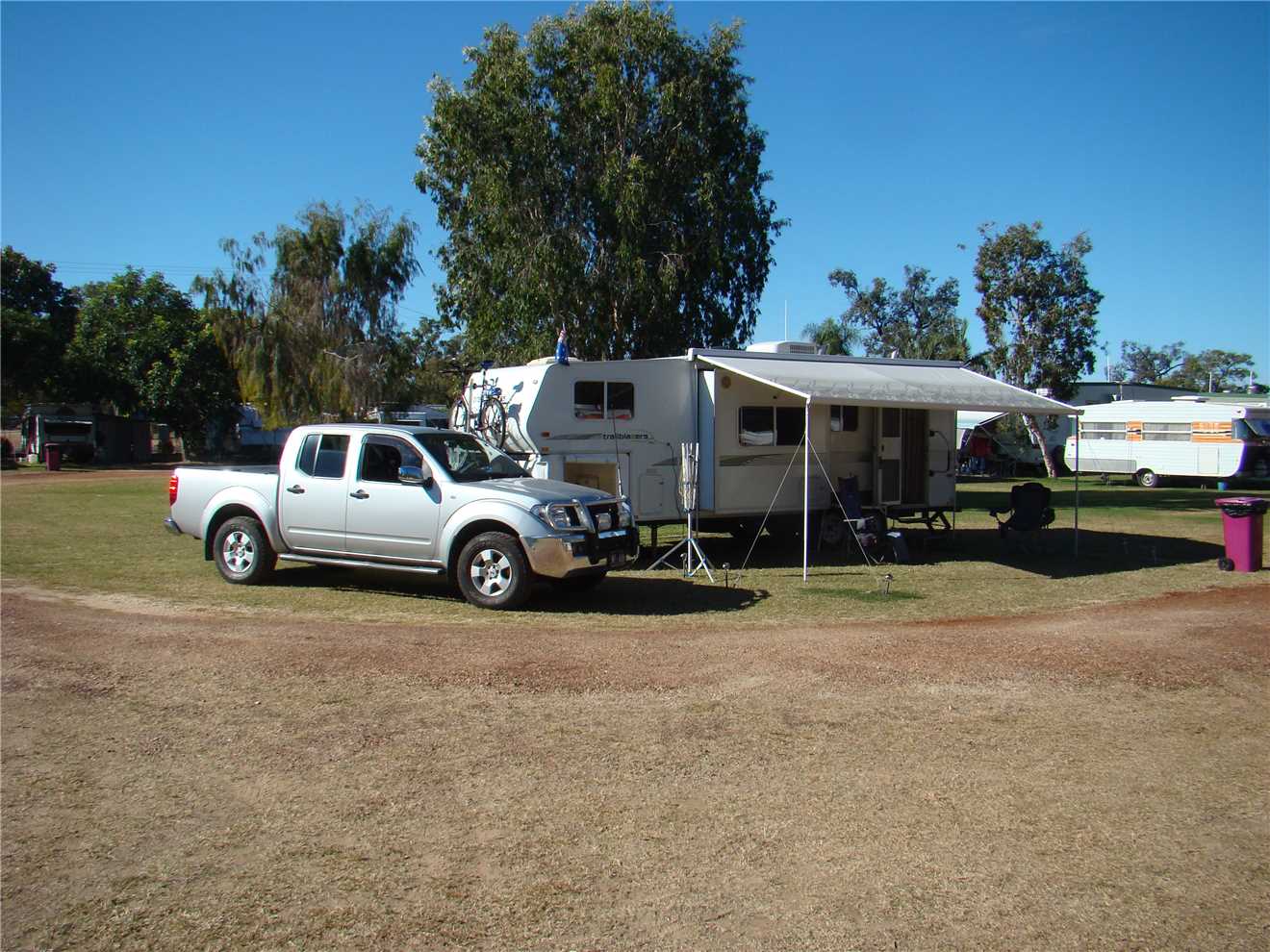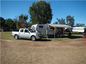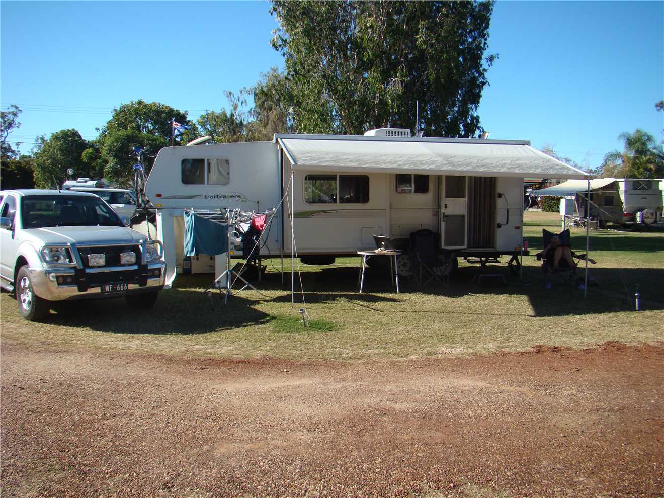 As we had only a 160kms to drive, we were in no rush to leave, so when we finally arose, after the heater had warmed up the fiver to 20+°s, we got our morning internet fix, before we packed up the few bits and pieces. We left just on 9am and headed off towards Sapphire, stopping at Capella for a rest stop, arriving at Sapphire at 11:18am. I checked in and were given Site 49, the same site as we were on last year, but this year it is dry, compared to last year it was damp under foot. We did a full setup (power, water, sullage hose, awning, sat dish and Marg's special room), I haven't setup the side or ends on the awning, I will wait and see if they are required. There are new owners of the park and one 'new' rule is that you cannot run your sink water directly onto the grass, you have to dispose of it in the special 'dump point', which is a bit of a pain, but so be it.