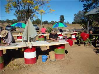 We left camp about 9:00am and walked over the road (about 200 meters) to the footy ground. Our first stop was to find Errol (husband of Janine who we met last week at Gunters) and introduced ourselves to him, which we did. We walked around every stall and found the man who makes the wooden Gem boxes, we bought one for $35, visited the footy club rooms and ordered 2 bacon and egg and onions sangas, they were YUMMA.