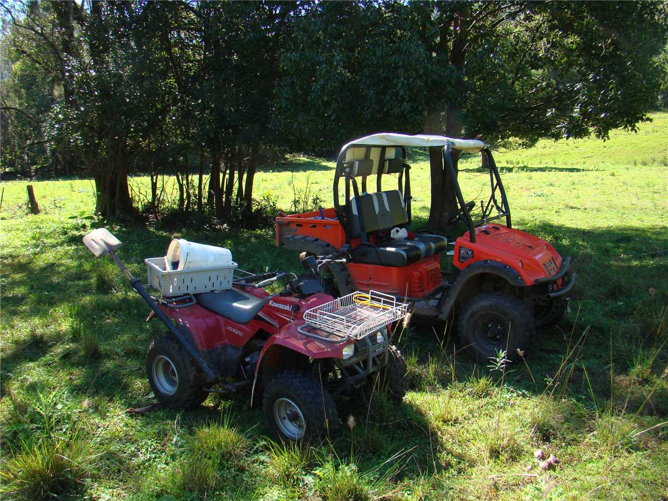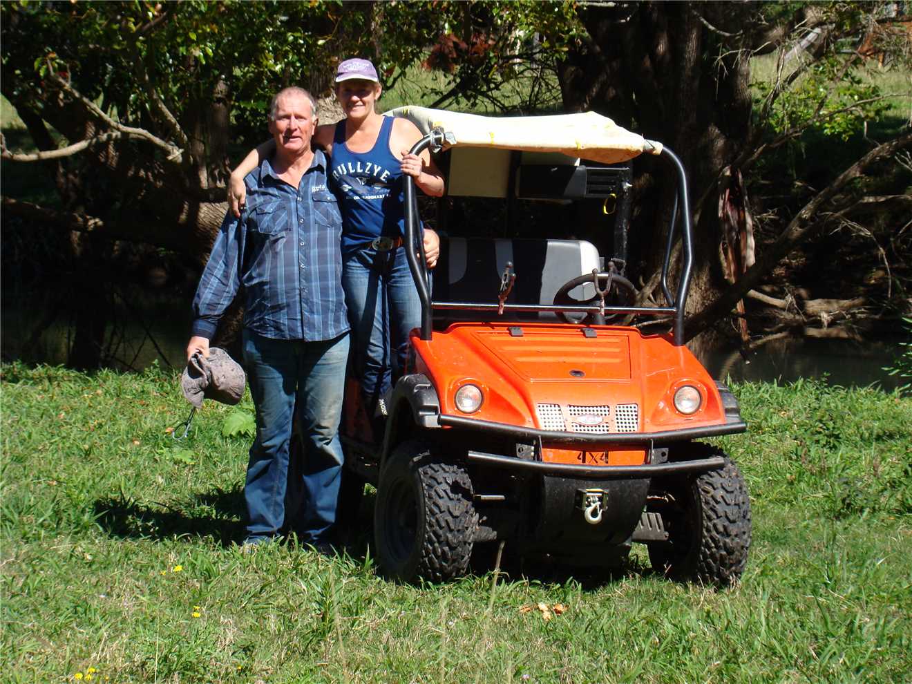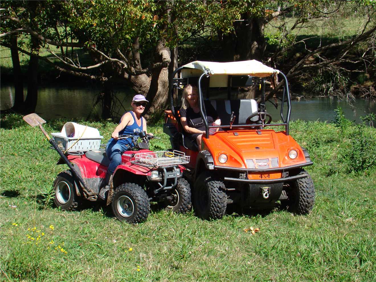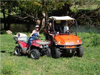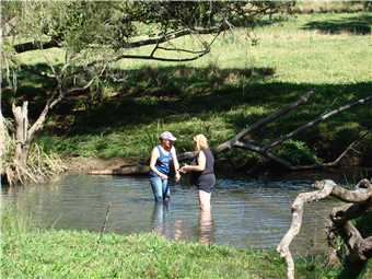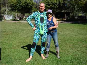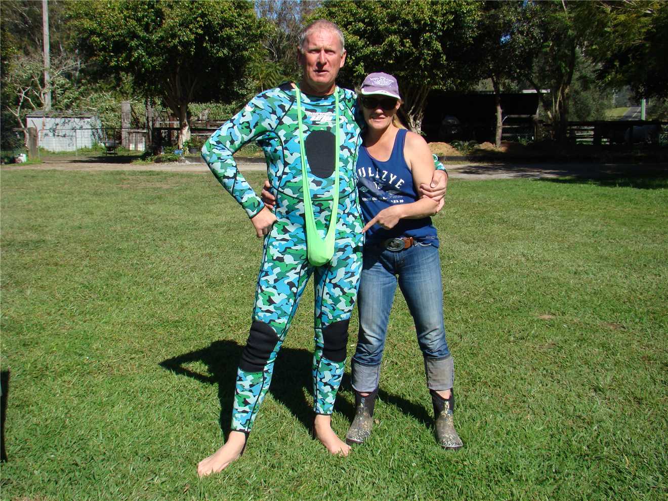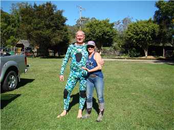 It was a milder night, so I used my 2 blankets and was as warm as toast, and we slept like babies. We awoke about 7:00am and laid in bed watching Sunrise, finally getting oursleves organised and headed off at 9am to Sharyn's Hinterland Hideaway. Sharyn is a member of the Aussie Sapphire Forum and has a creek running through her property that is nestled in the Gold Coast Hinterland. She allowed us to visit her and agreed to take on a fossicking trip of her creek. We arrived at 10am, parked on her lawn out the front of her house, Sharyn was in the stable attending to a horse which has cut her leg, but is recovering well. After introductions and a bit of chatting, we packed our fossicking gear into one of Sharyn's quad bikes and off we went following Sharyn, Marg was my passenger. We followed Sharyn through various paddocks, until we came to a fossicking spot. We stayed here for a while and found some pretty rocks, then decided to drive back to the mighty Navara and picked up our sieves, as we were going to another section of the creek, where we would use the sieves. After we finished, it was time to show Sharyn my floral pastel wetsuit, she insisted that I wear it and also she gave me a little gift earlier in the day, that just happen to be a lime green mankini. Borat, eat your heart out. It fitted like glove. We thanked Sharyn very much, as we loved her property and we had a great time.