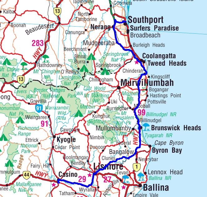 Our route from Southport to Casino - 174kms.