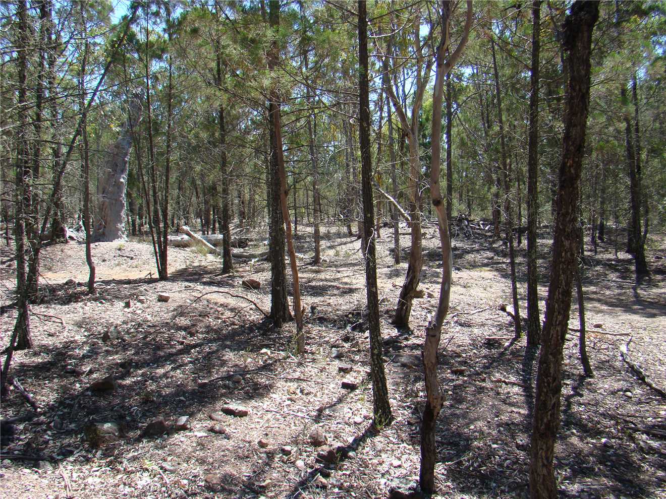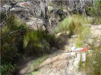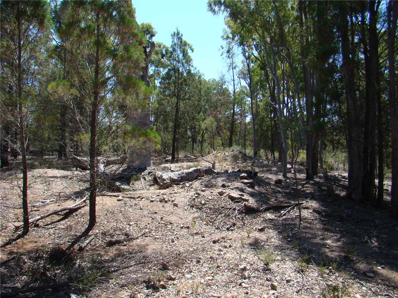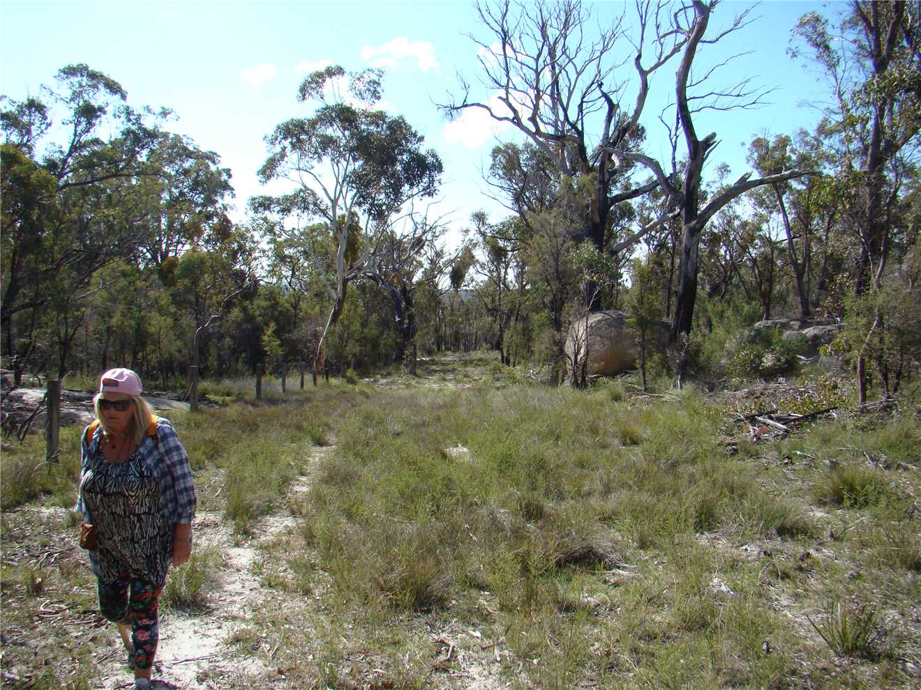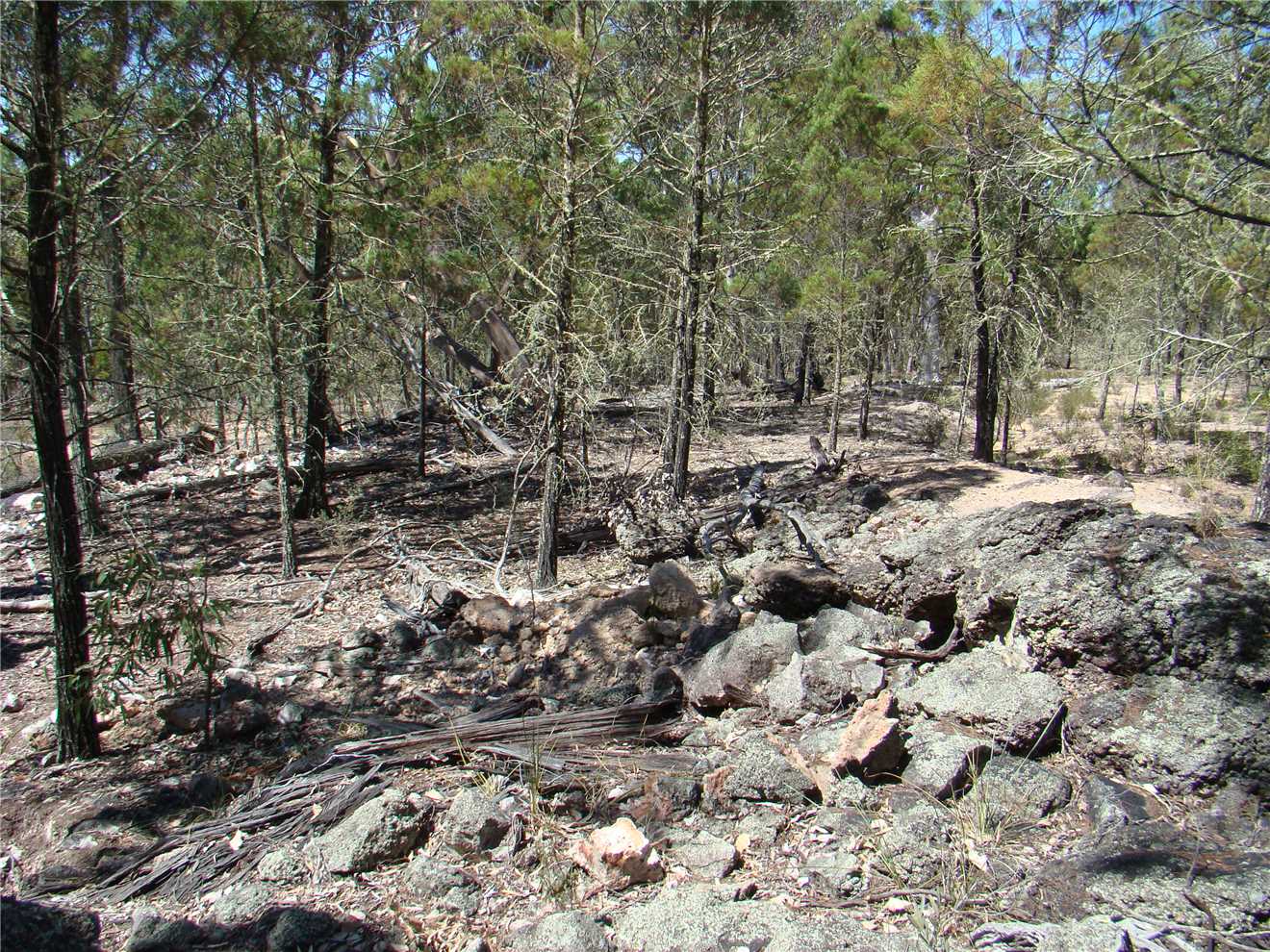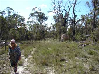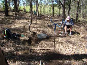 Meanwhile, back to the gate. Turn left and follow along the fence. I know this is private property but it sures beats thrashing through the bush on the Conservation Area side. After about 15-20 minutes you will come to a little creek (which might well be dry, of course). This is Scrubby Gully. Upstream (private property, of course) is the site of the Scrubby Gully alluvial tin workings. They weren't neat and tidy in those days so it is all badly eroded. Downstream (and in the Conservation Area) there are small alluvial workings along the creek and sometimes some distance away from it. Go as far down as you like (all down hill in rough granite country). There is plenty of gravel to dig but lots of other fossickers have been there before you.