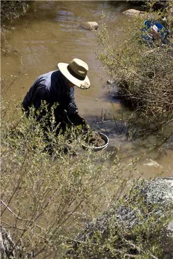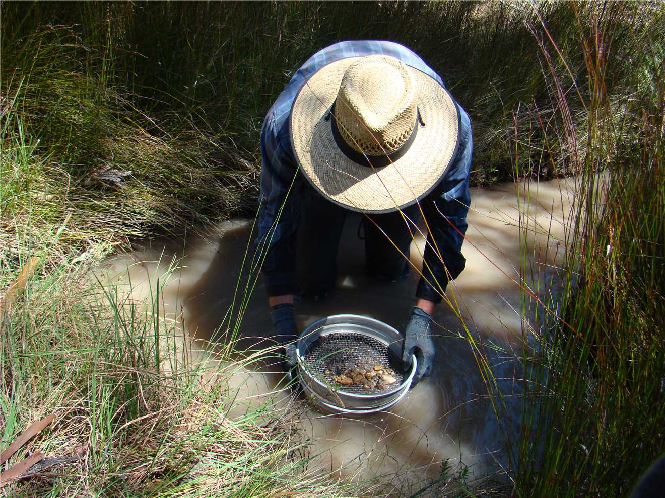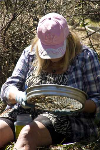 We parked our cars then The Captain and I walked along a couple of sections, before The Captain suggested a section to fossick, as he is the new Master (John The Baptist - Findem was the former Master), so I followed his advice and we carried our gear to the creek about 50 meters from the cars. I dug within the 2 square meter area in the creek for the whole day, you can see our haul below. Most of the time I was in chest deep (about 4ft) water, wearing my shoes, jeans, shirt, hat and gloves. The water temperature was 'slightly' cool but after a minute you were used to it, until it was time to get your nether region wet, but again you acclimatised to it, the water temperature wasn't a factor. It wasn't cold enough to wear my wetsuit, BUT it was to cold to wear Shazza's fluro green MANKINI, probably will be able to wear it in Powelltown, that should keep the ALFers happy. The Captain dug his spot about 3 meters from me and moved within a 5 meter area. Marg sat on the creek bank and as I filled the sieve, she checked and found our gems.