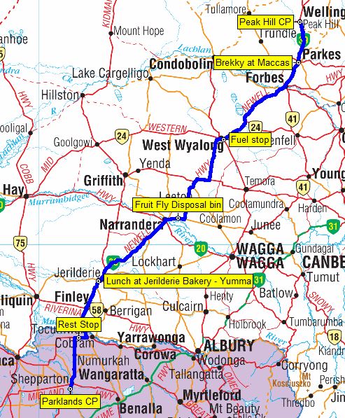 Overnight, there were a few drops of rain but nothing serious. I awoke at 5:30am and went and had a shower, Marg woke at 6:00am, we got ourselves and hit the road at 6:55am and headed towards Parkes for brekky at Maccas. Arrived at maccas at 7:33am, there were about 10 utes there, who were on their way to the Deni Ute Muster. Next stop was at West Wyalong for fuel arriving at 9:21am, we stopped at the Fruit Fly Disposal bin at 11:03am, then arrived at Jerilderie bakery for lunch at 12:37pm, stopped for our last rest stop at Strathmerton at 2:05pm, before arriving at Parklands CP, Shepparton at 3:00pm.