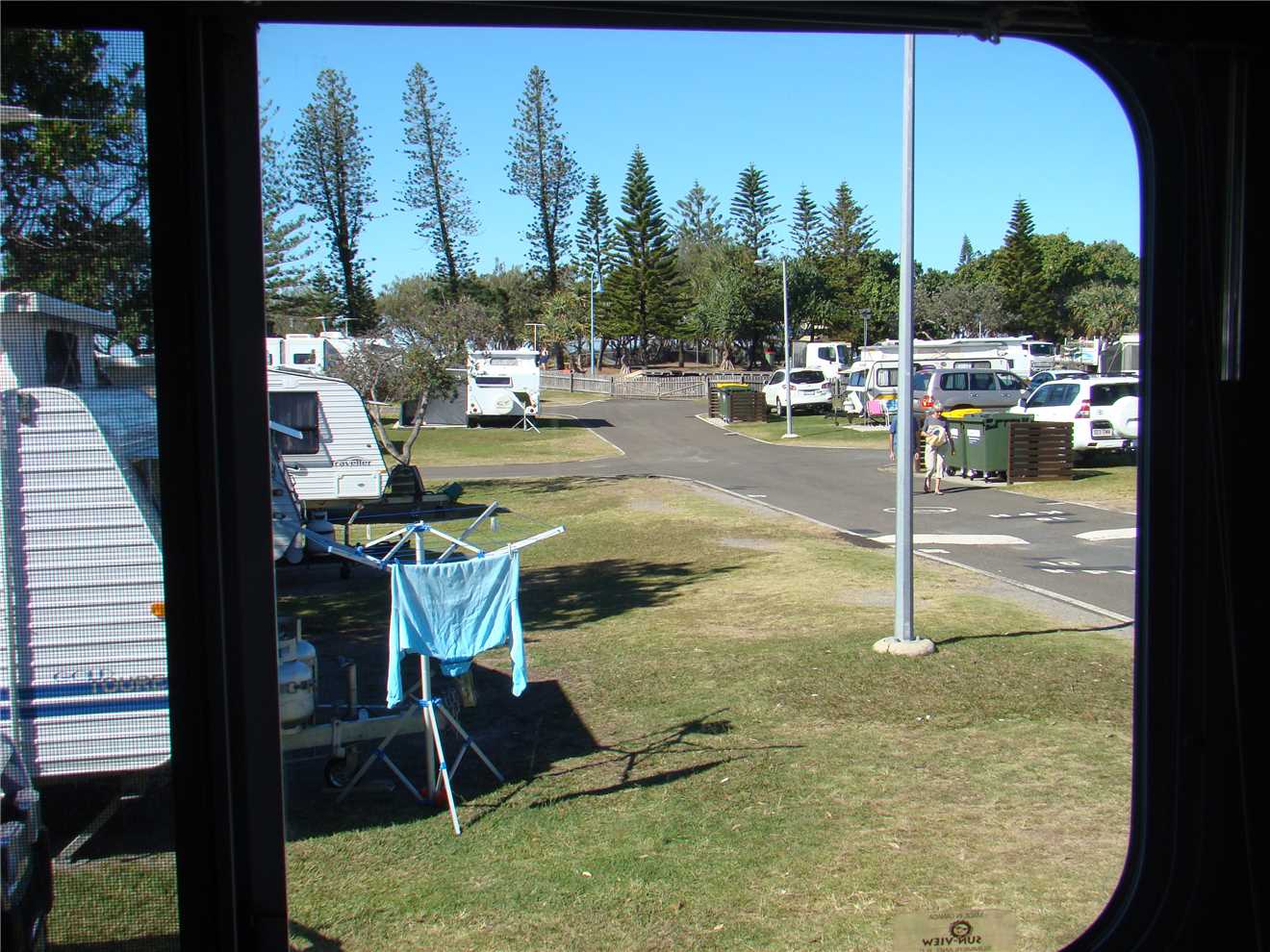 Back to normal at night, I awoke about 6:45am and Marg slept until after 7am. We watched Sunrise and heard about the plane being blown up. After getting ourselves organised we drove to Kawana Waters SC for a coffee and some food supplies. The forecast was for Huey to blow like buggery. Coming back to camp, it was a tad windy and when we got back, I decided to drop the awning and sides. It was a good decision, as the awning had just started to part company with the antiflap bars, so with Marg's help we did it without any damage. More than I can say about out neighbour 4 vans away, his awning is ripped and buggered, he wasn't there and someone tried to save it but it was too late. During this period, there were some very strong gusts (72kph).