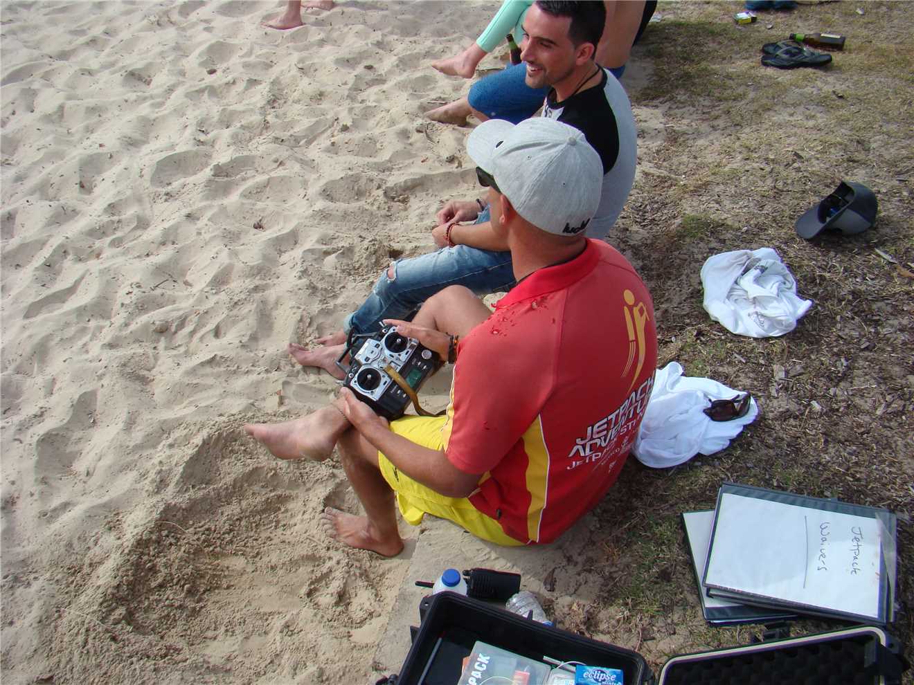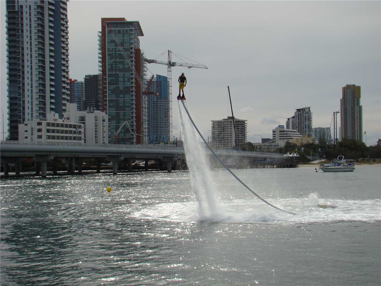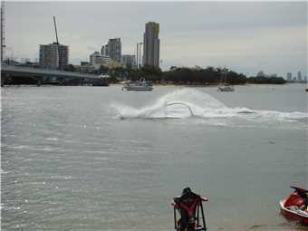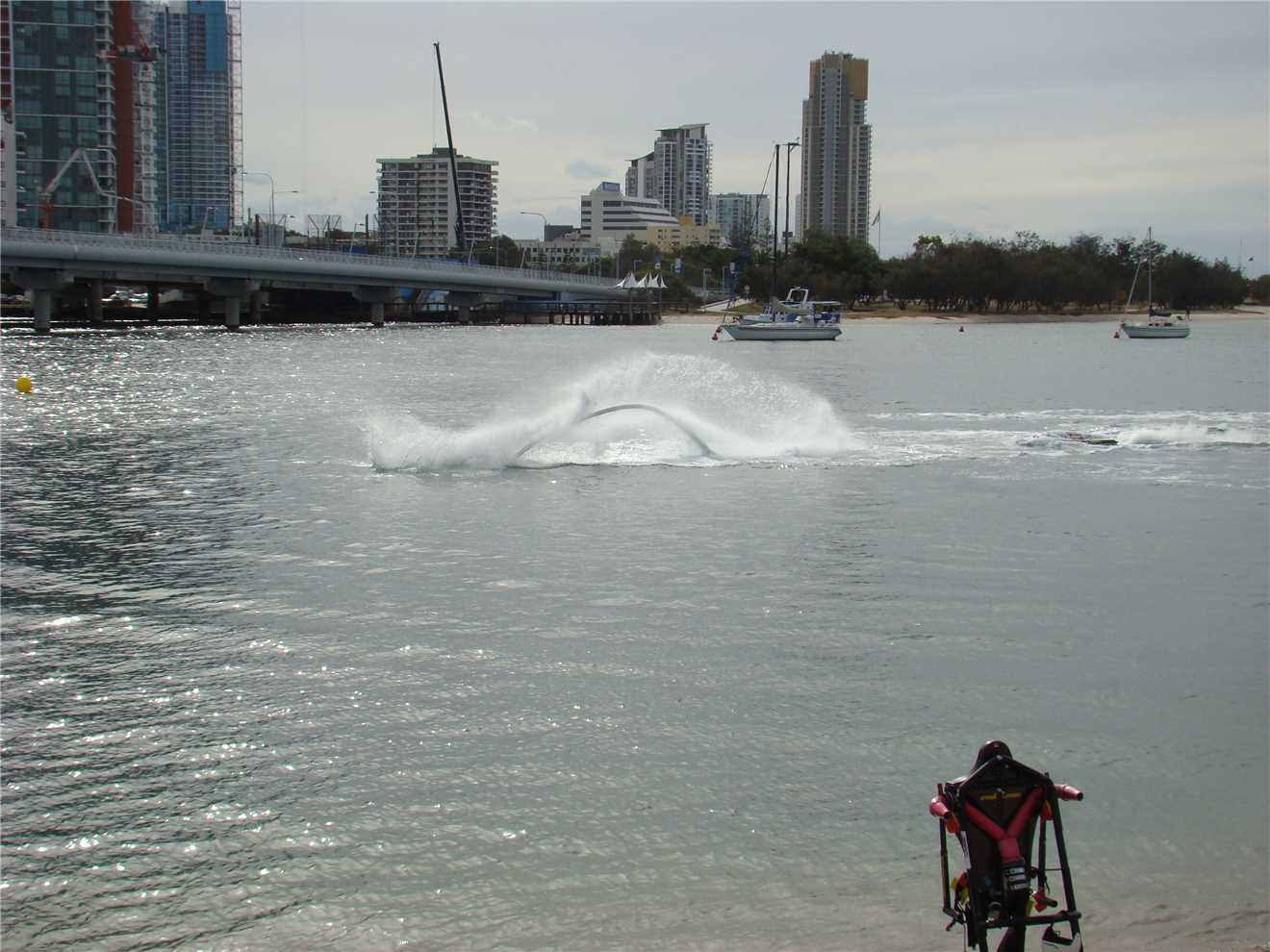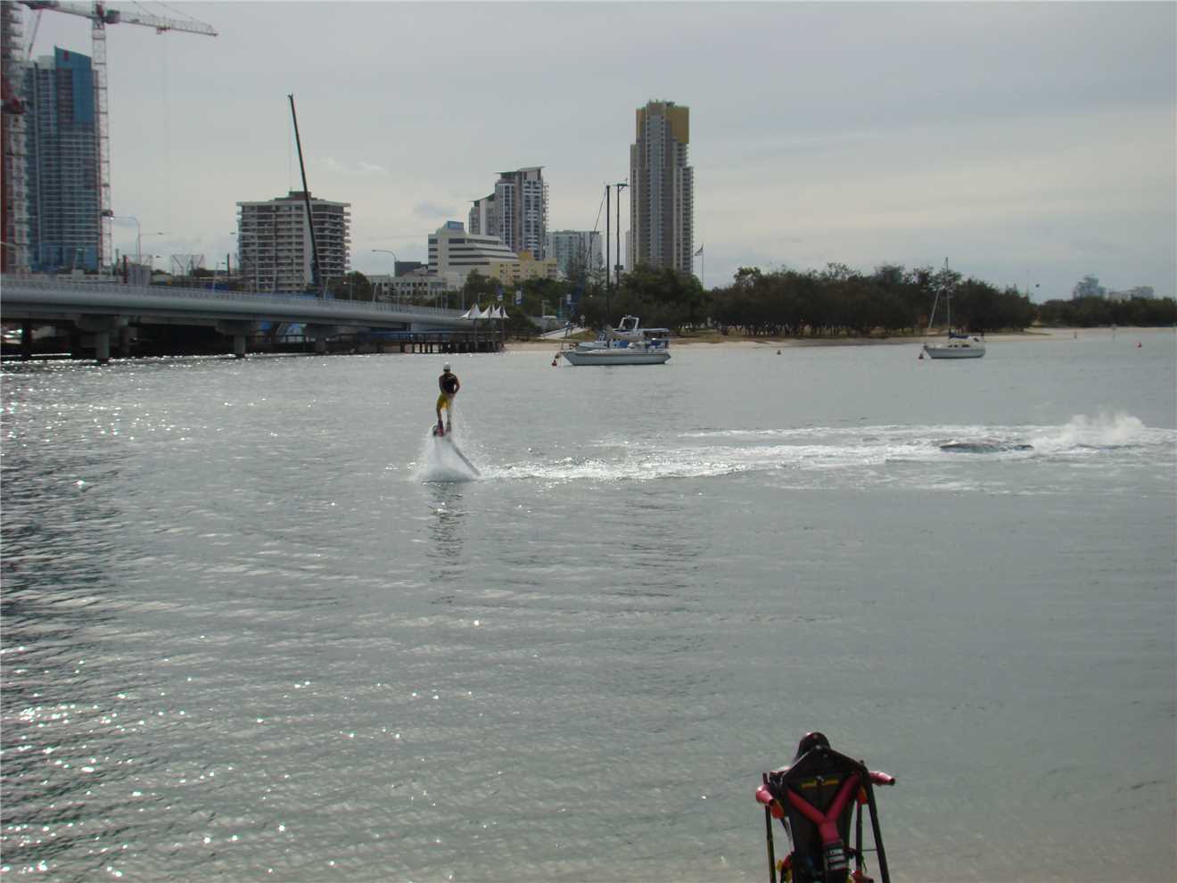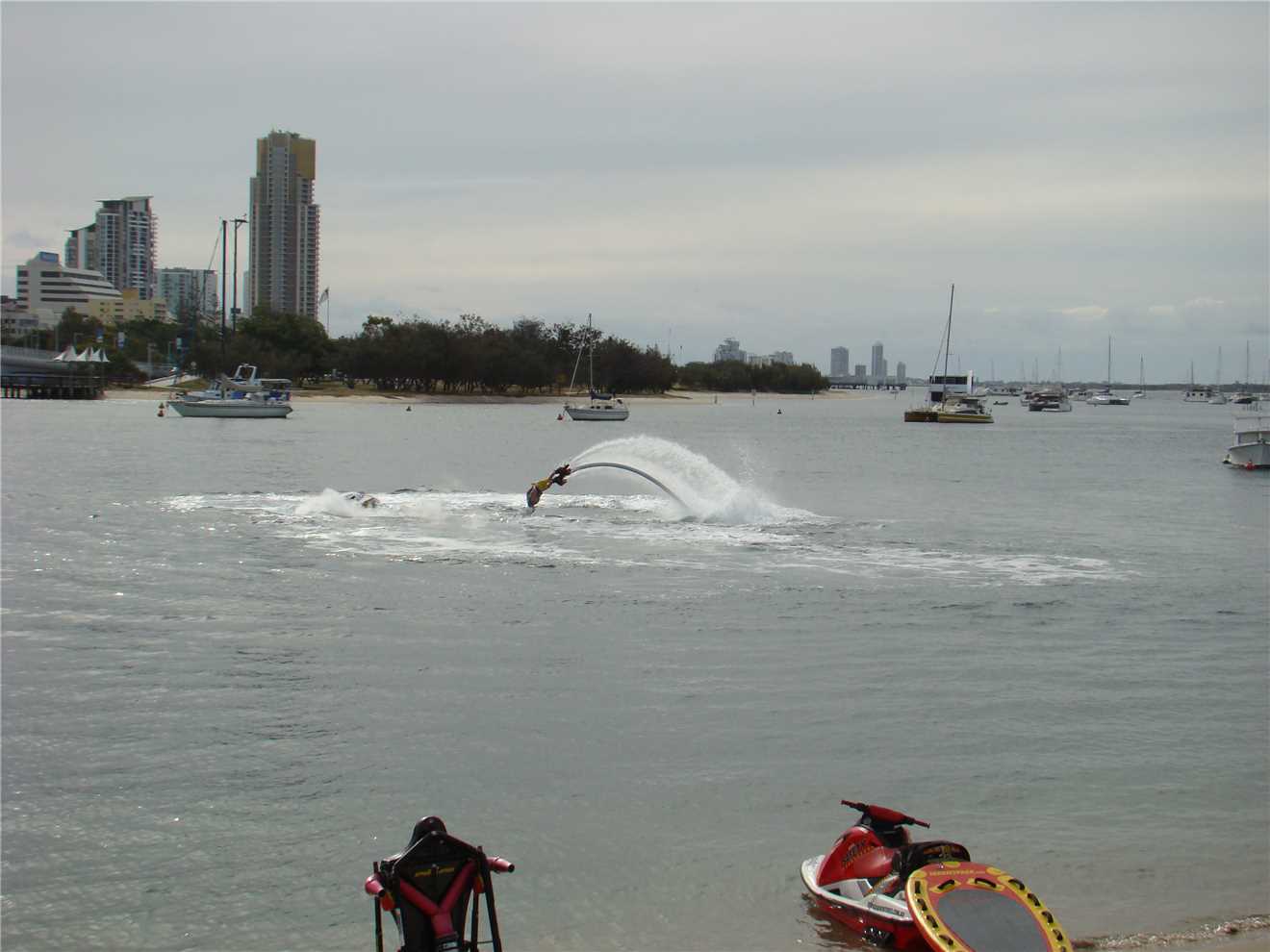 After Bingo, we drove to South Park and had lunch at Michels, Marg had sausage rolls, while I had 2 pies they were very yumma. We are expecting about 50mm of rain in the next 2 days. Back at camp, the sky looked OK, so I went riding. My usual route, the highlight was seeing the black snake sunning itself on the rocks of the seawall. I glimpsed it as I rode past and immediately stopped to take a photo, but I only saw it slither into a crevase before I could photo it. Just near the Nerang river, I stopped and watched 'The Jetman' practising various tricks. I liked his dolphin routine, where he dived under the water and then out of it. It looked good.