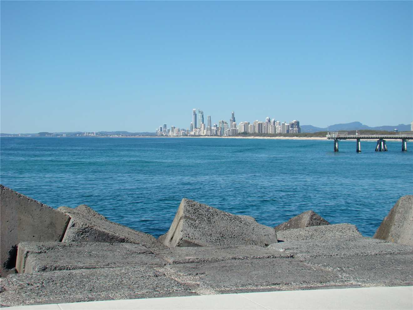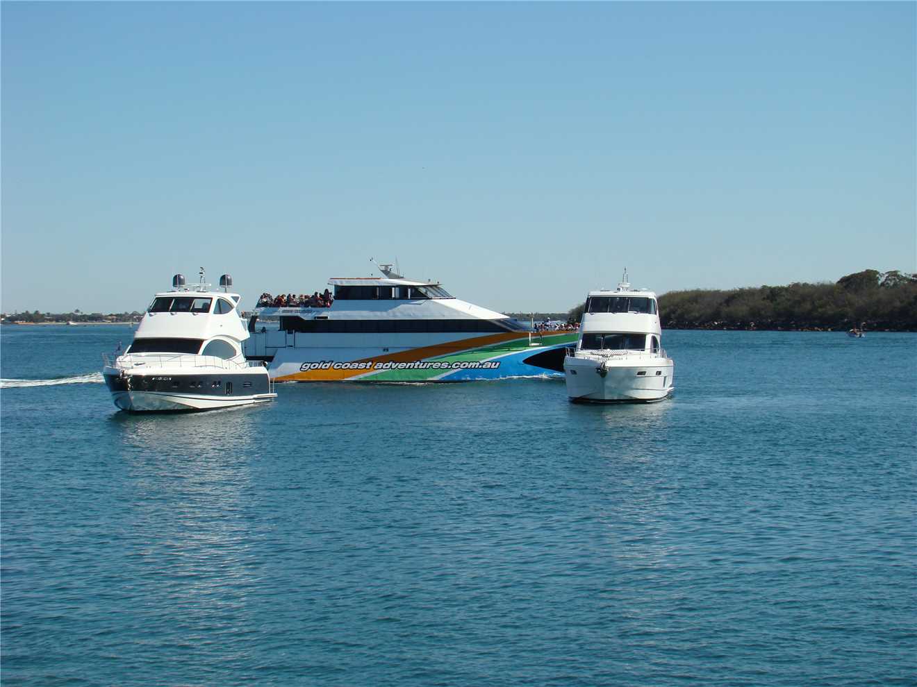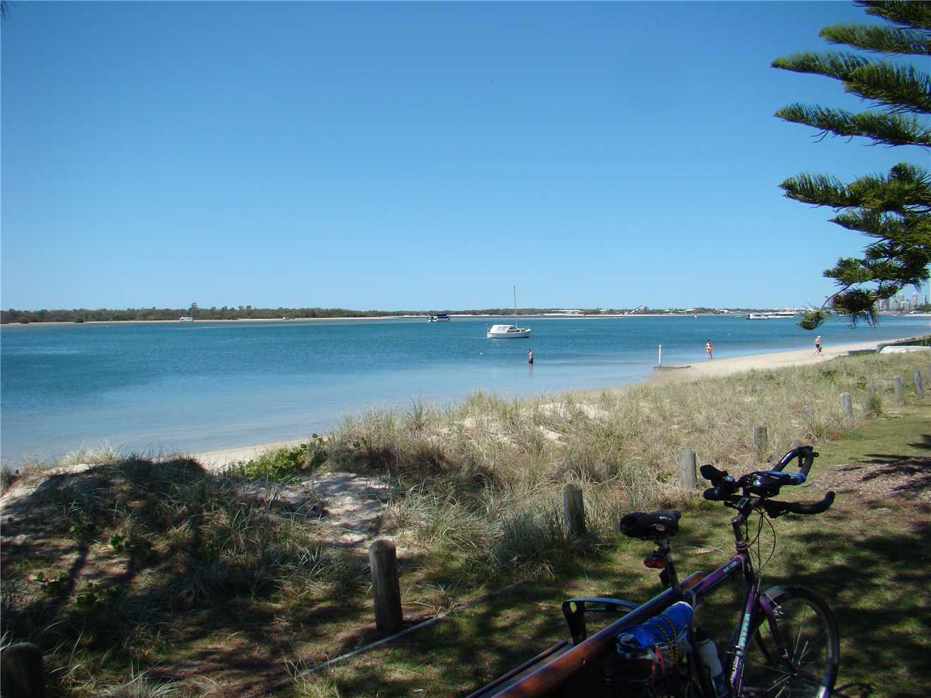 I slept very well until 6:30am, then listened to Macca until 7:00am when I got up and had brekky, while Marg slept like a log. I was meeting Crusty and Annie at 9:15am for a ride to The Spit and back to Labrador for coffee. I changed into cycleman and left camp at 8:00am and rode to Surfers and then back to Lands End before meeting Crusty and Annie in Labrador. We met as planned and rode along the shared paths to The Spit where we gazed out over the ocean and watched a very nice BIG boat power through the seaway into the Broadwater. It was another magic day in Paradise. We headed back along the gravel Federation Walk and back along the shared path to