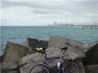 At 9:00am I changed into cycleman and wanted to ride over 50kms as I didn't ride yesterday, so I rode to Lands End then to The Spit, down to Surfers back to Lands End before heading back to camp. For the second day in a row, the weather was superb, sunny with a medium breeze. A major drama at The Spit, I sat on the concrete boulders and I had to undo my bumbag to get my bananas out. As I stood up my bumbag fell to the ground and fell down one of the holes in the concrete boulders. I looked down and my bumbag had fallen about 6 feet down the hole. I was absolutely .