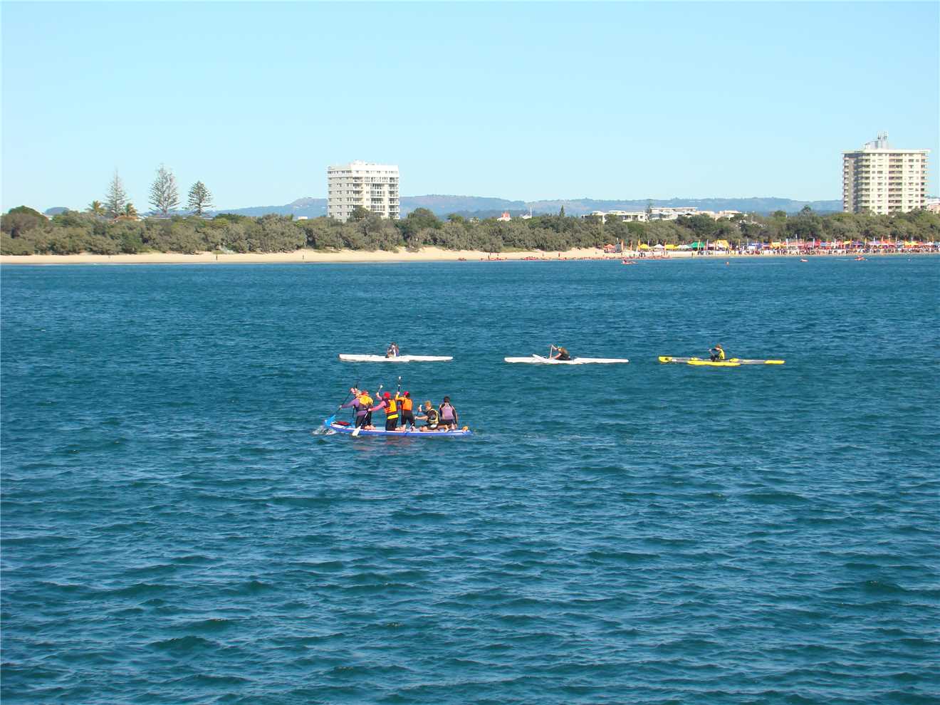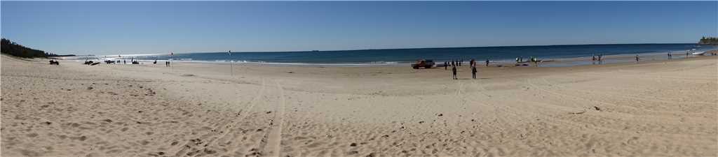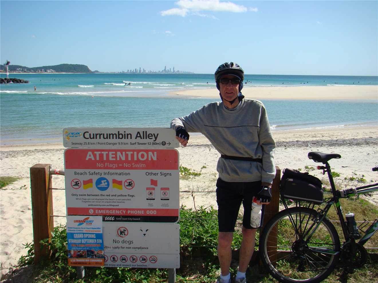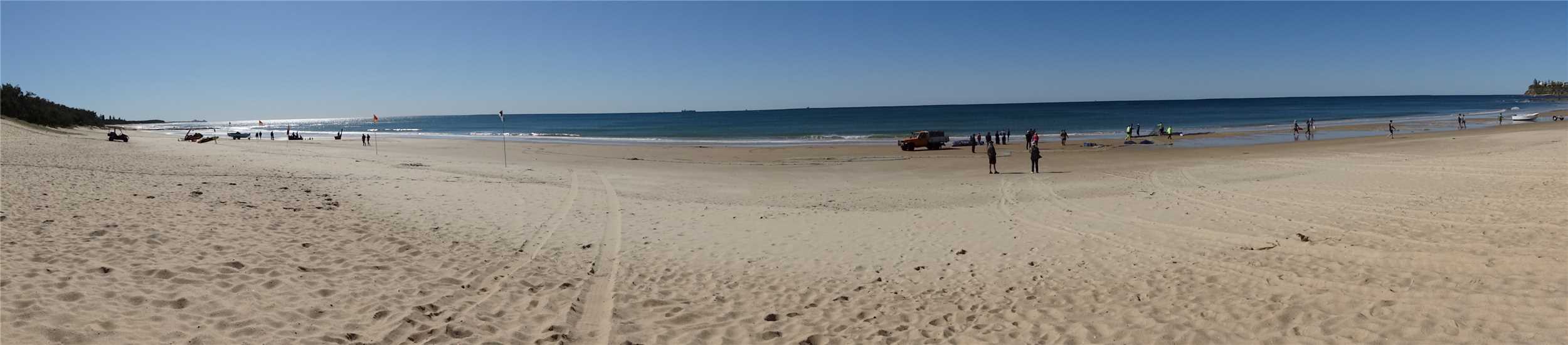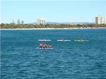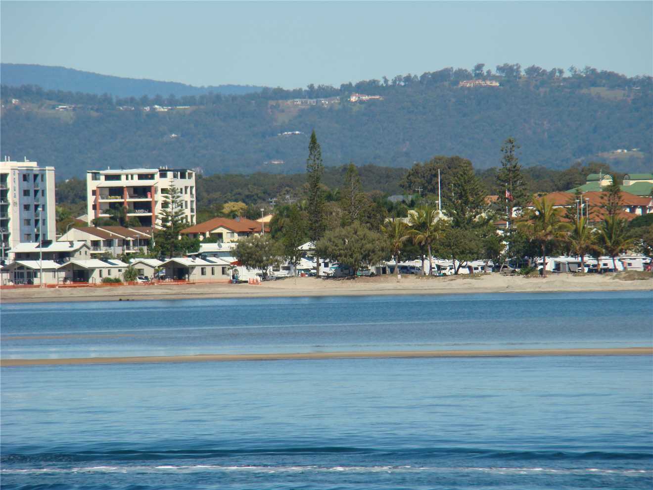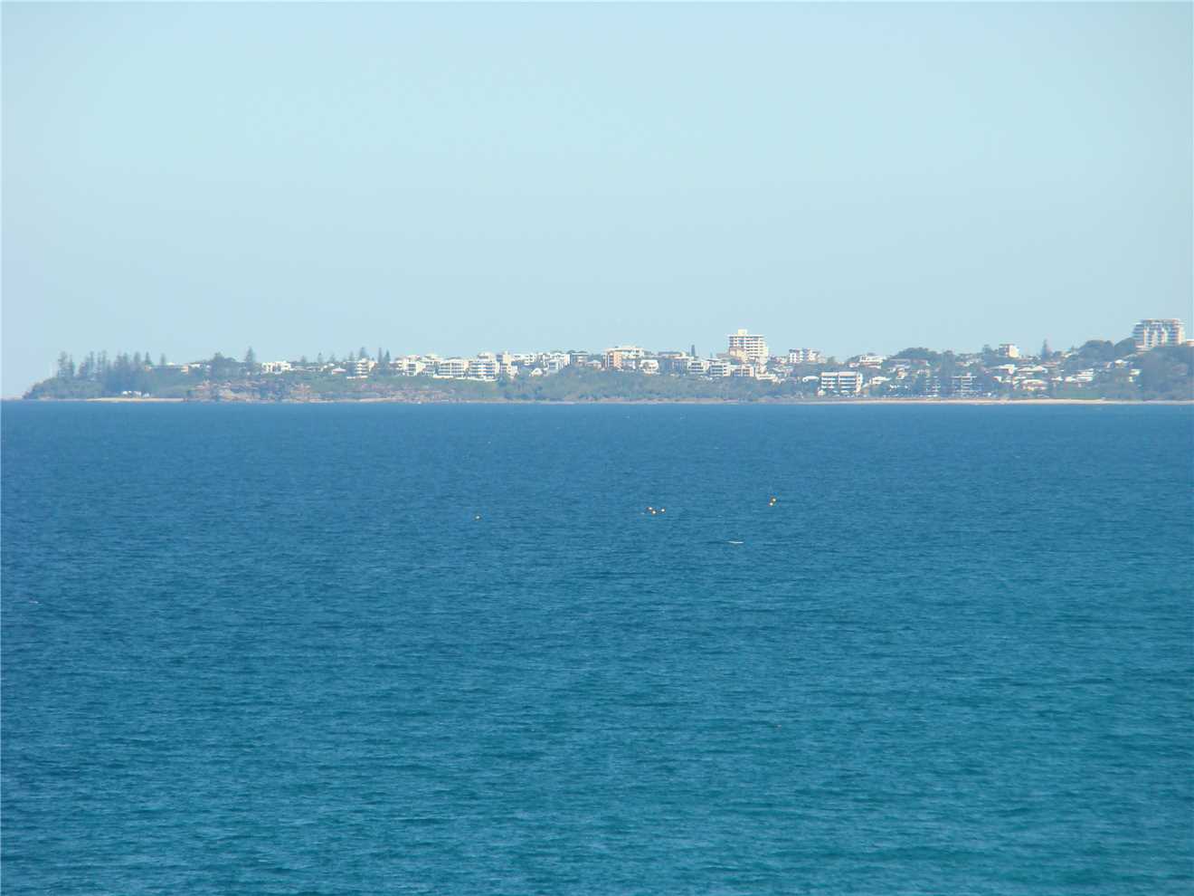 Out the front of our Caravan Park. Caloundra on the far RHS. Red and Yellow flags on the LHS.