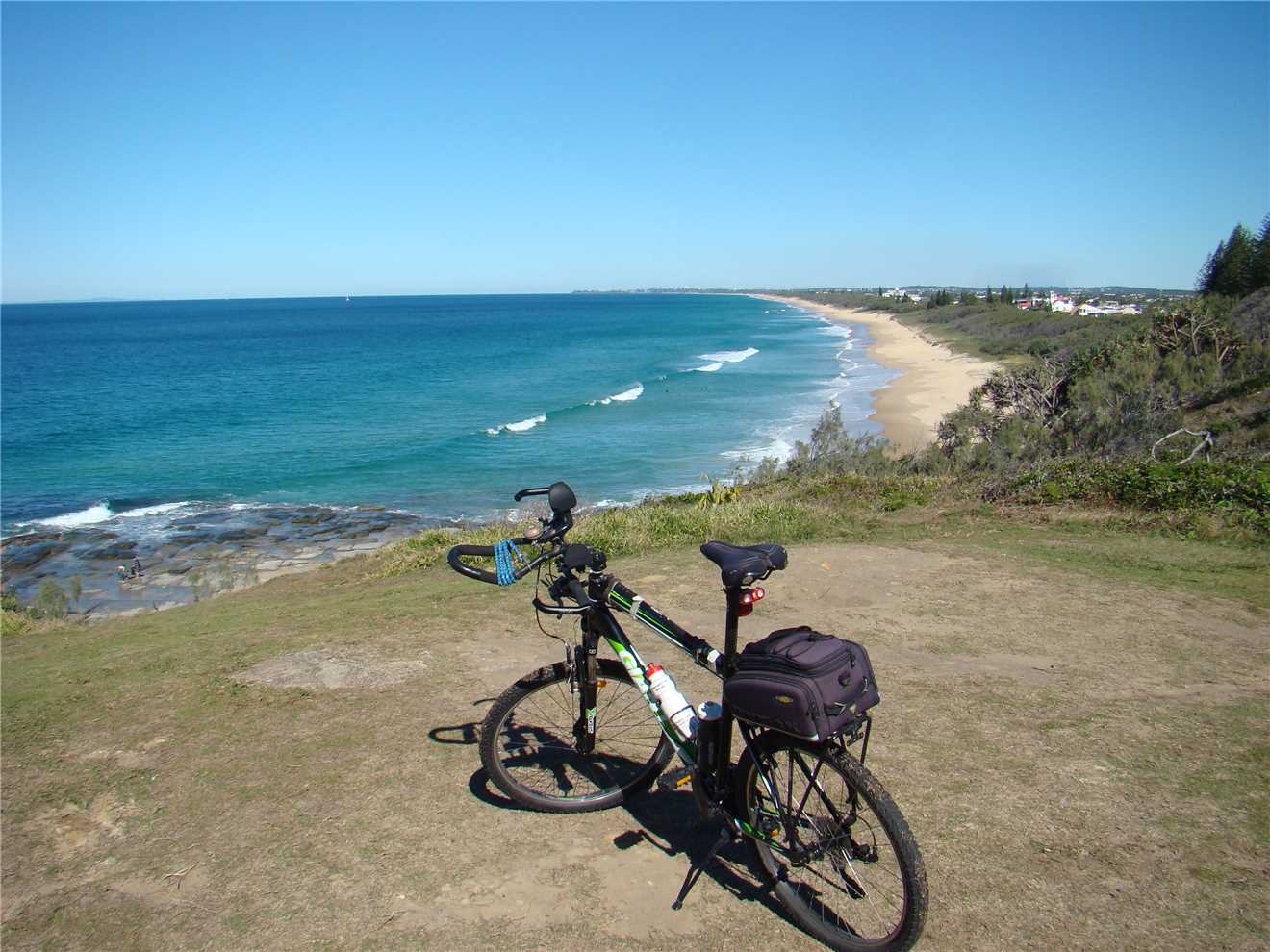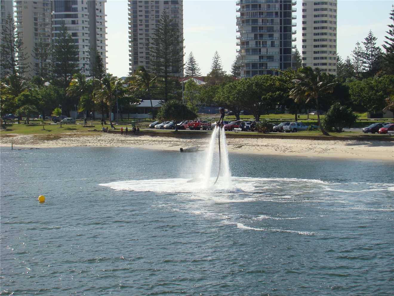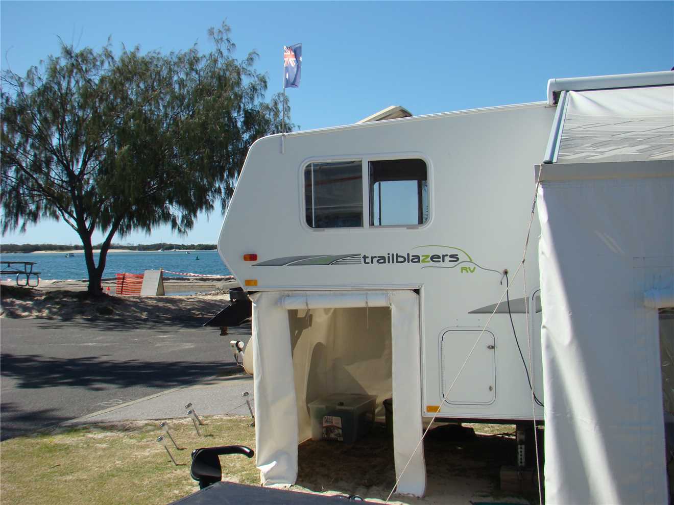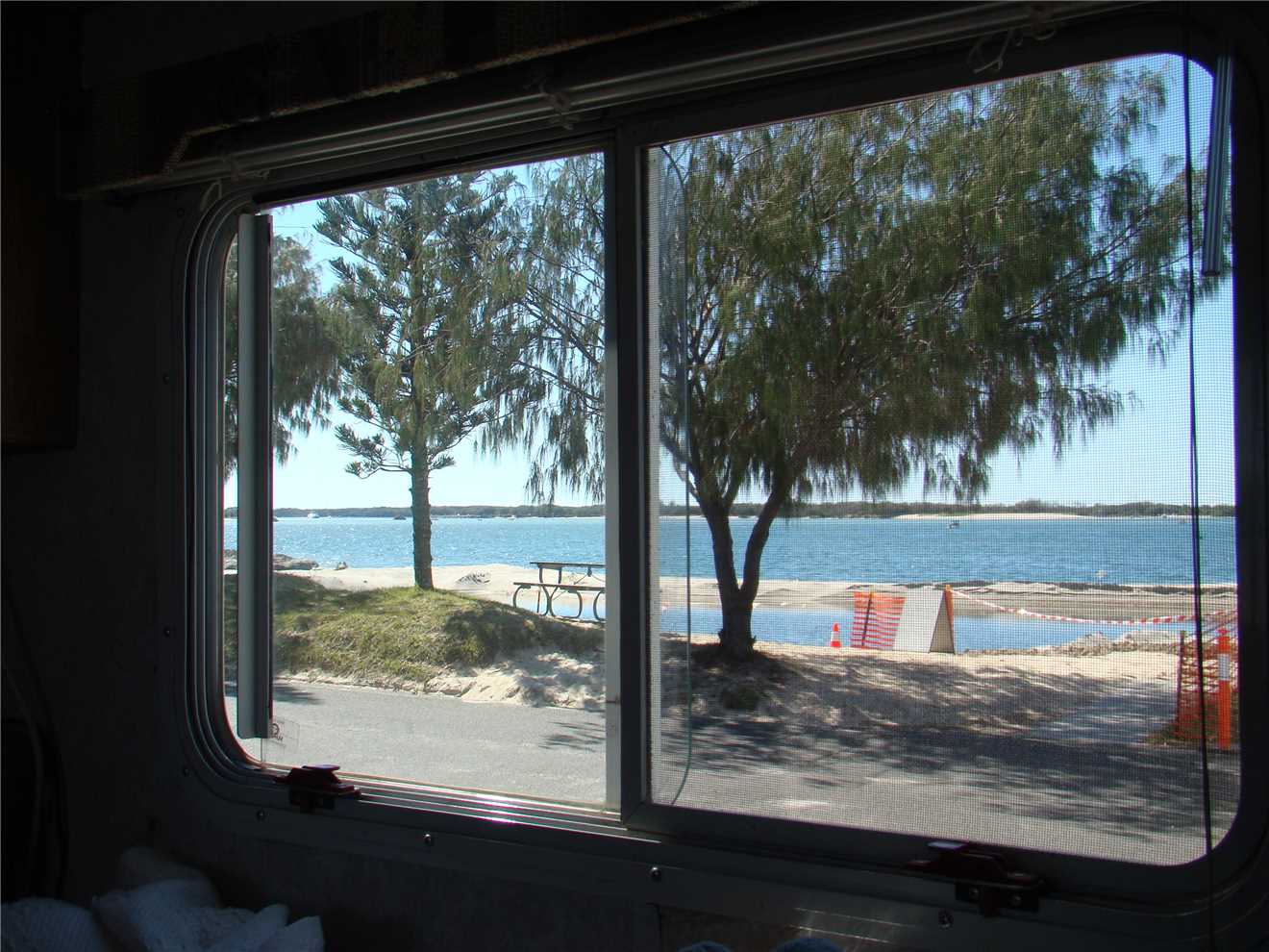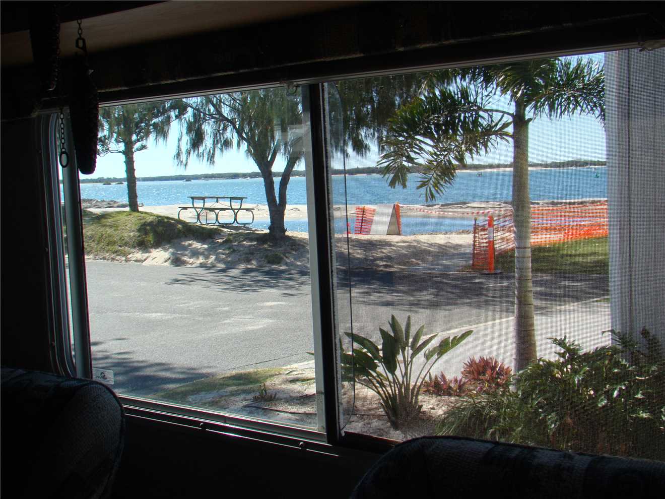 Out the front of our Caravan Park. Caloundra on the far RHS. Red and Yellow flags on the LHS.