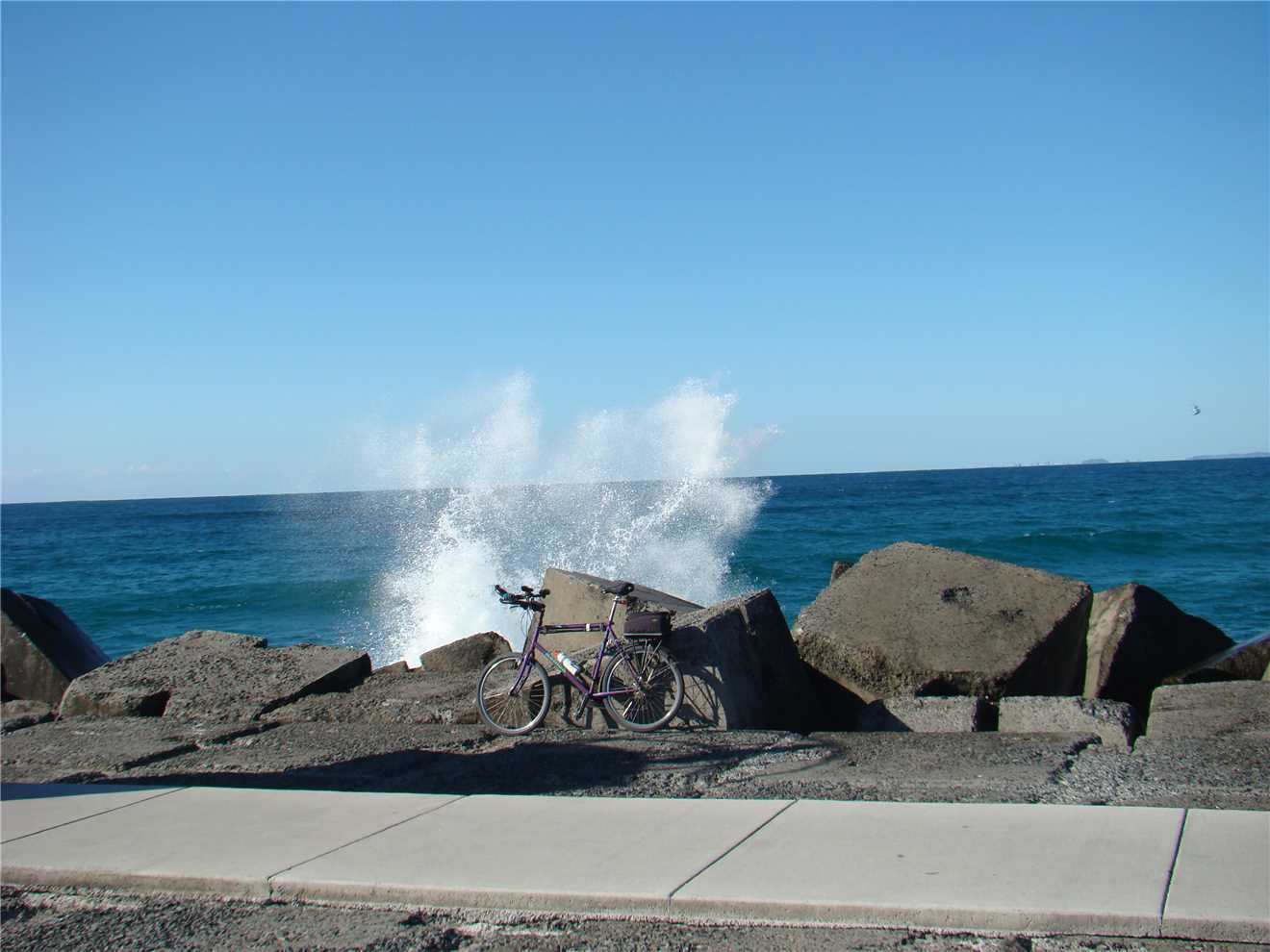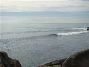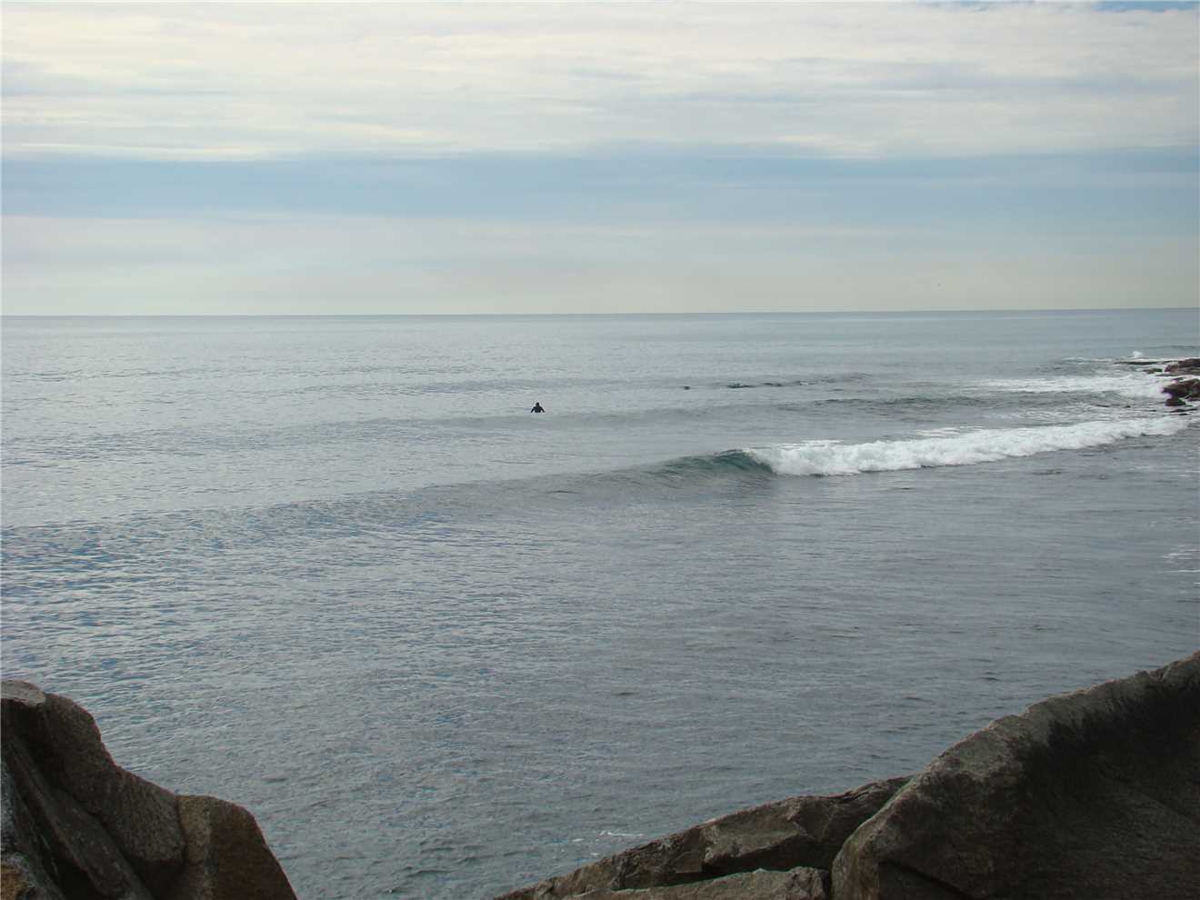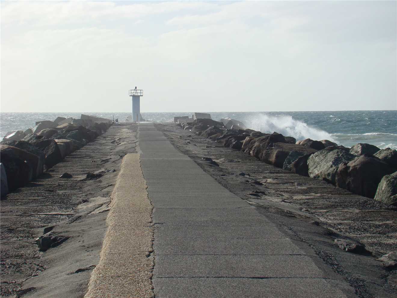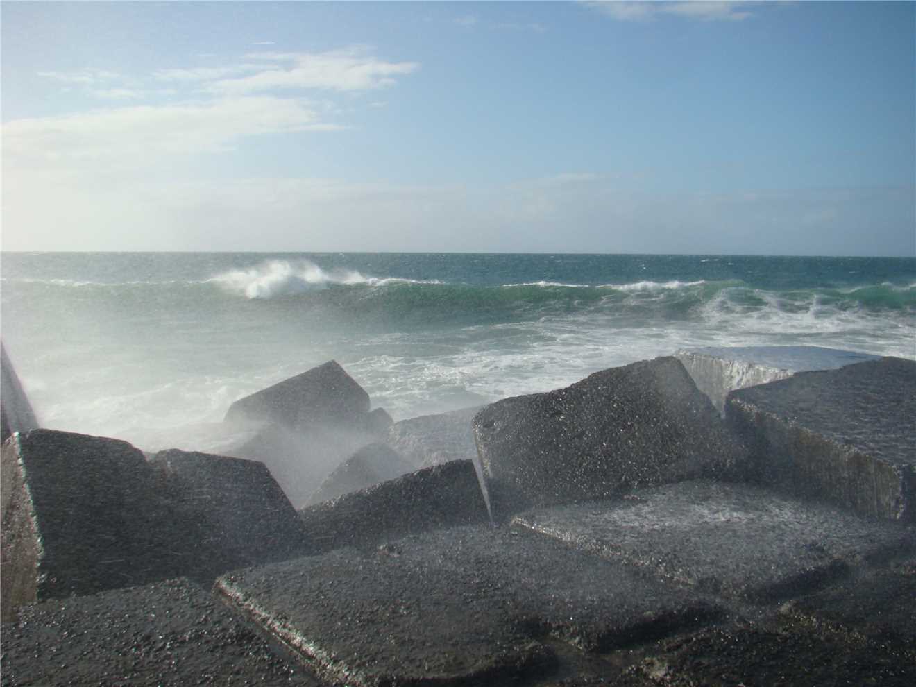 With the odd wave breaking over the seawall.