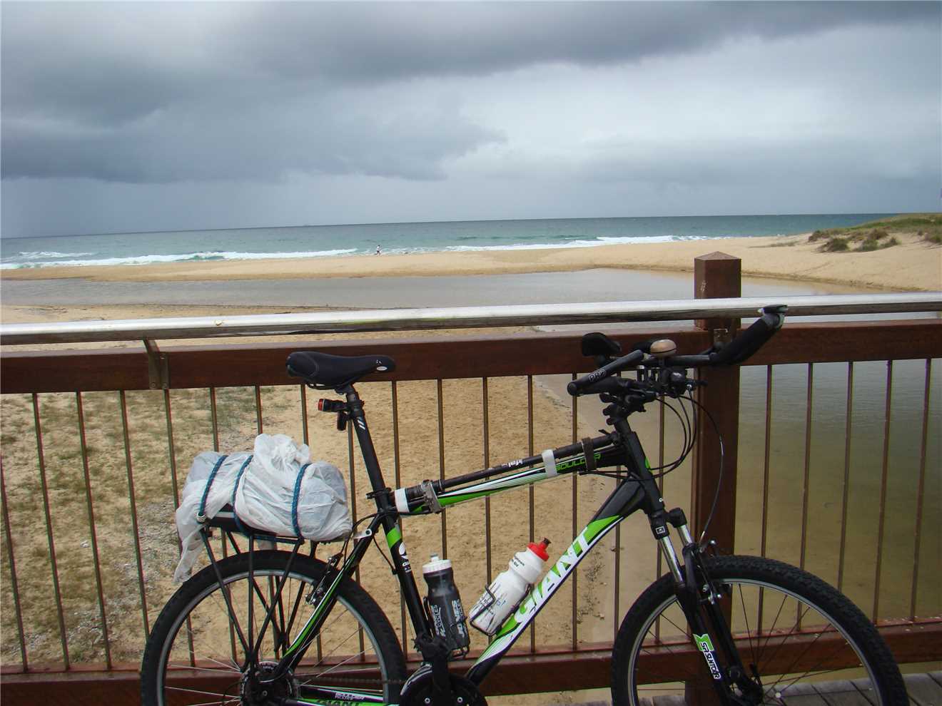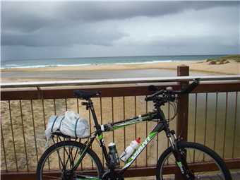Dad and my 'new' treadley. Surfers in the background.