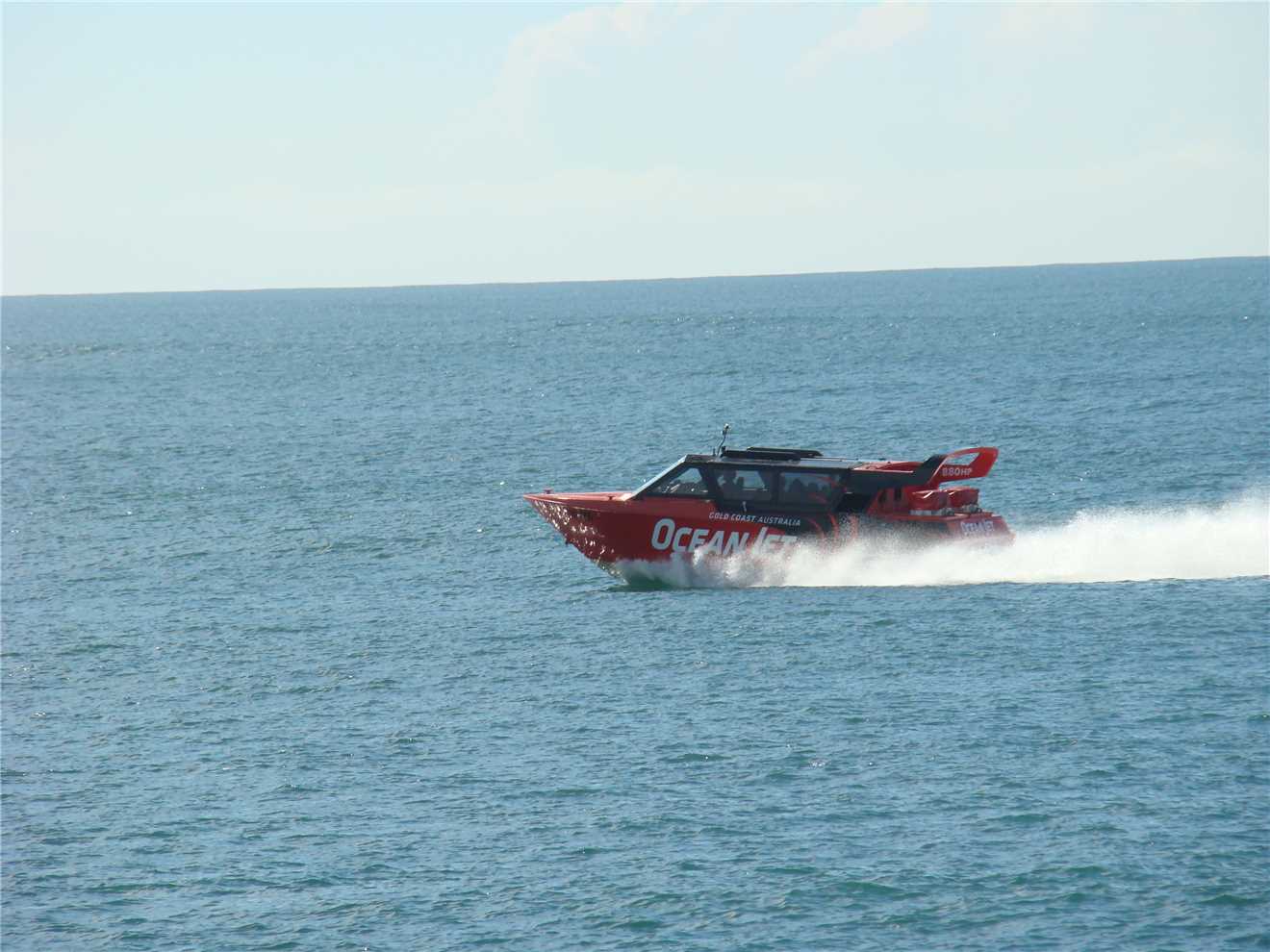 We slept well until 6:45am. I got up and went on the internet, while Marg watched 'Weekend Sunrise'. I had brekky and left Marg in bed as I changed into 'cycleman' and wanted a short ride, just my normal Surfers, The Spit to Lands End and back to camp about 34kms. The wind was howling from the South, so I left camp and headed south to Surfers into the breeze, turned around at Laycock Ave and headed along the shared path to the Spit. Rode out to the end of The Spit in between the wave sets coming through. Due to the waves and amount of spray, I couldn't sit on 'my rock' and eat my bananas, SO I didn't. I managed to take a few photos by standing in the lee of the beacon. It did protect me slightly from the spray. After leaving the Spit, I saw that the Jetman was 'playing' out on the Broadwater near the Nerang river bridge. To finish this ride, I headed past the camp upto my Lands End turnaround and then finished with a 4km ride into the gale back to camp. A total of approx 34kms.