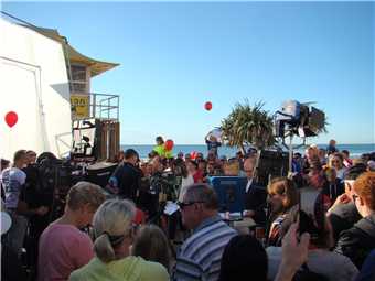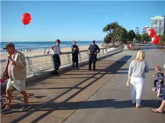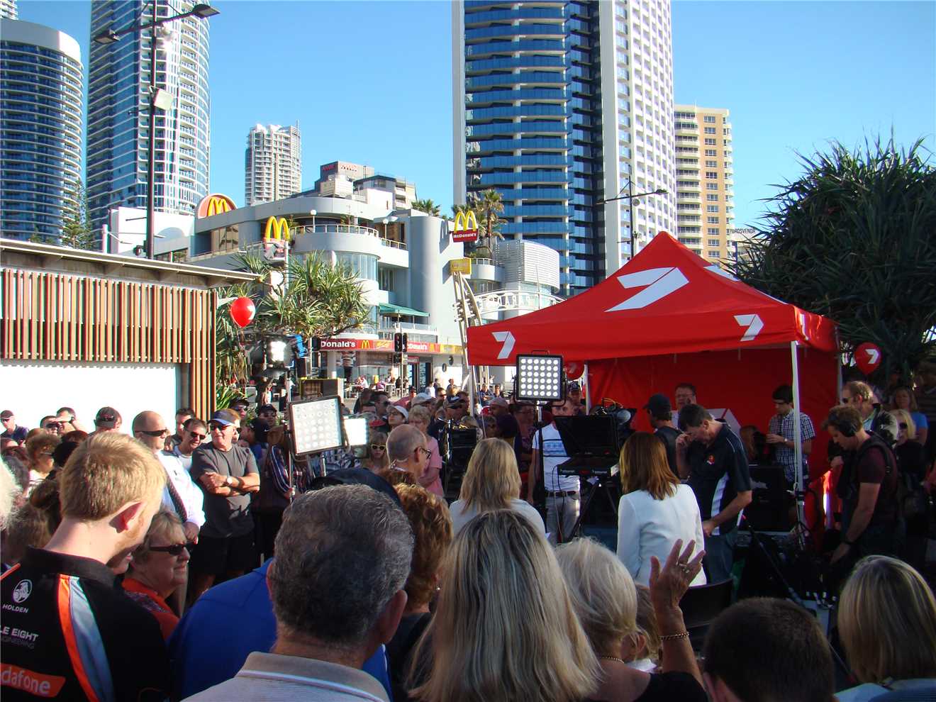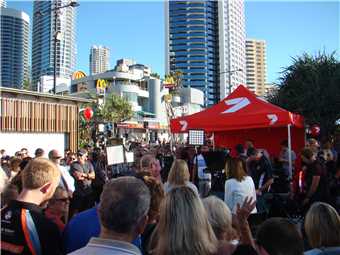 We slept well until 7:00am. I got up and went on the internet, while Marg watched 'Sunrise'. Do you see a pattern developing here? I had brekky and left Marg in bed as I changed into 'cycleman' and wanting to ride to the Currumbin Creek at Palm Beach. SO I headed off southward, stopping at Surfers, on orders from Marg and take some photos of the Ch7 Sunrise being televised from the Surfers Esplanade. After a few photos, I continued to Robbie's cafe, it was half full or half empty, BUT I continued onto Burleigh Heads and then the whole way to the mouth of the Currumbin creek. This was my turnaround point and I headed back to Robbie's cafe BUT it was nearly full, so I decided to have my coffee at Cafe Rockpool. I continued through Broadbeach, through Surfers onto the Spit where I ate my 2 bananas and then rode over to cafe Rockpool, where I had a coffee and a choccy muffin (it was YUMMA). I forgot my iphone cable and my iphone was nearly flat, SO I called into camp and picked up the cable and plugged my iphone into my battery pack and continued passed George and his mates and turned around at Lands End. Marg thought I was mad, calling in and continuing on my ride BUT I wanted to ride from camp to Currumbin Ck to The Spit and to Lands End and back to camp. A total of 68.9kms.