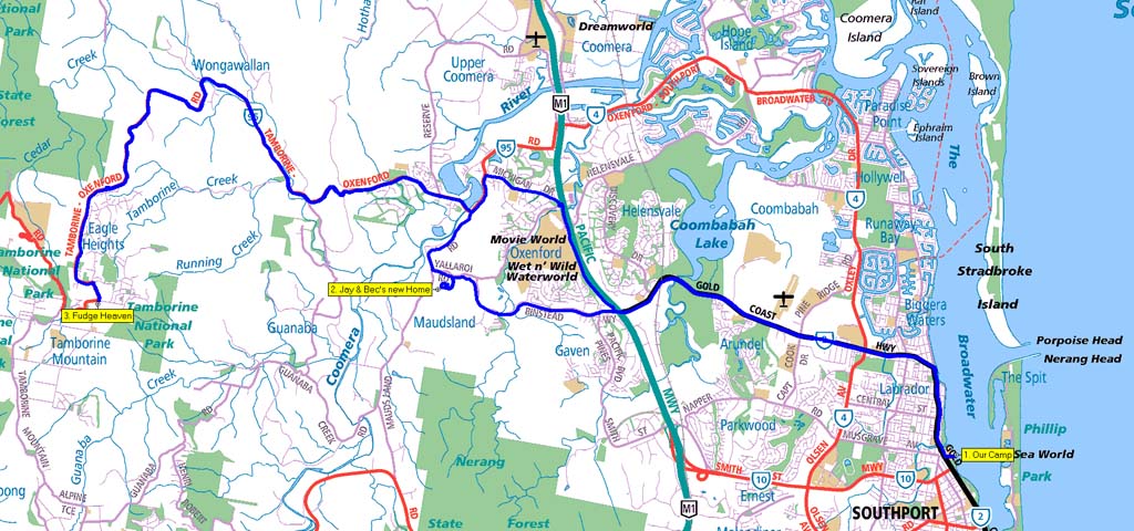 Our route to Mt Tambourine via Jay and Bec's new shack.