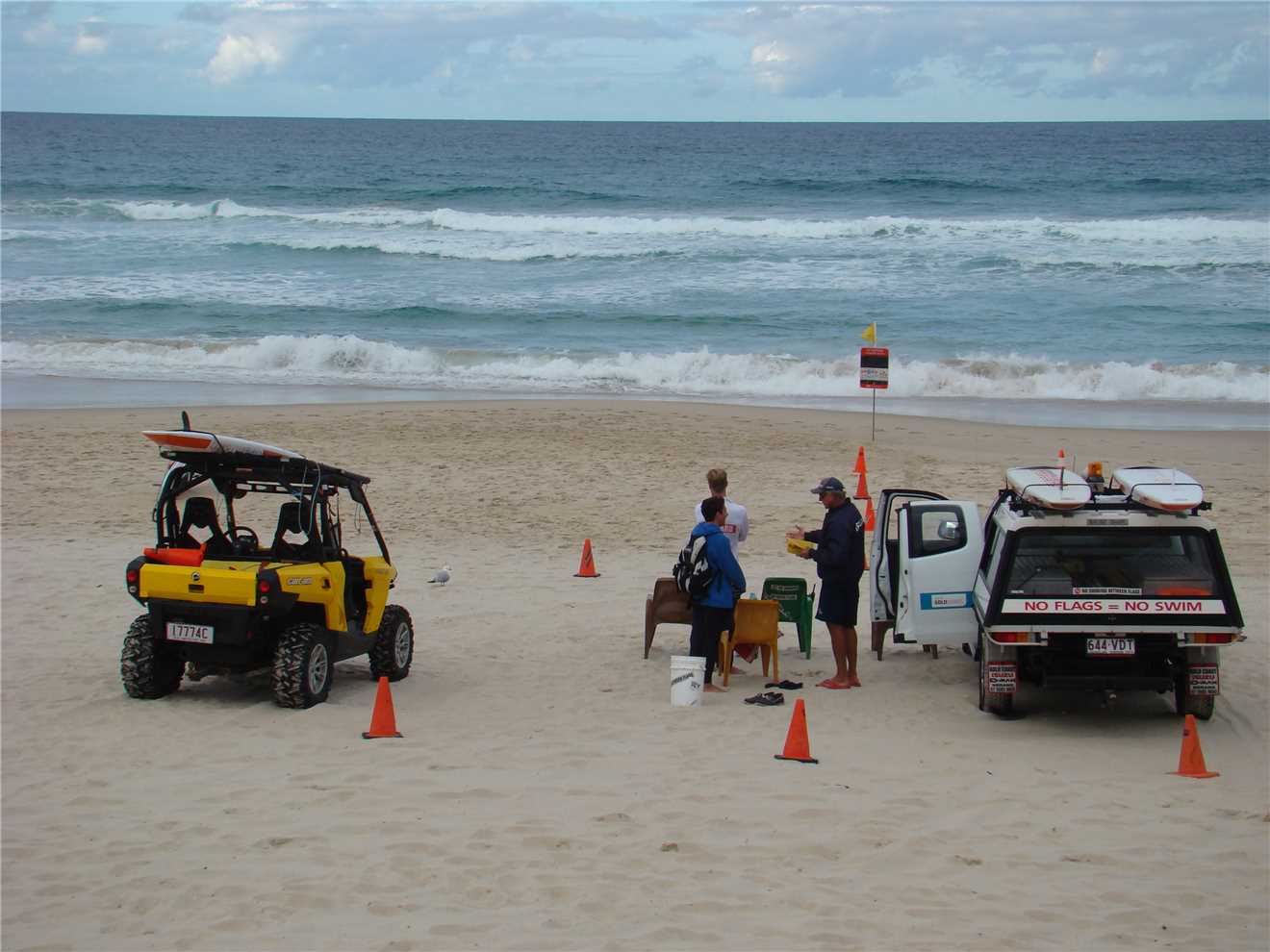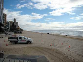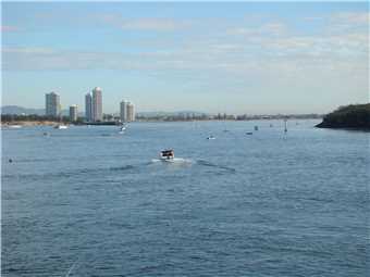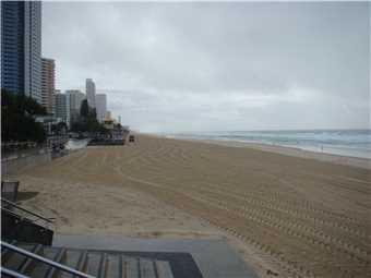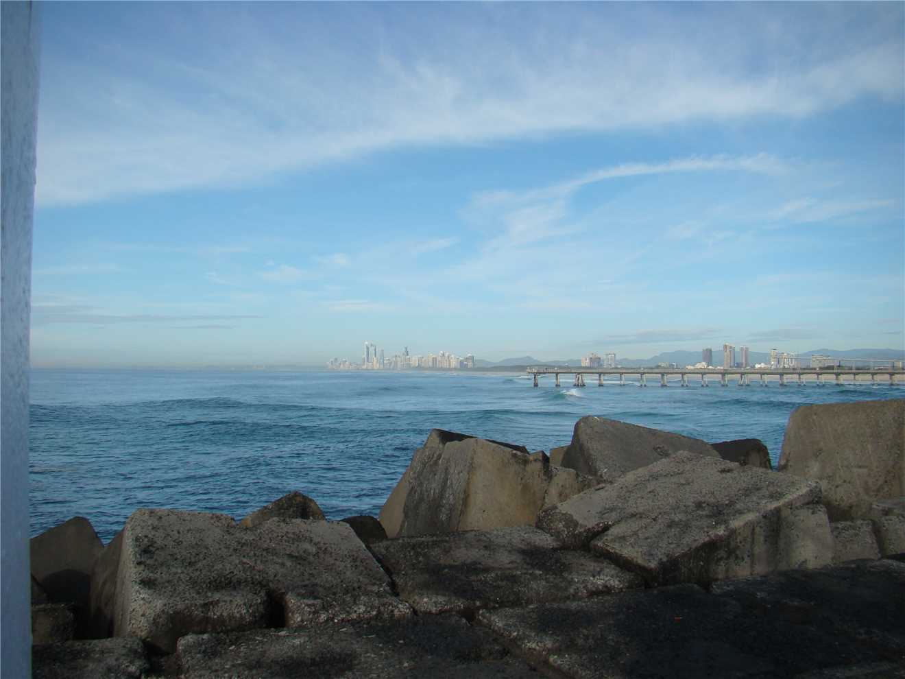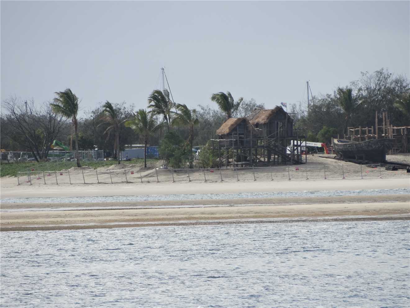 I rode to Burleigh Heads having a coffee at Robbie's cafe, rode back through Surfers stopping at the Spit where I ate my bananas and watched the surfer taxi, take surfers to South Straddy for $6 return trip. I stopped at the Pirates 5 movie set at the other end of the Spit and spoke to Costa (Gate keeper) for about 15 minutes, he wasn't too busy. Left Costa and headed to Lands End and then back to camp.