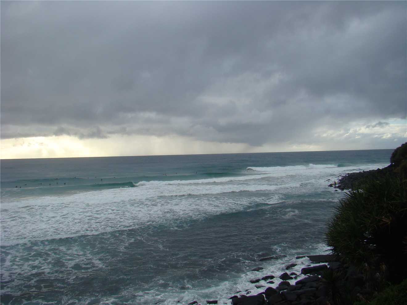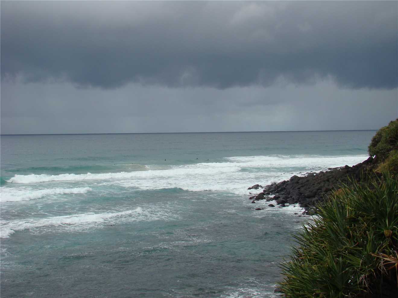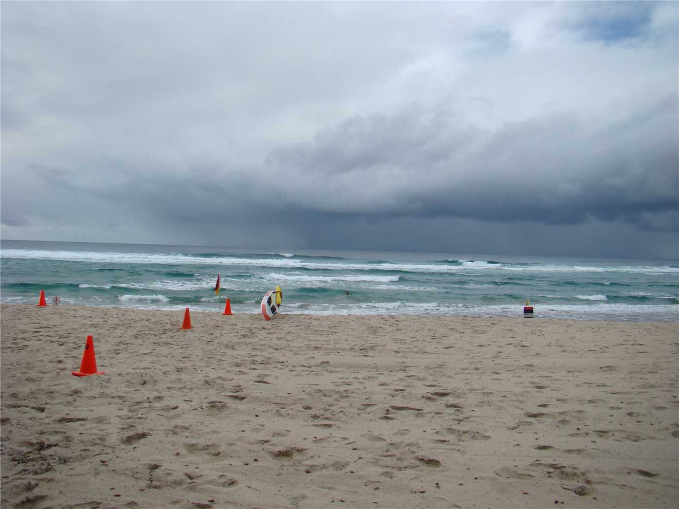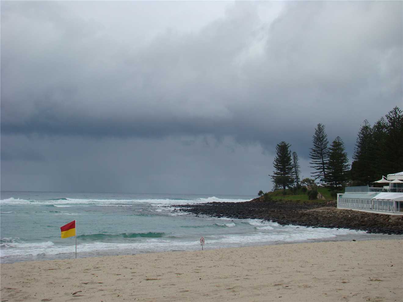 Back at camp at lunchtime, Marg was going to bugger about at camp, while I went riding, even though there were many rain squalls coming over the water. I rode south into a very strong headwind with gusts to 70kph and made my way to Burleigh Heads, where a big black front was making landfall. I headed to Robbie's cafe for a coffee and while there, the heavens opened up, SO I put on my wet weather gear and with the wind blowing me homeward, it was a very pleasant ride, even though, it was raining, unlike Melbourne, it was warm riding in the rain. I still rode to the Spit and it was very rough. Due to the strong wind, I didn't ride to Lands End and proceeded from the Spit directly back to camp.
