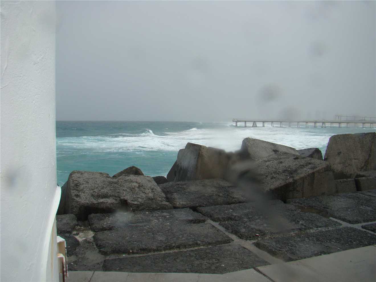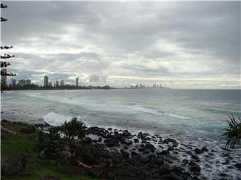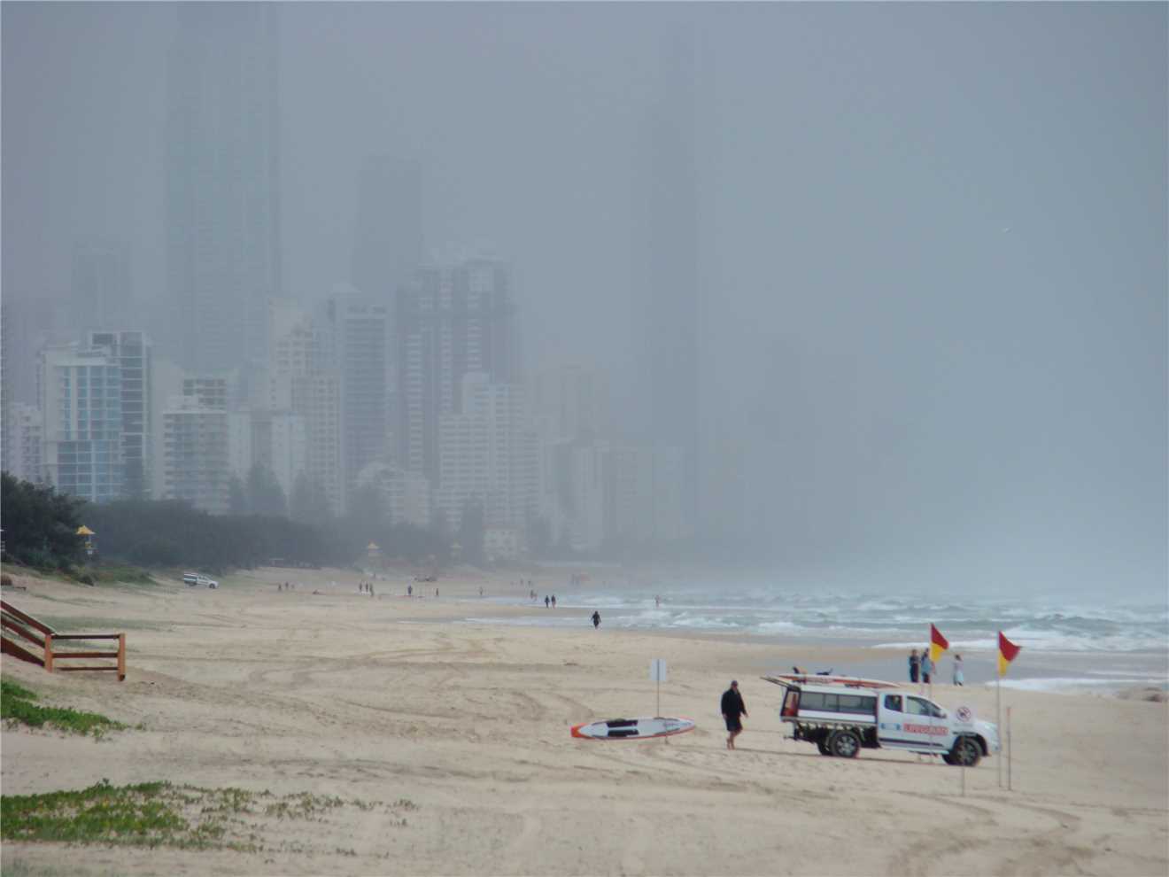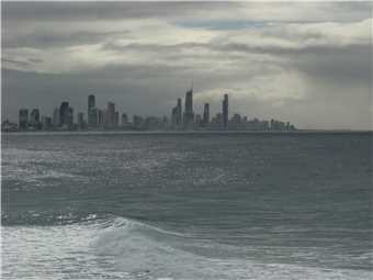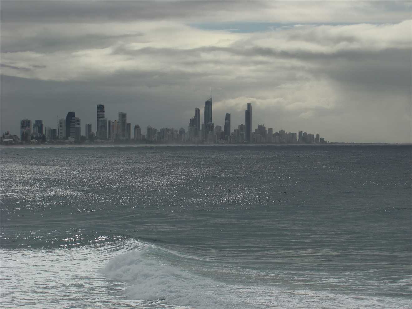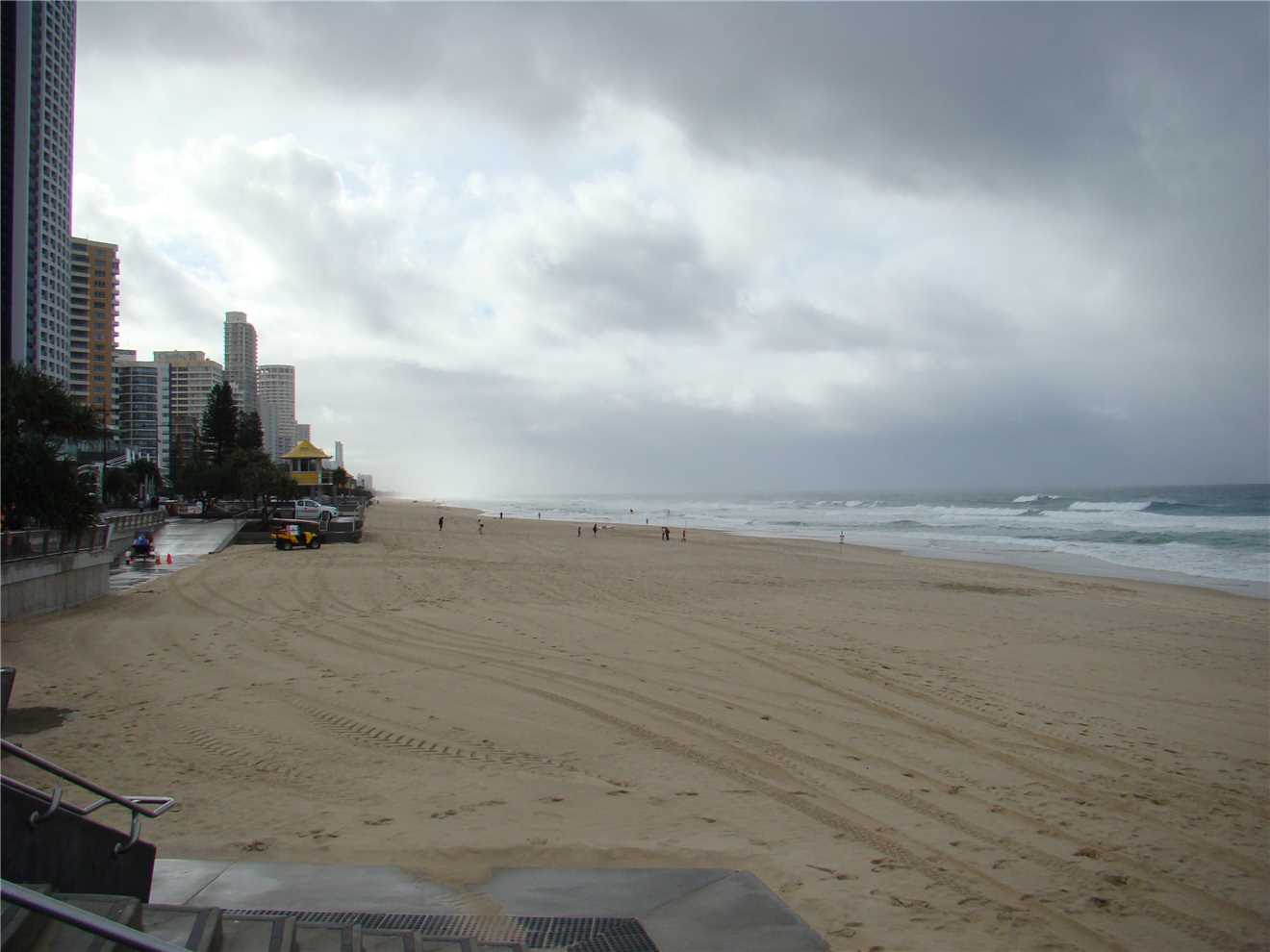 Back at camp at lunchtime, Marg was going to bugger about at camp, while I went riding, even though there were many rain squalls coming over the water. I rode south into a very strong headwind with gusts to 70kph and made my way to Burleigh Heads, where a big black front was making landfall. I headed to Robbie's cafe for a coffee and while there, the heavens opened up, SO I put on my wet weather gear and with the wind blowing me homeward, it was a very pleasant ride, even though, it was raining, unlike Melbourne, it was warm riding in the rain. I still rode to the Spit and it was very rough. Due to the strong wind, I didn't ride to Lands End and proceeded from the Spit directly back to camp.