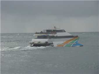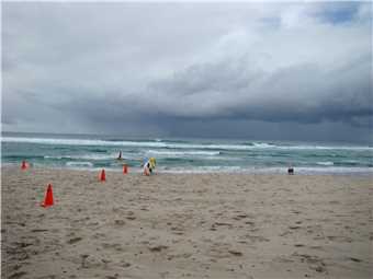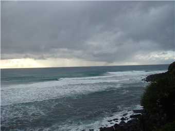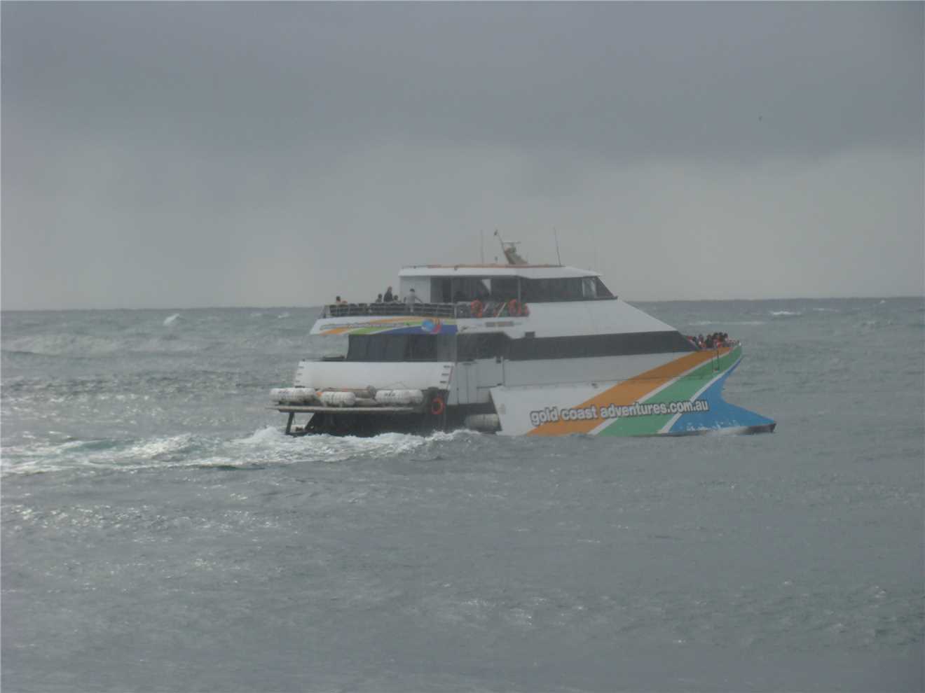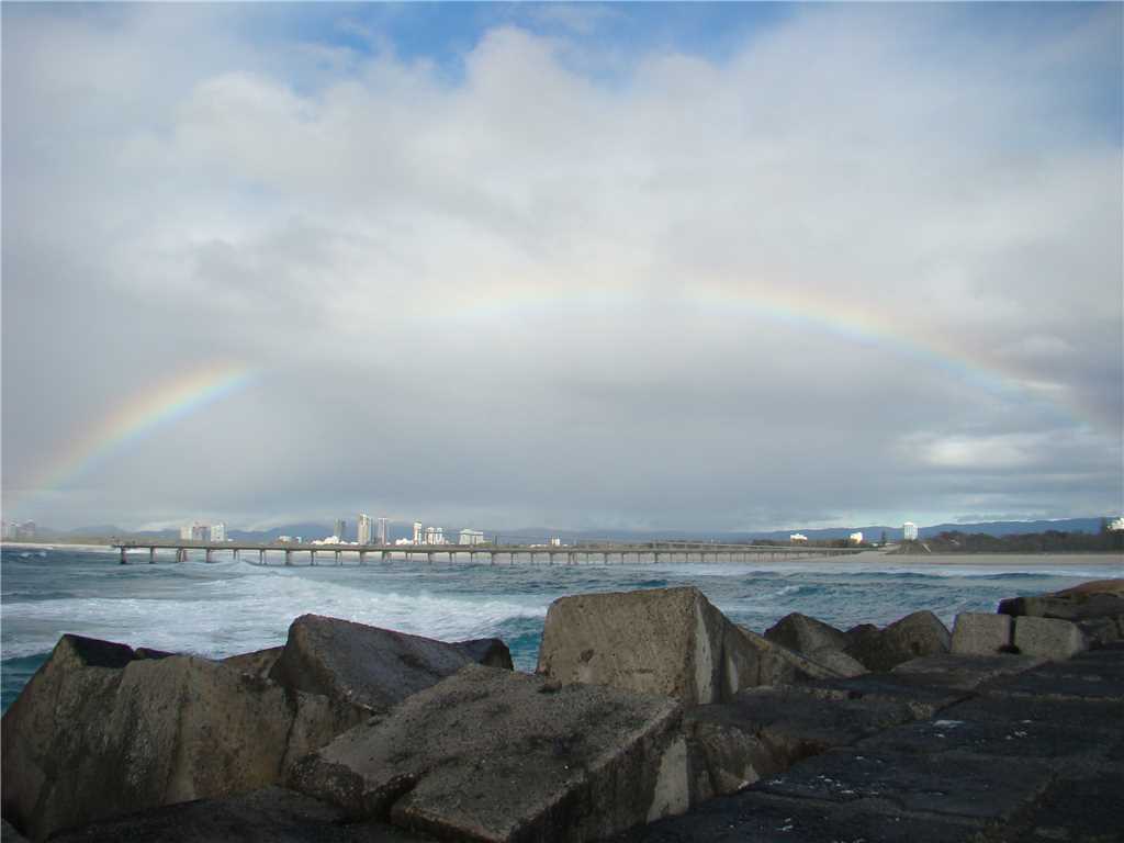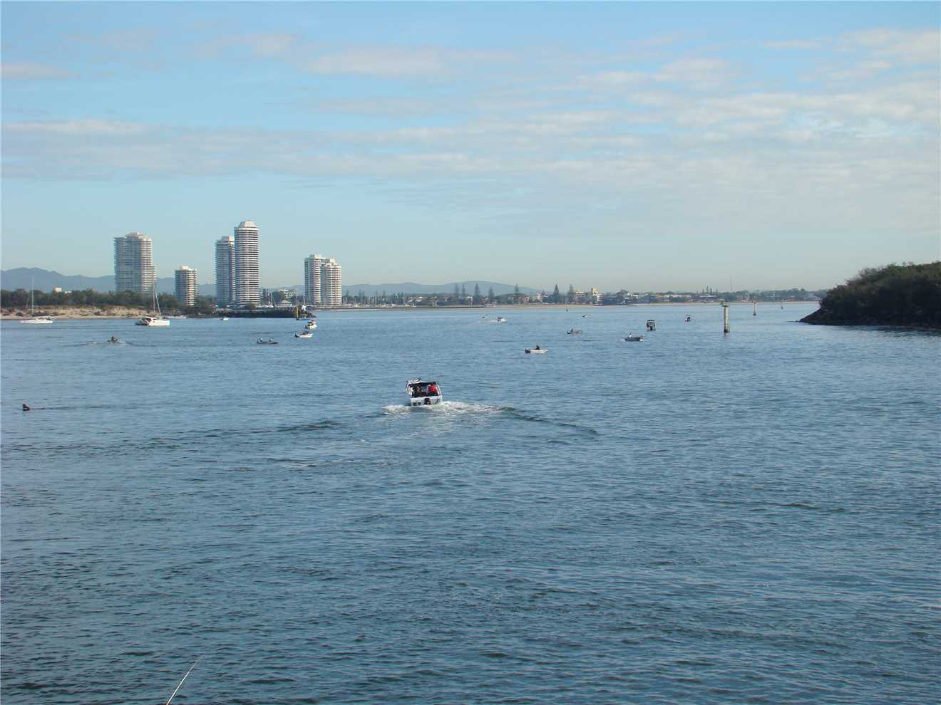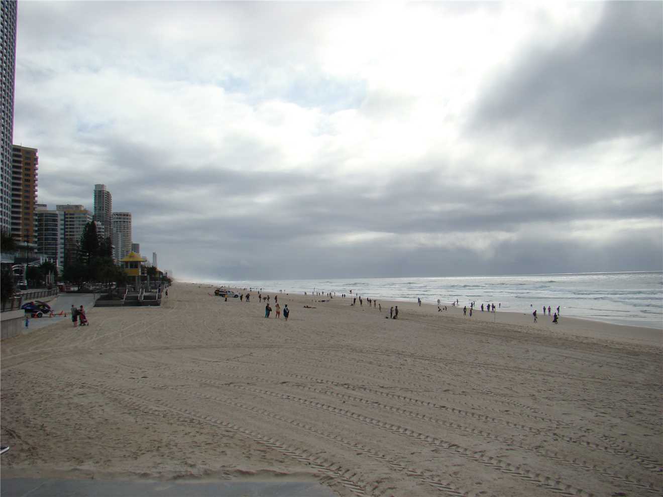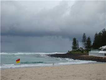 Back at camp at lunchtime, Marg was going to bugger about at camp, while I went riding, even though there were many rain squalls coming over the water. I rode south into a very strong headwind with gusts to 70kph and made my way to Burleigh Heads, where a big black front was making landfall. I headed to Robbie's cafe for a coffee and while there, the heavens opened up, SO I put on my wet weather gear and with the wind blowing me homeward, it was a very pleasant ride, even though, it was raining, unlike Melbourne, it was warm riding in the rain. I still rode to the Spit and it was very rough. Due to the strong wind, I didn't ride to Lands End and proceeded from the Spit directly back to camp.