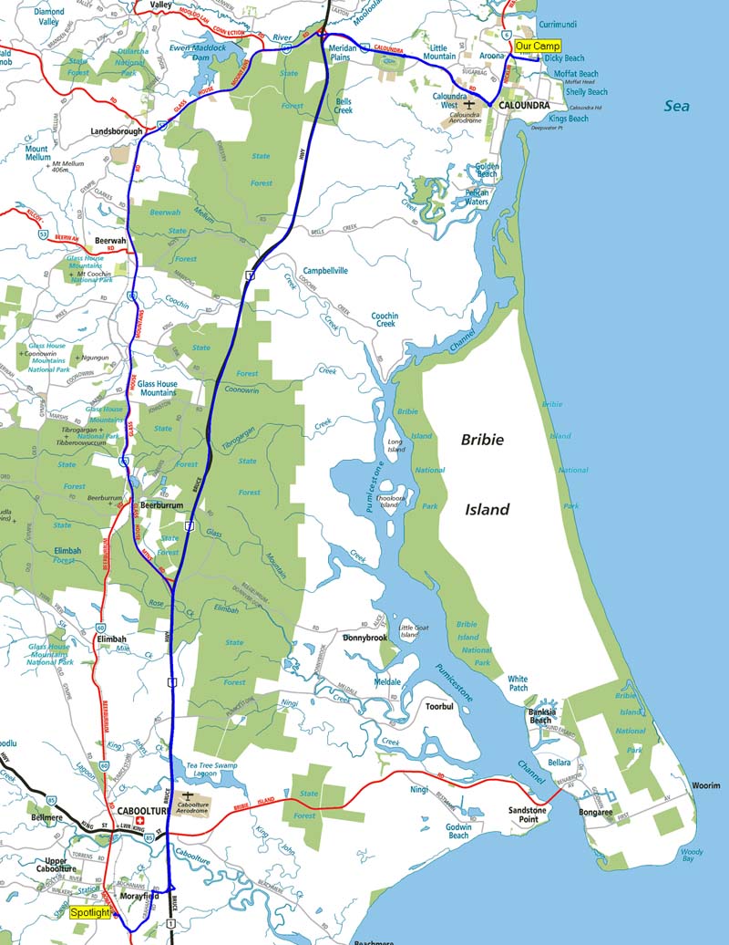 Our route to Spotlight at Morayfield and back to camp via Steve Irwin Way - 114kms round trip.