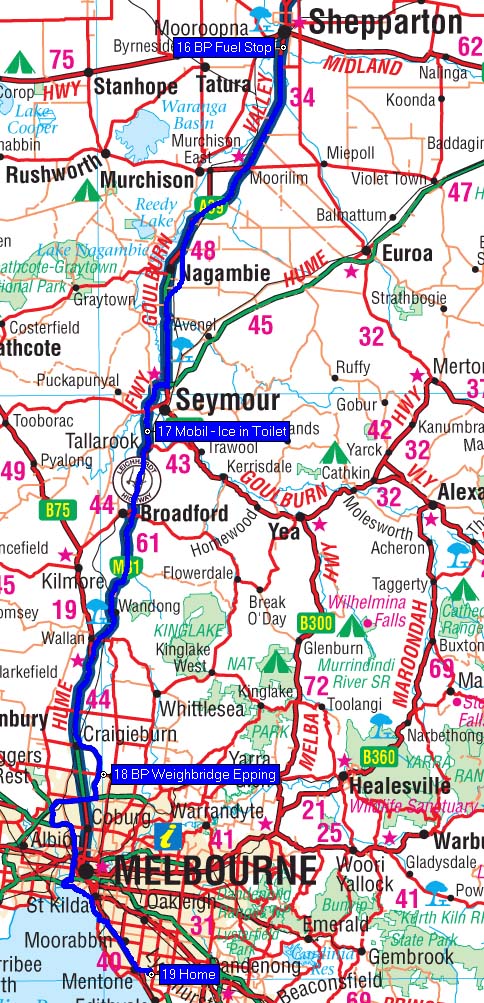 We woke about 6:00am. We can't leave until 7:30am ish so we miss the peak traffic. We watched Kochie's Sunrise and on the internet and packed up and left at 7:56am. Our first stop was at the Seymour Service Centre (8:57am) where I bought a bag of ice for the 'shitter' (the ice cleans the crap off the tank), our next and final stop was the BP Cooper Rd, Epping (9:55am) which had a public weighbridge, so I weighed ourselves 5,600kgs compared to when we left we weighed