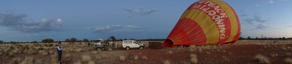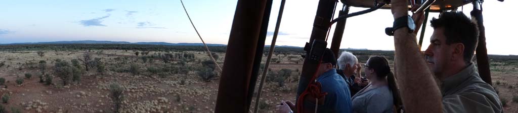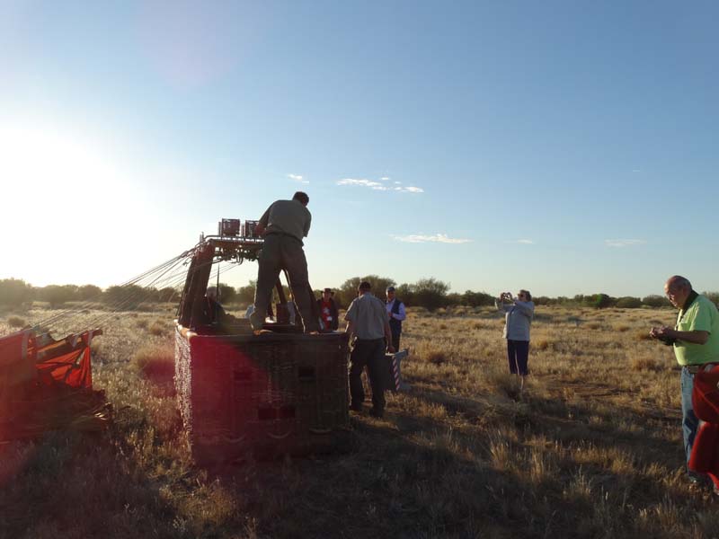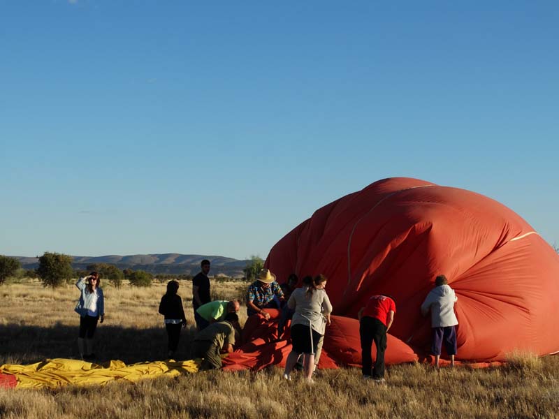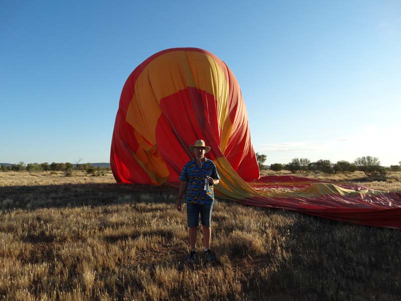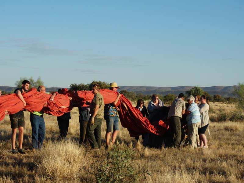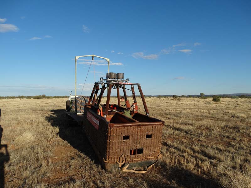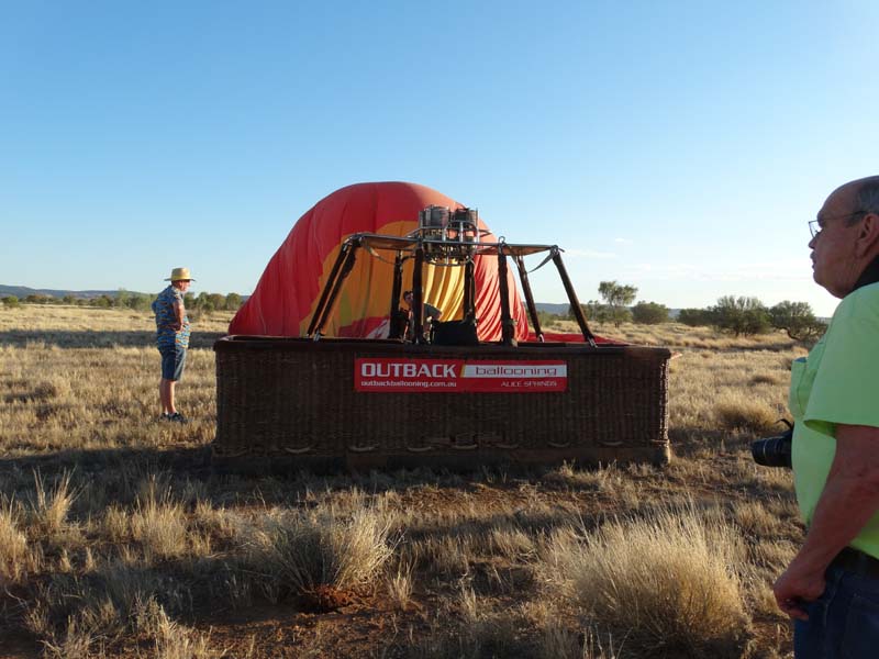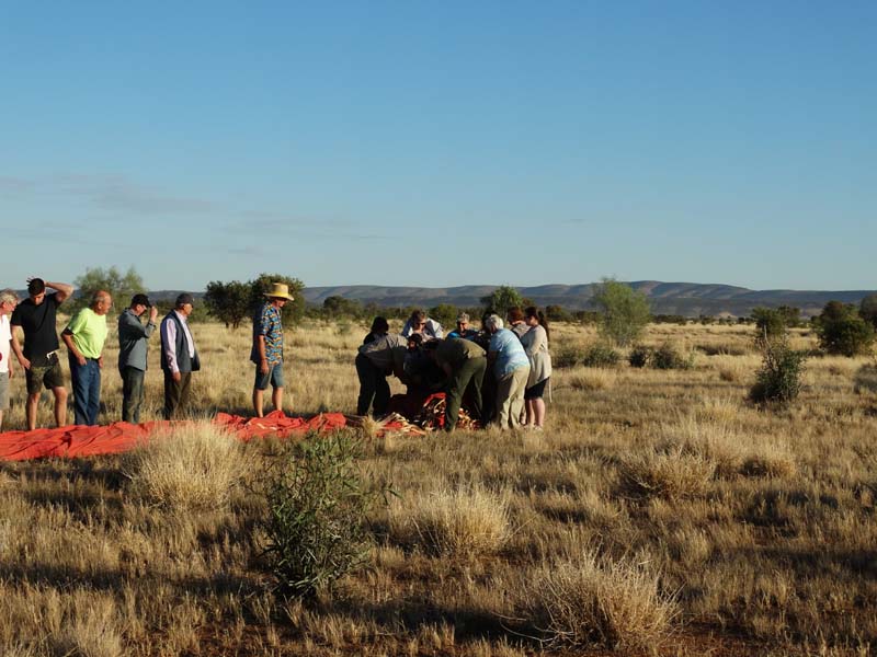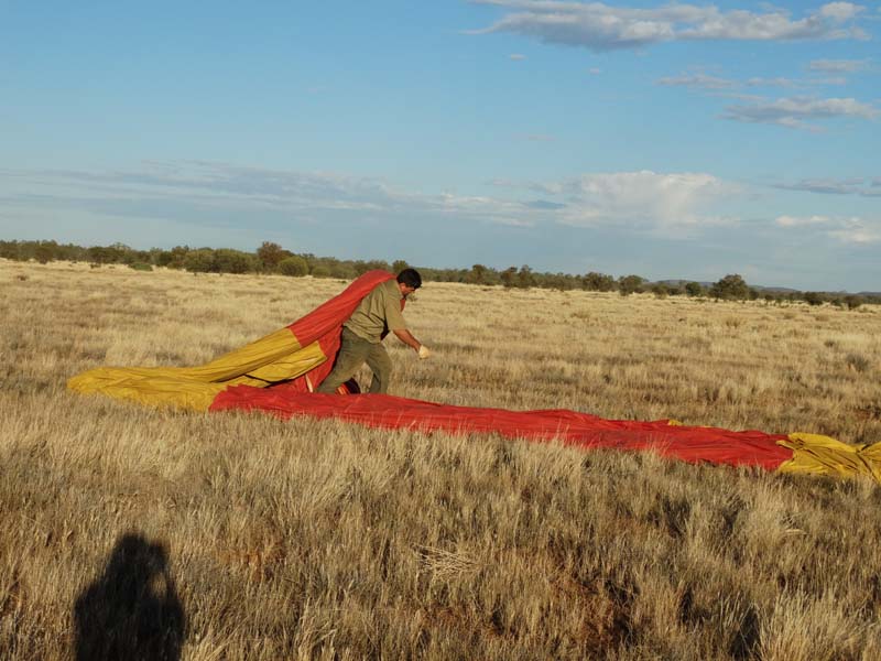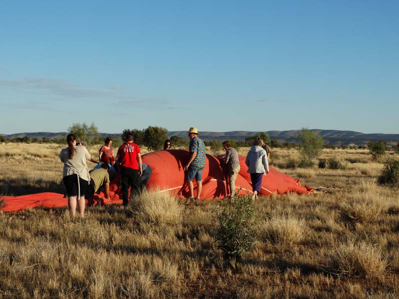 and the Alice Springs airport. We got to 300 feet cruising altitude and it was sensational. We spotted a few kangaroos. After 30 plus minutes, Jason picked an area to land and guided John and Duncan there. The landing was good, the basket bounced twice and then we were stopped and upright. Once we are stationary, Jason pulls a rope that opens the top and the balloon starts deflating. Then it is all hands on deck to fold and pack the balloon away.