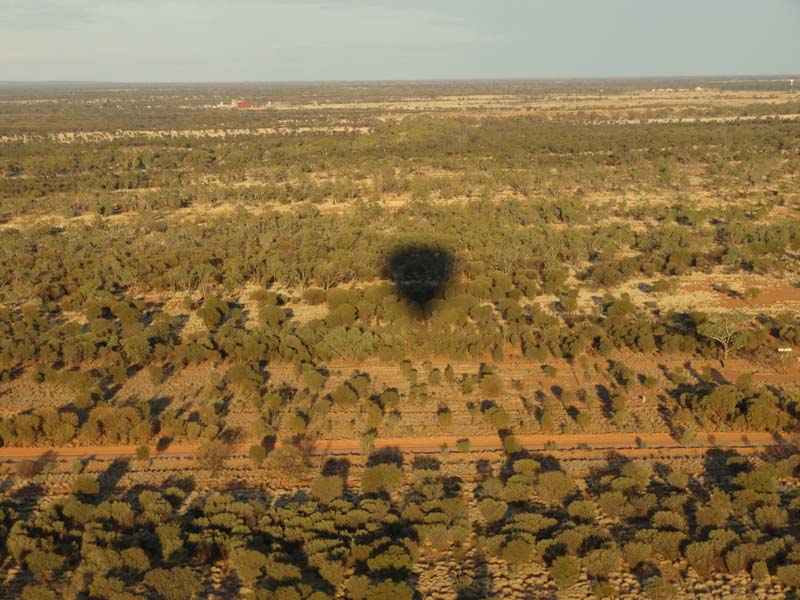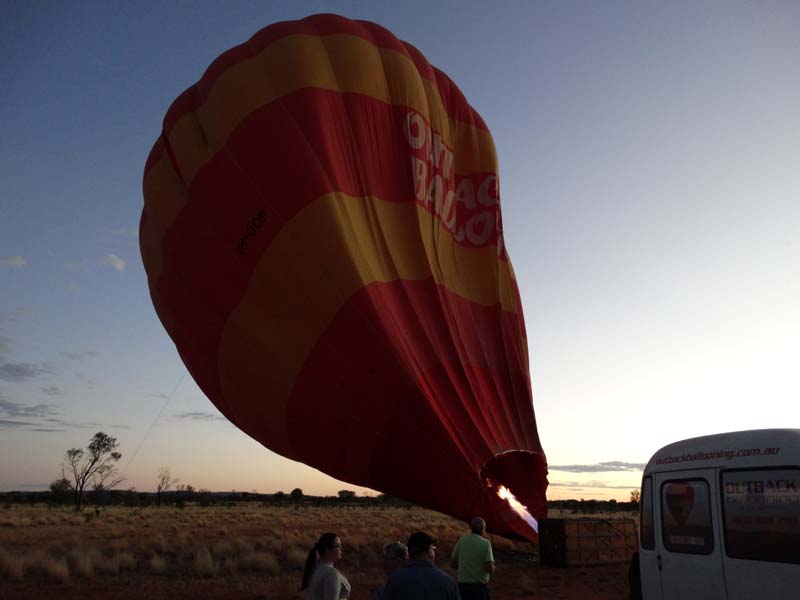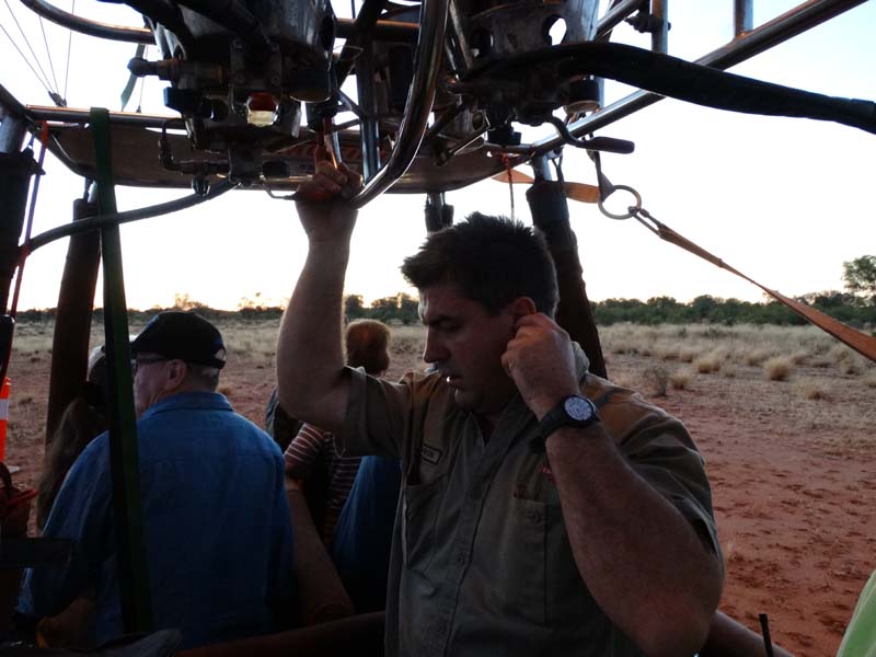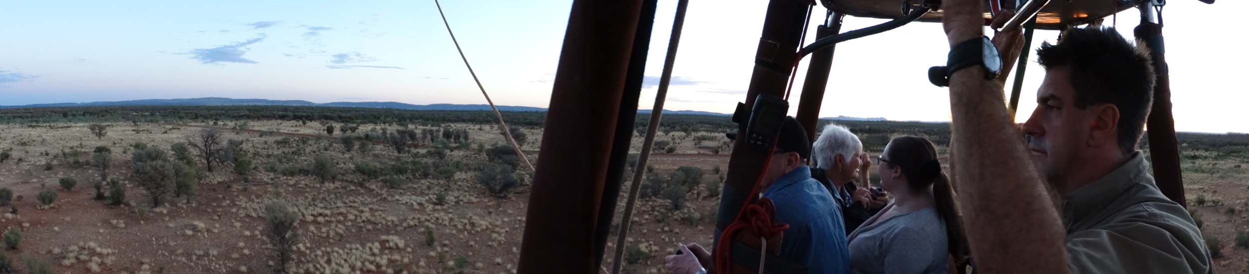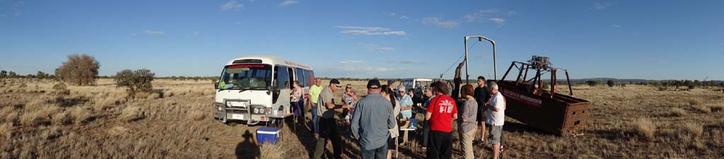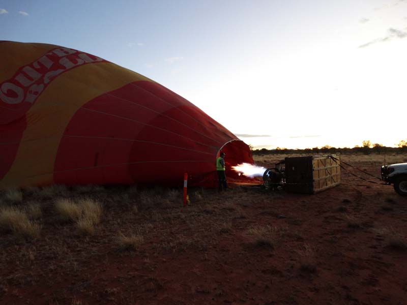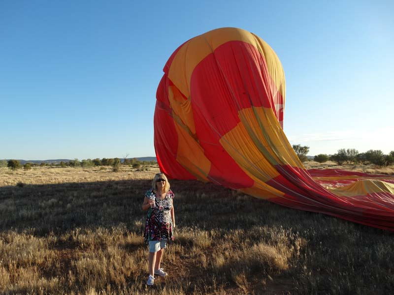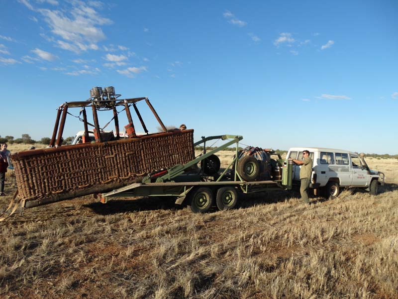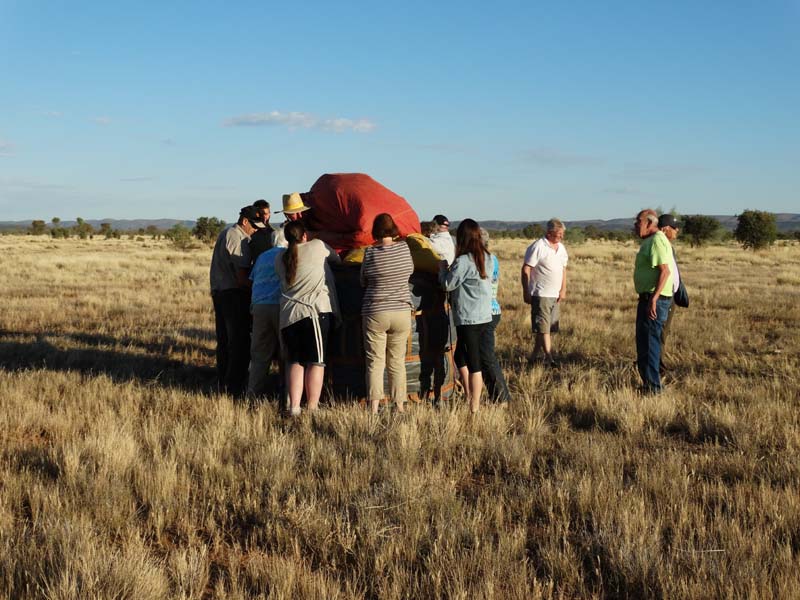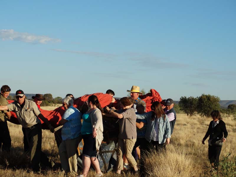 and the Alice Springs airport. We got to 300 feet cruising altitude and it was sensational. We spotted a few kangaroos. After 30 plus minutes, Jason picked an area to land and guided John and Duncan there. The landing was good, the basket bounced twice and then we were stopped and upright. Once we are stationary, Jason pulls a rope that opens the top and the balloon starts deflating. Then it is all hands on deck to fold and pack the balloon away.