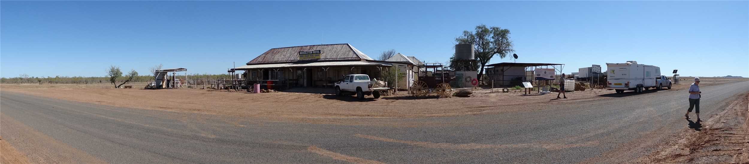 The Birdsville Hotel with Airport. the Airport is across the road, there is a gate in the fence.