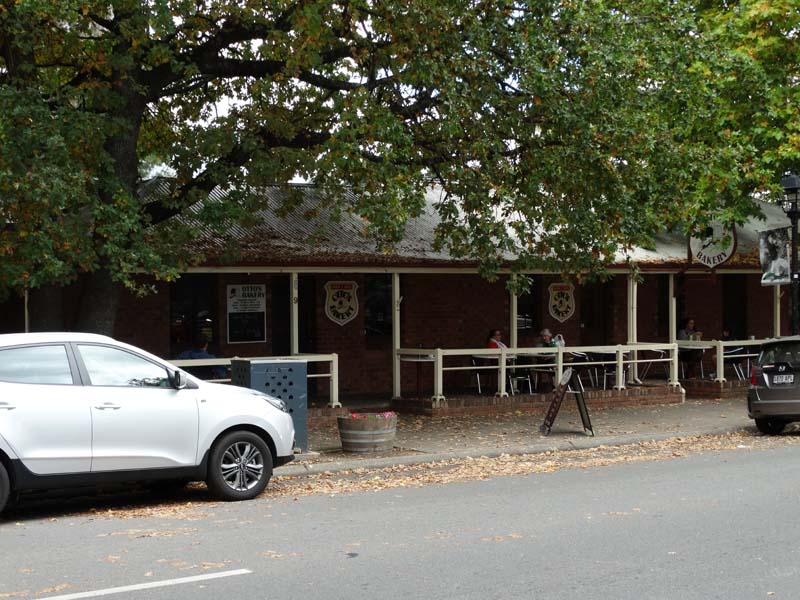After 89kms, we stopped at our 1st Rest Stop, arrived at 9:35am. Next stop was at the Quarantine bin (55kms at 10:24am), where we threw out a tomato and 2 bananas. As we drive, we listen to Richard Fidler's Conversations, I downloaded 100s of his podcasts. They are brilliant and keep me awake while driving. When we get sick of Richard, we have over 7,500 songs on our iPod to play and I sing along with them. Marg tries to sleep. After the Quarantine bin, Marg had a sleep and I was interested in Richard's guests. SO I drove 185kms non stop, I felt OK, but in future, I will stick to a lower number. Next stop was at Tailem Bend (185km at 12:38pm), where there was a Bakery next door to the BP, so while I filled up the mighty Navara, Marg walked next door and ordered pies and coffee, I parked out the front, (see photos) and we sat out the front of the Bakery and had lunch in the sun. It was quite pleasant. After lunch, we had an easy 73kms to Hahndorf arriving at 2:01pm.