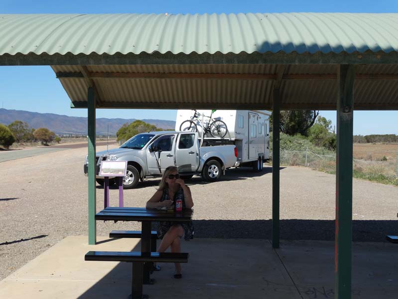 past the Port Pirie By pass at 12:37pm. Just down the road we stopped at another Rest Stop and had lunch (12:56pm), which were Marg's world famous special chicken sangas. They were YUMMA.